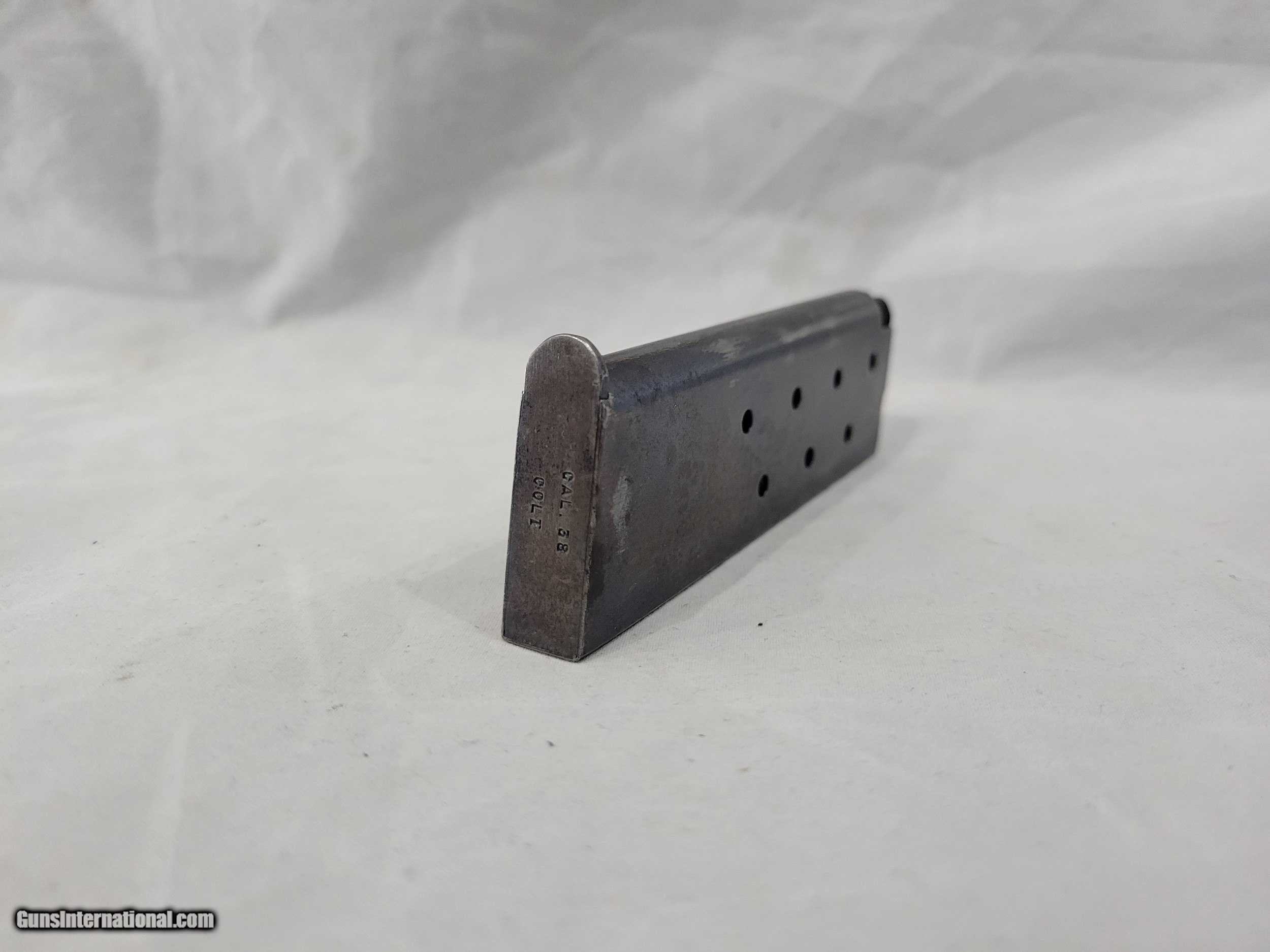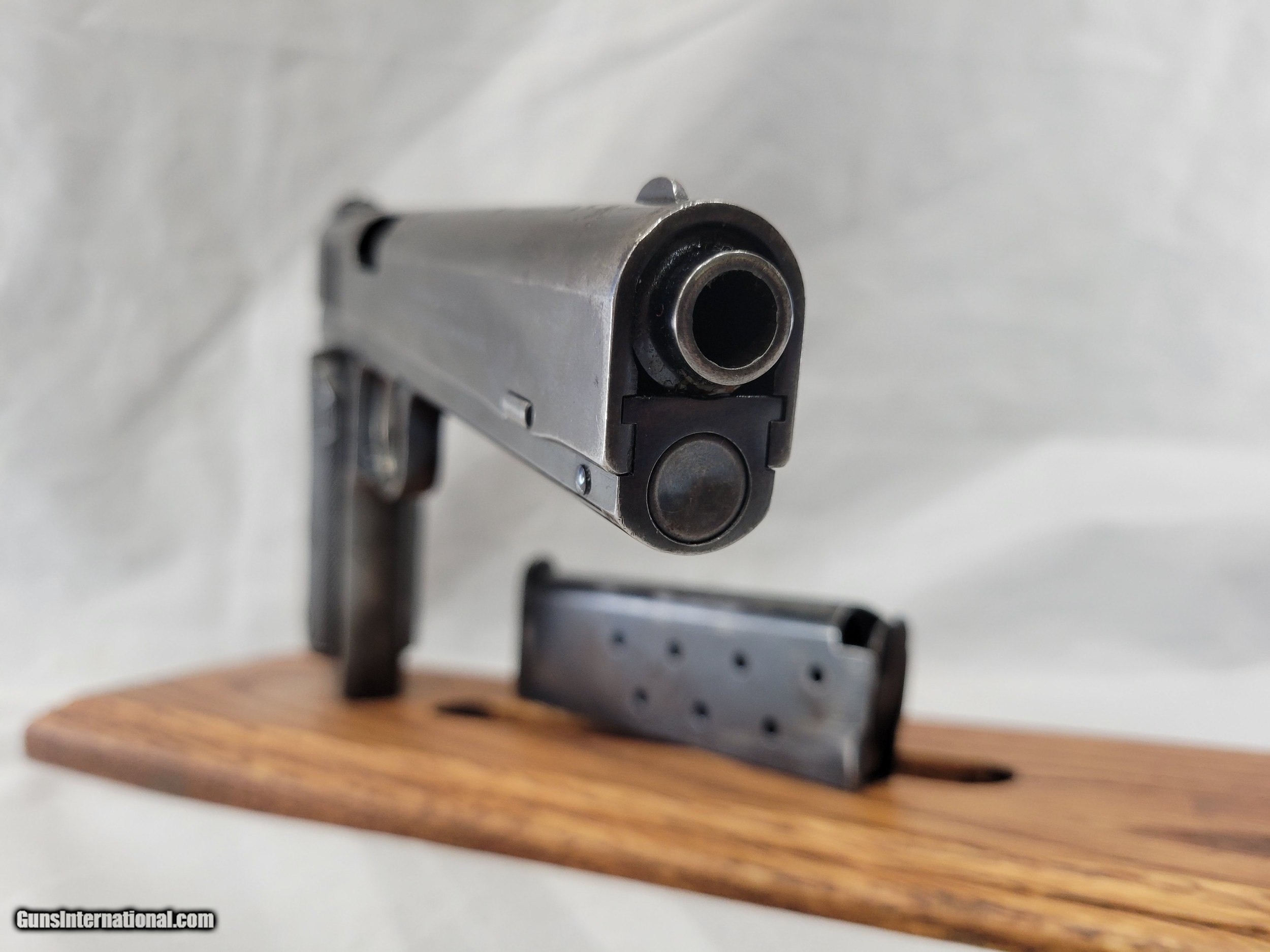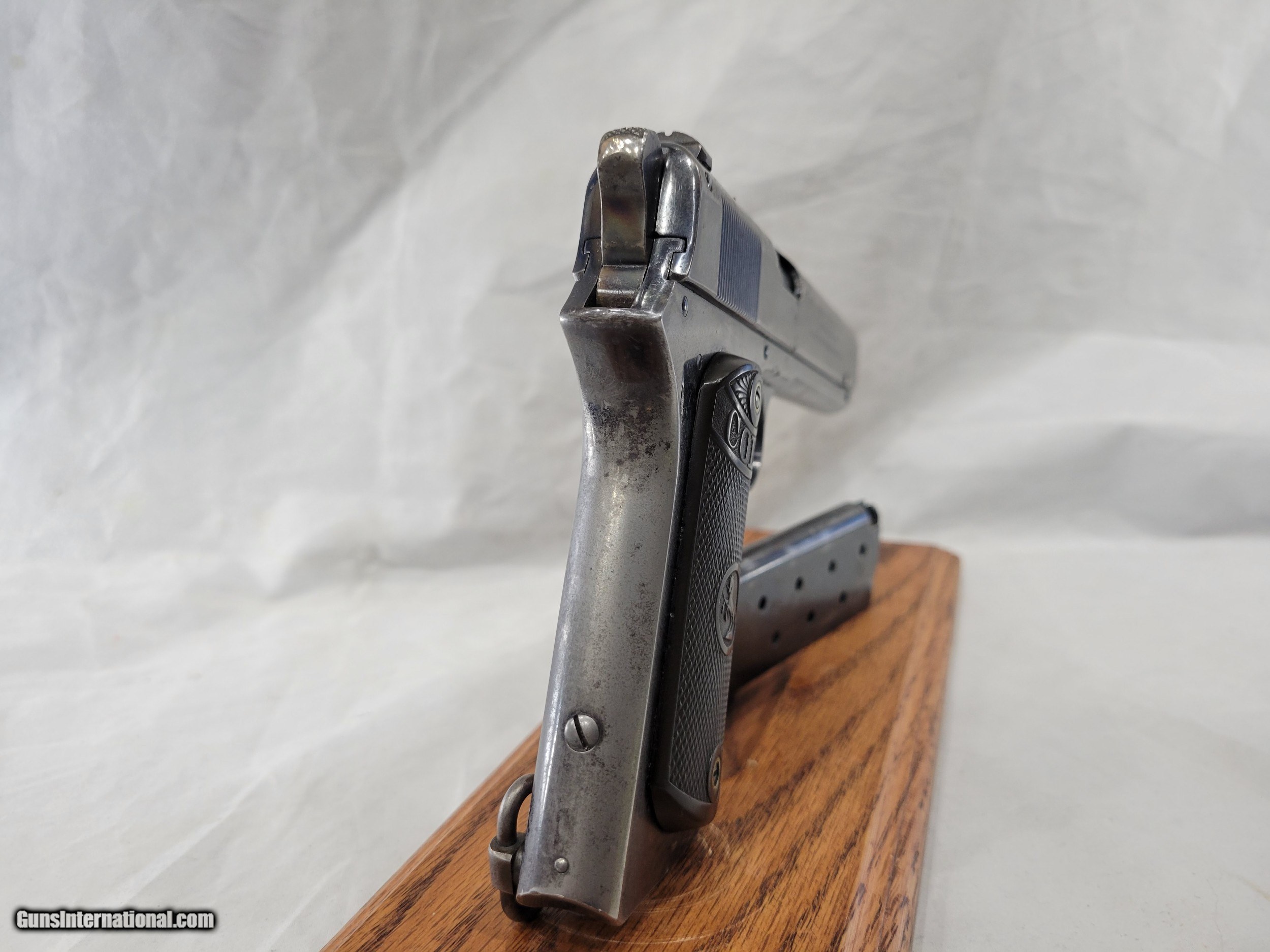 Description: INV. 10889 COLT AUTOMATIC MDL. 1902, "LONG SLIDE" CAL. .38 ACP RIMLESS, SER.11020. ONE OF BROWNING'S EARLY PREDECESSORS OF THE ICONIC 1911. THIS HISTORIC 122 YEAR OLD FIREARM HAS RETAINED ABOUT 65-70% OF THE ORIGINAL COLT HIGH POLISH BLUE. THE BULK OF THE LOSS IS FROM TONING OF THE GRIP STRAPS, THE USUAL SHARP EDGE SILVERING AND SCATTERED PINPRICKS ON THE SLIDE MOSTLY DUE TO HOLSTER WEAR. ALL PARTS ARE PROPER FOR THE GUN. THE GRIP PANELS AND GRIP SCREWS ARE PERFECT. THE SLIDE RAILS, BOLT FACE AND FEED RAMP SHOW MODEST USE. THE BORE IS SUPER, MIRROR BRIGHT WITH RAZOR SHARP RIFLING. IT COMES WITH ONE ORIGINAL .38 RIMLESS MAGAZINE. THIS EARLY COLT WOULD BE A GREAT ADDITION TO ANY COLLECTION AS ONE OF THE VERY EARLY PIONNEERS OF AMERICA'S MOST FAMOUS AUTO PISTOL EVOLUTION. MODESTLY PRICED....$2295*** *** 100% 0F THE GUN'S PRICE IS SATISFACTION GURANTEED. To purchase this firearm or if you want to request more information contact us at: Email ckguns[at]ymail[dot]com Phone 201-512-0002 Cell 201-575-6838 FAX 201-215-4759 We accept most major credit cards. Prices shown are Discounted 3% for Cash or Check. The buyer must be familiar with all the laws governing the purchase and the ownership of firearms in their own city and state. The Yankee Armorer, Inc is not responsible for any failure to comply with or observe these laws. The Yankee Armorer, Inc will only ship after full payment and receipt of all required documents. Shipping: Add $35.00 for handguns, $45.00 for long guns. New Jersey buyers are subject to a 7% sales tax. The Yankee Armorer, Inc offers a 3 day inspection period with full refund upon return of intact firearm and in the original condition. The Yankee Armorer, Inc offers a no interest lay away program - 25% down; 25% in 30 days; 25% in 60 days; and full payment in 90 days. Any violation of this policy is subject to restocking and forfeiture of all payments. Any variation from this policy must be agreed to in advance. Unshipped Cancelled sales are subject to a 20% restocking fee. Be advised that all firearms sold by The Yankee Armorer, Inc. or the Gun Exchange, LLC (SELLER) are sold as collector’s items. They have not been fired or tested for safety and must be examined by a license gunsmith prior to use. By purchasing any item from the (SELLER), you are agreeing to hold the (SELLER) free from any damages or lawsuits of any nature. Any item left for transfer or storage will be charged to $25.00 per month, per item from the day of its receipt. Any variation from this policy must be agreed to in advance. Store hours 10:00 am to 5:00 pm Tuesday -Saturday. It's always best to call for appointment. Store 201-512-0002, cell 201-575-6838. SOLD |
