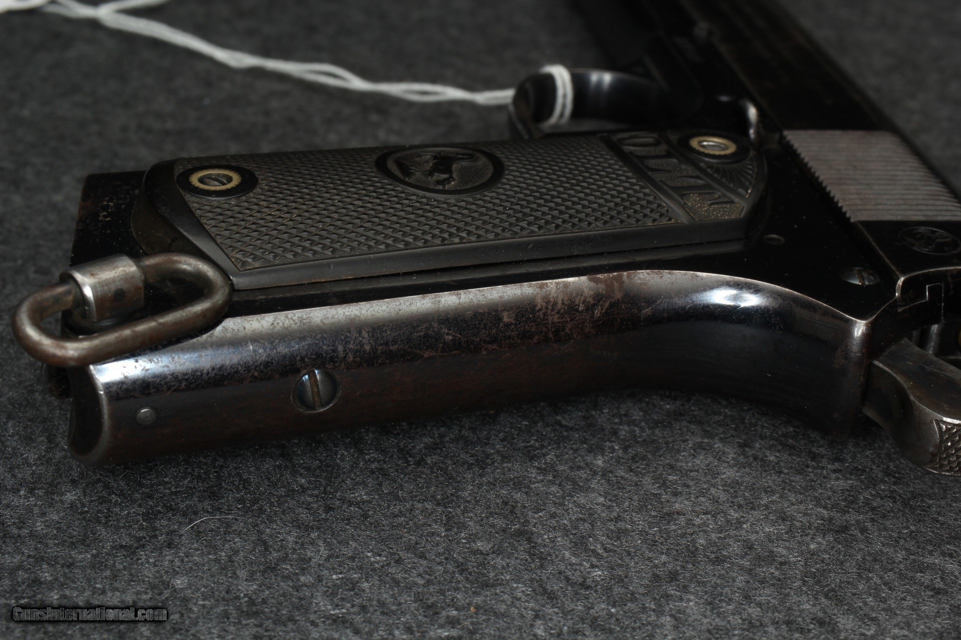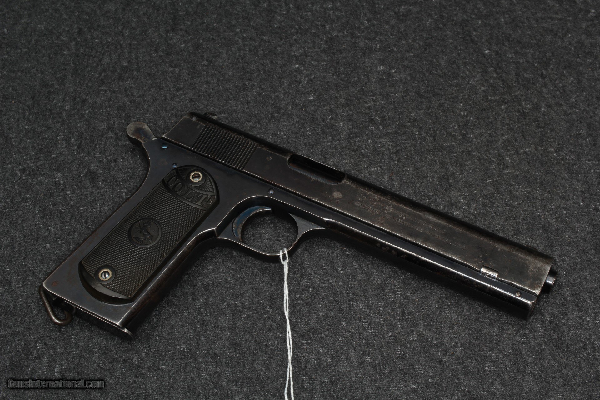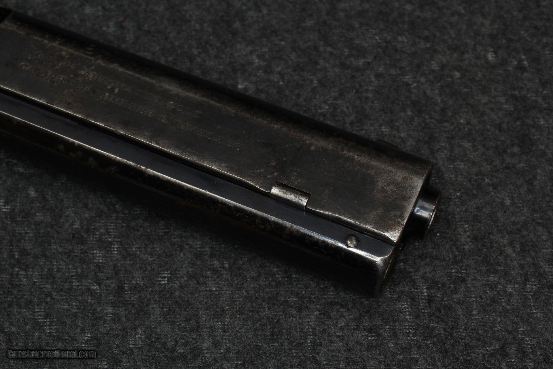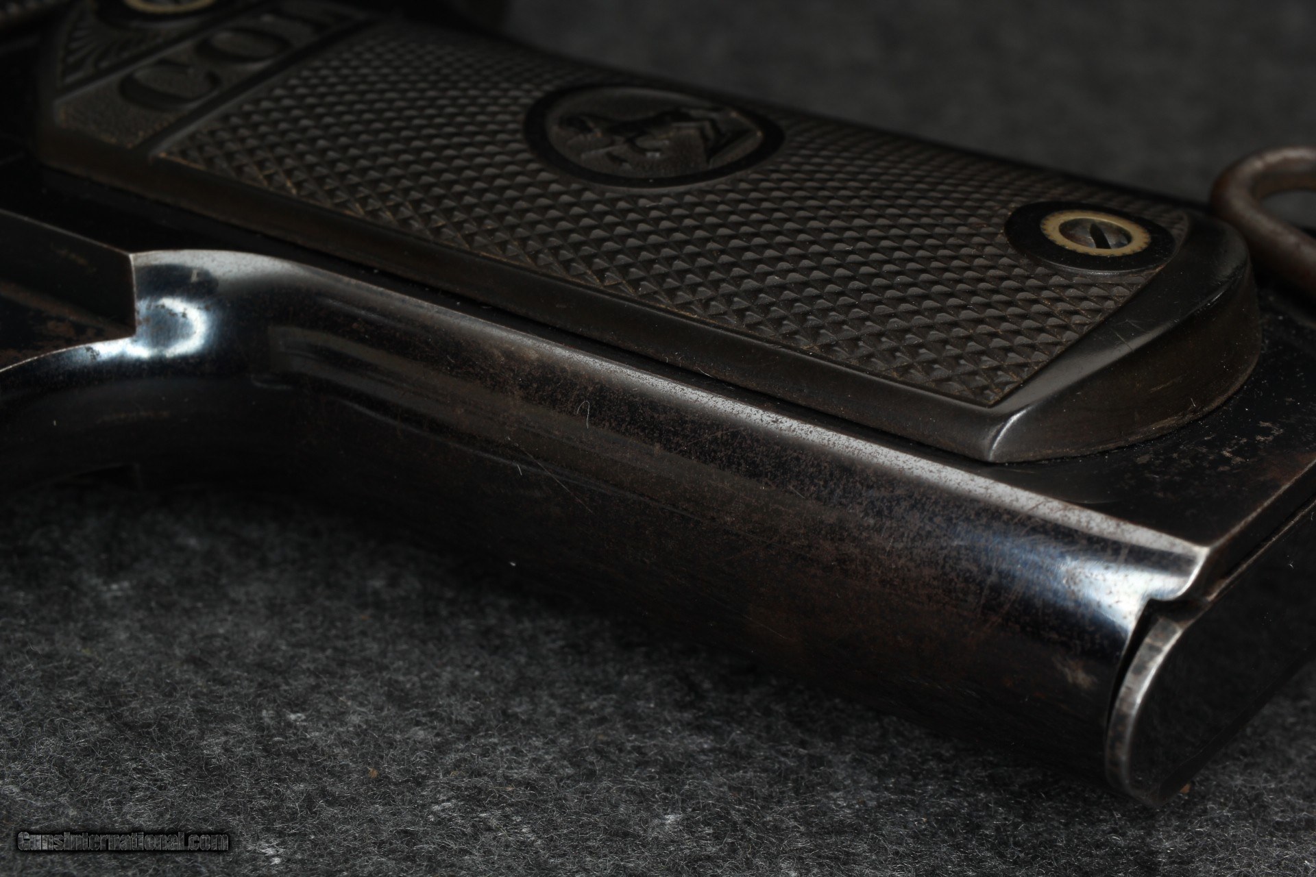 Description: 38 acp, serial number 320XX. Mfg 1909. Overall in very good condition, excellent mechanical condition. Factory bright blue 40% on slide, 80% on frame. Slide shows areas of pitting and blue wear, heavier at muzzle. Frame shows slightly more blue wear and pitting, areas of light scratches. Bore shows light pitting, very shootable. Correct original magazine. More photos on request. Please add $45.00 for shipping and insurance. SOLD Curio/Relic: Yes Handgun Caliber: .38 Auto (.38 ACP) |