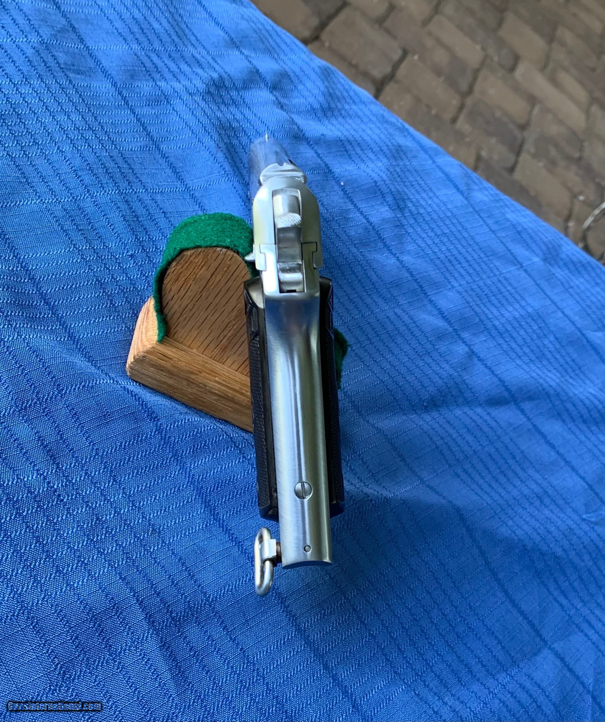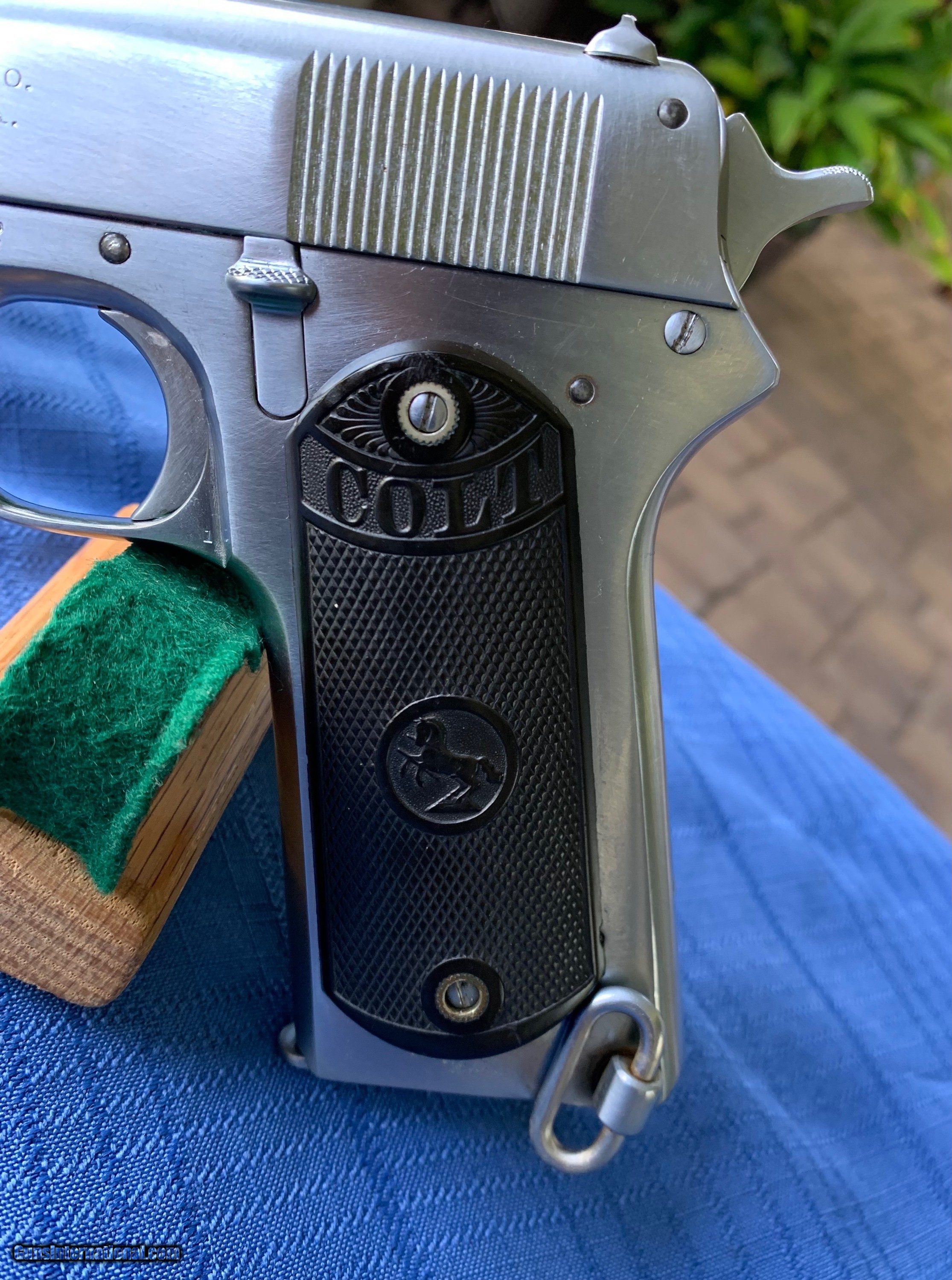 Description: Here's a very nice Colt Model 1902 in 38 auto ! Long barrel . Serial number 35,622. Gun has been re nickeled ! Bore and mechanics are in excellent condition ! Gun is in excellent working condition . Gun comes with original sights . Gun has original grips in excellent condition! This is a Military Model and comes with original lanyard. Gun comes with 1 original Colt 38 Auto marked magazine . Overall a Handsome looking Colt Model 1902 Military Model! Please review my photos and email me with any questions ? 3 day inspection as allways . Thank you for looking , Little Jo SOLD Antique: Yes Handgun Caliber: .38 Auto (.38 ACP) Manufacturer: Colt Model: 1902 Serial Number: 35,622 Barrel Length: Long Condition: Fine |