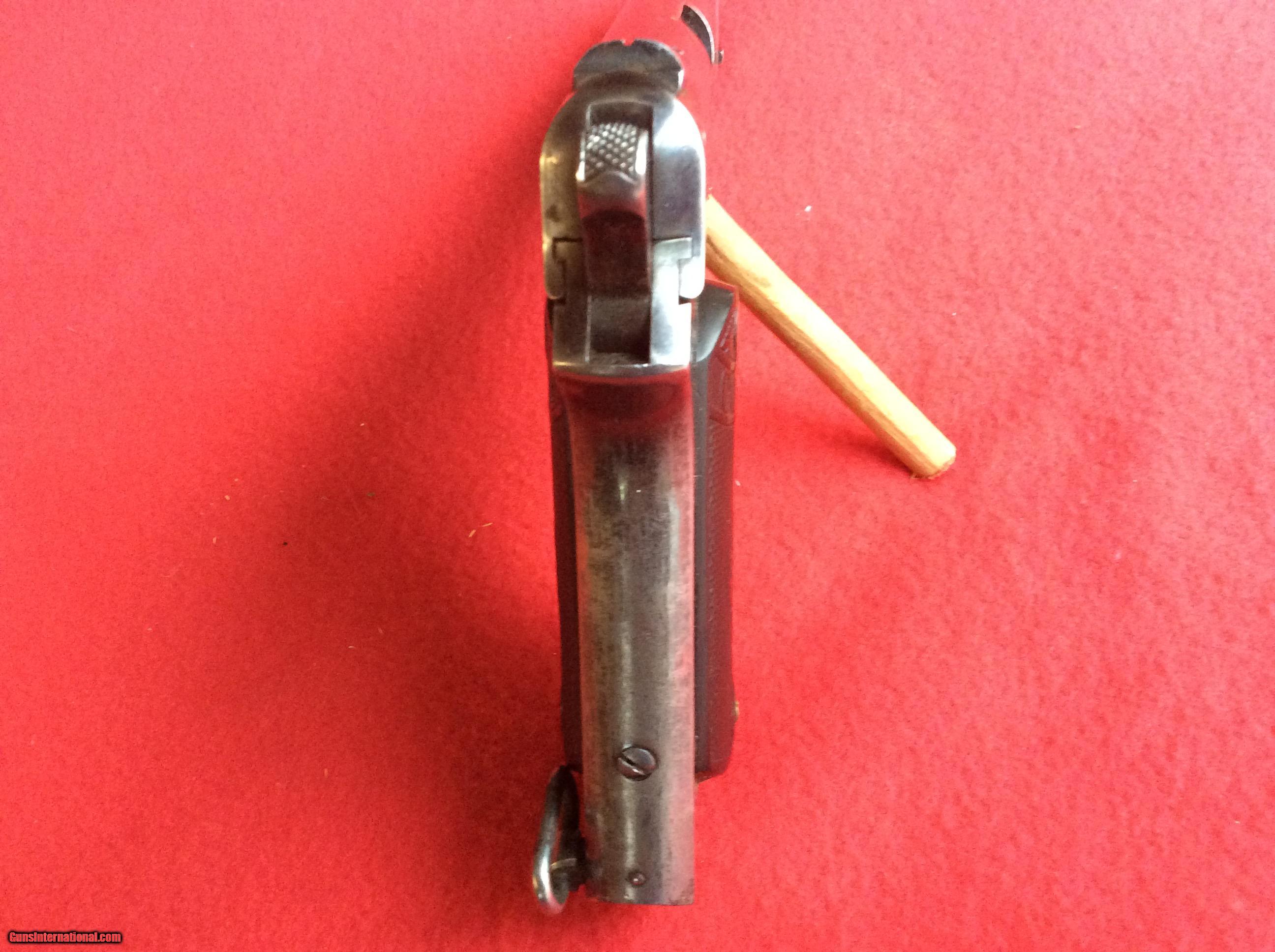 Description: For your viewing is a Colt Model 1902 Millitary pistol with a 6" barrel in 38 ACP CAL. Pistol shows use, but retains much of it's original blue. +. Fire blue on the trigger. Grips are in excellent condition and comes with a original clip dated Sept. 9, 1894. Barrel is dark but strong rifling. serial no. 14674. Strong rampent colt on left side of slide. No letter on this pistol. Also included is a 1918 Millitary holster that has been with the pistol, a very long time. call for more info etc. Thanks for looking SOLD |