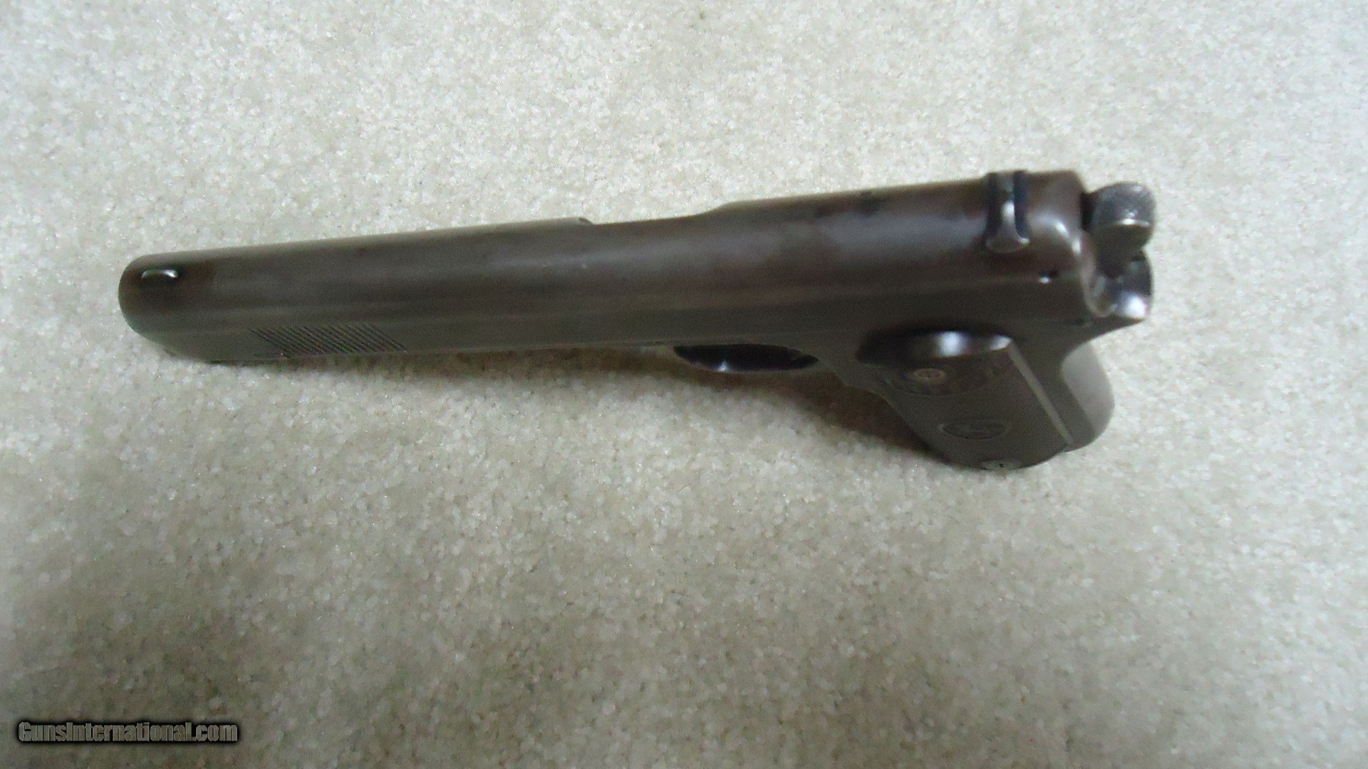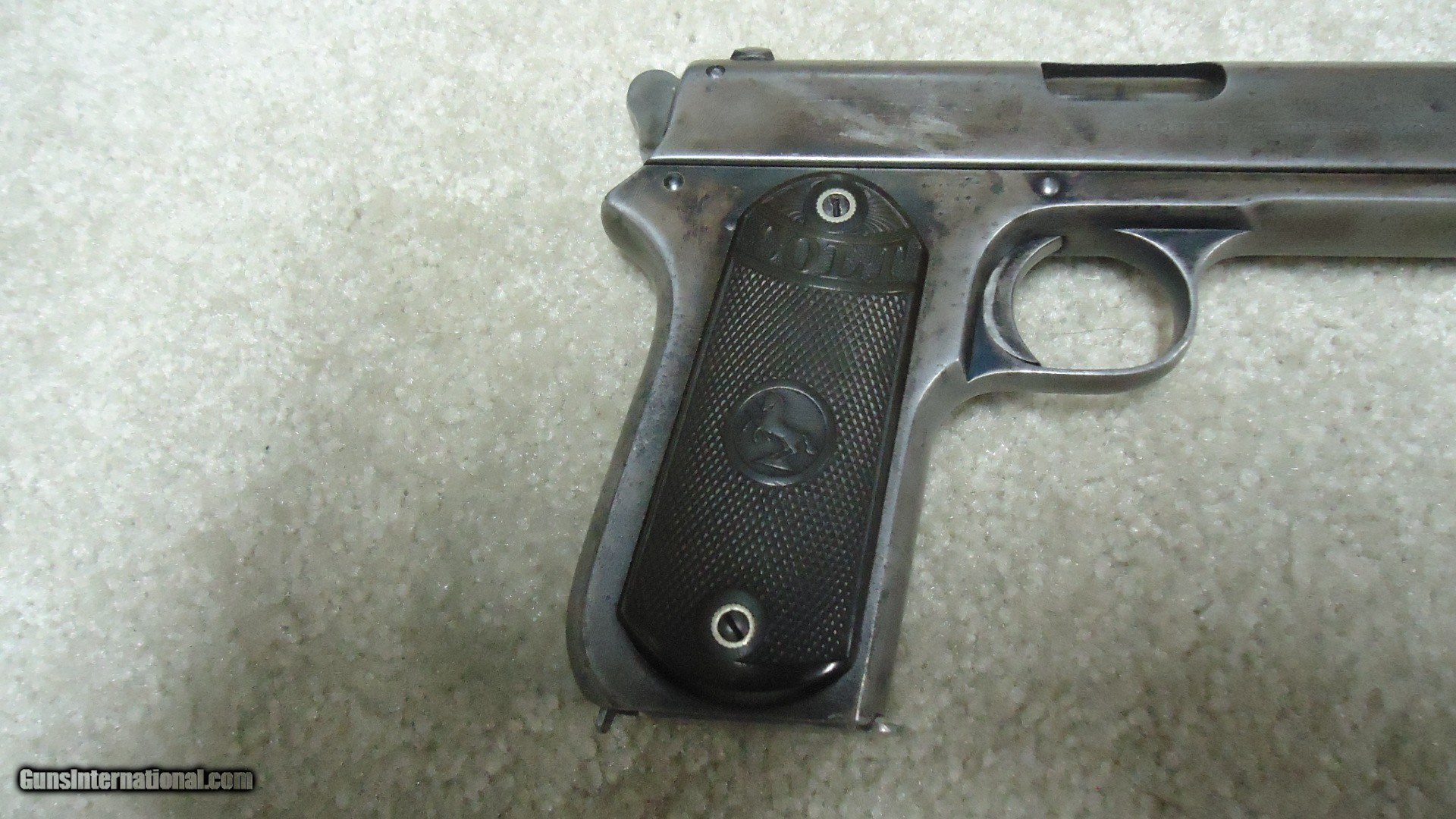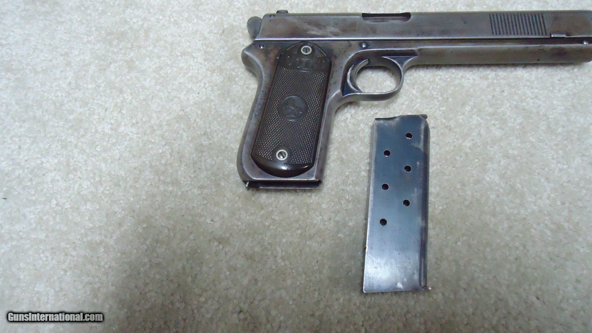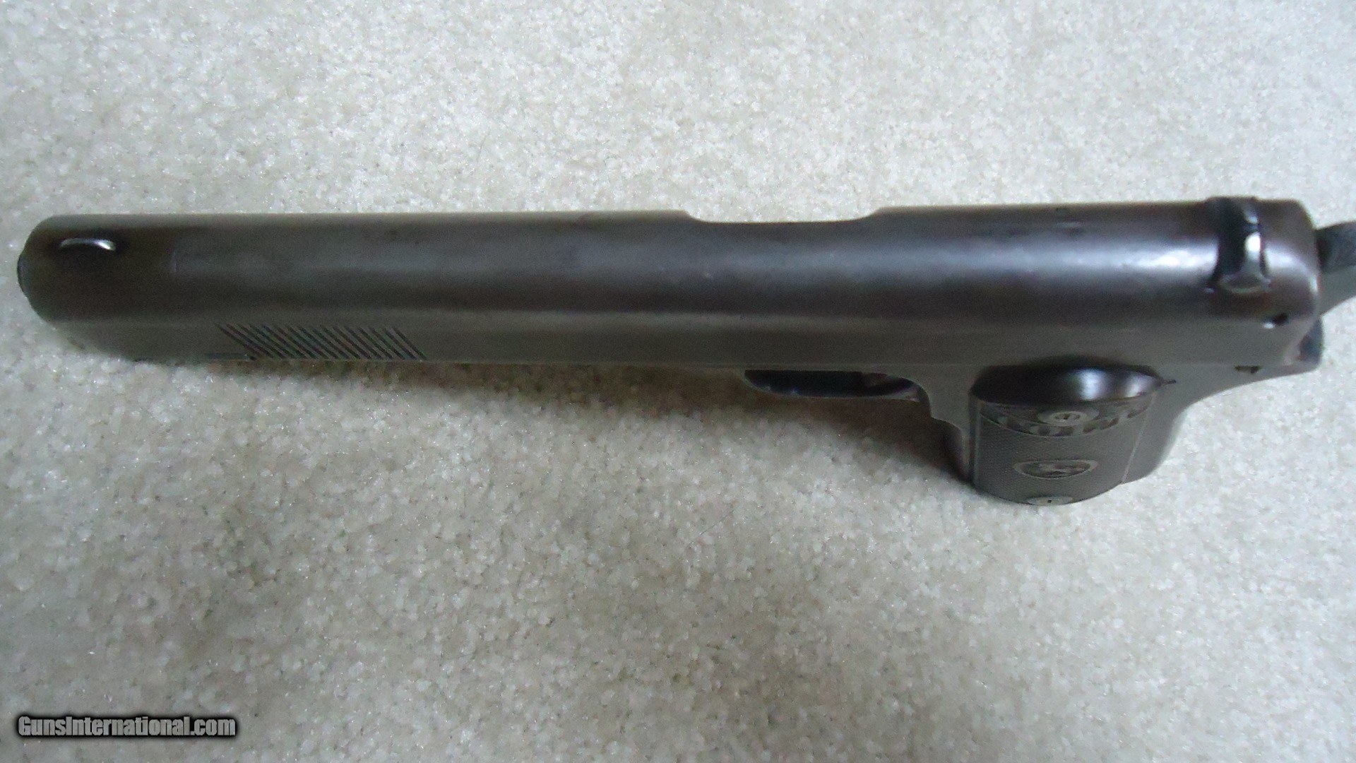 Description: HISTORIC, DOCUMENTED VERY EARLY MODEL 1902 SPORTING AUTO PISTOL, .38 ACP, #8XXX, SHIPPED TO BROWNING BROTHERS, OGDEN, UTAH ON MAY 13, 1905! This was a very limited production very early full size Colt automatic pistol that followed the first auto, the Colt 1900, and only about 7,500 were made from 1903-1908. The 1902 Military Model was made in far more numbers and lasted from 1902-1929. This example has the correct "BROWNING'S PATENTS" of 1897 and 1902 on the slide and retains the correct magazine with the patent date of 1884 stamping on the bottom. This pistol is listed by serial number in the GOVERNMENT MODELS book by Goddard as having been shipped on may 13, 1905 to Browning Brothers who were located in Ogden, Utah. Obviously, John Browning designed these early Colt auto pistols and it is very possible he actually handled this exact pistol which was sold from his family shop 117 years ago. Additionally, this is a documented early western shipped Colt. In 1905 Utah most Colt buyers who wanted a holster sized handgun were choosing Single Action Armies and Bisleys or perhaps a big New Service double action revolver. It would have been a very savvy ahead-of-his-time shootist to choose one of the new-fangled auto loading pistols designed by Jonathan Browning and sold by Colt! This is an honest example that has seen western usage, but is solid and fully functional. The metal surfaces retain little original blue except in the more protected areas- around the grips, above the trigger guard and on the frame beneath the slide. Sights are original and unaltered. This is an early model with the slide serrations at the FRONT of the slide only. The round stub hammer retains traces of light case color on the sides. Grips are fine and not chipped or cracked. Mechanically excellent and tight with excellent bore. Interestingly, there are no safeties or slide catches/releases on this early auto. Just a half-cock on the hammer. A wonderful piece of western history directly associated with John Browning himself! SOLD Curio/Relic: Yes Manufacturer: COLT Model: 1902 SPORTING AUTO Serial Number: 8XXX Condition: VG |