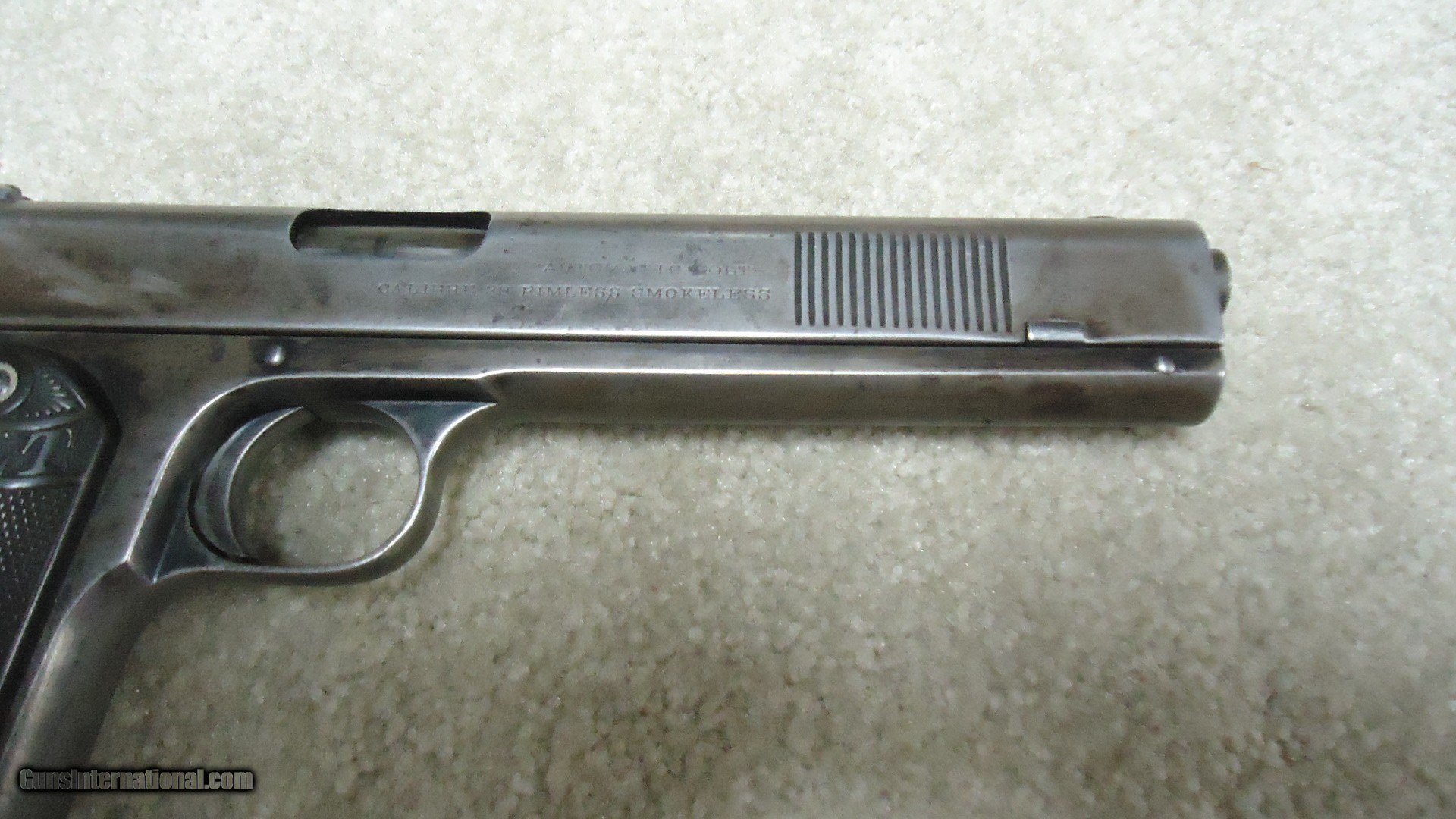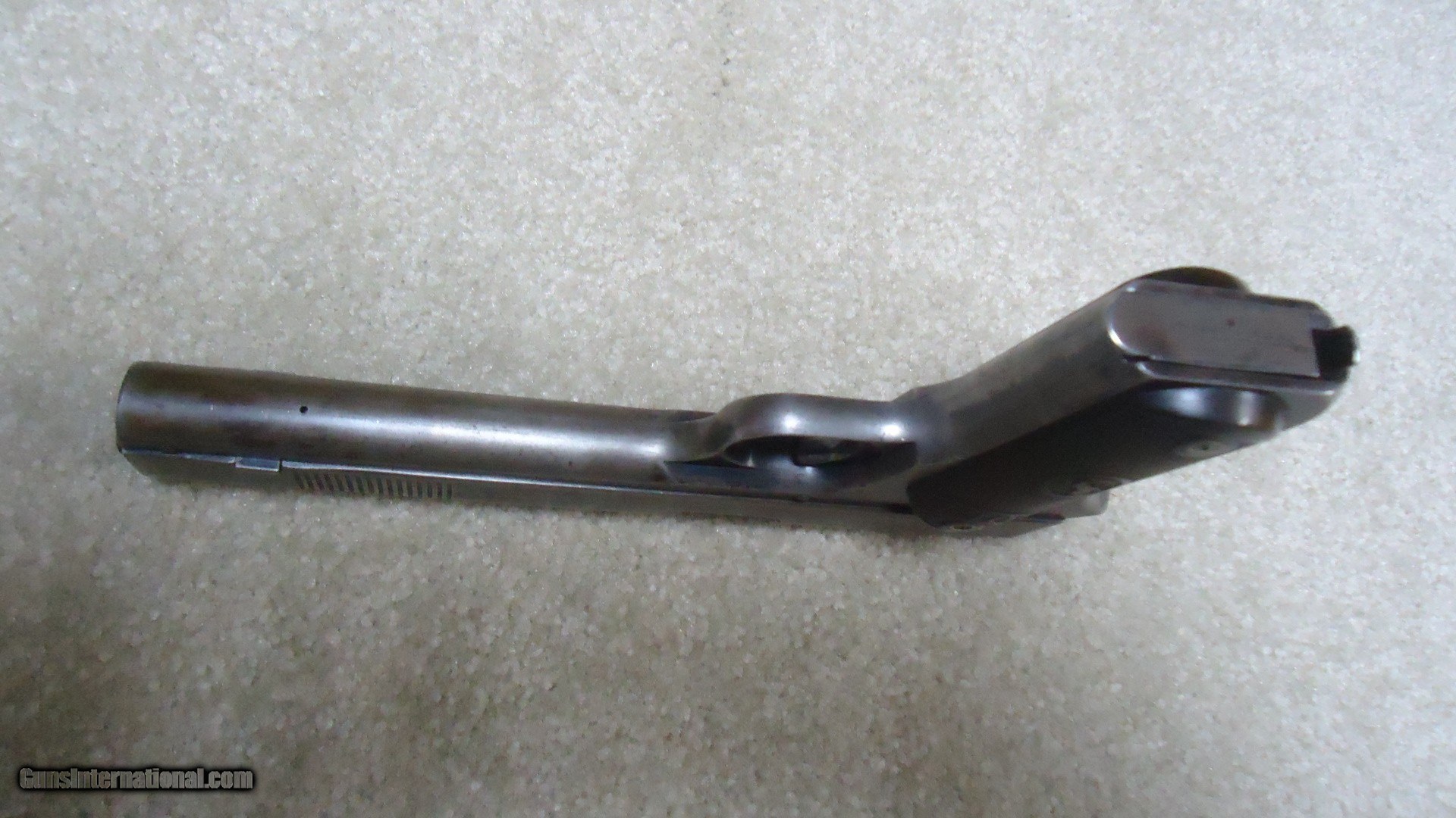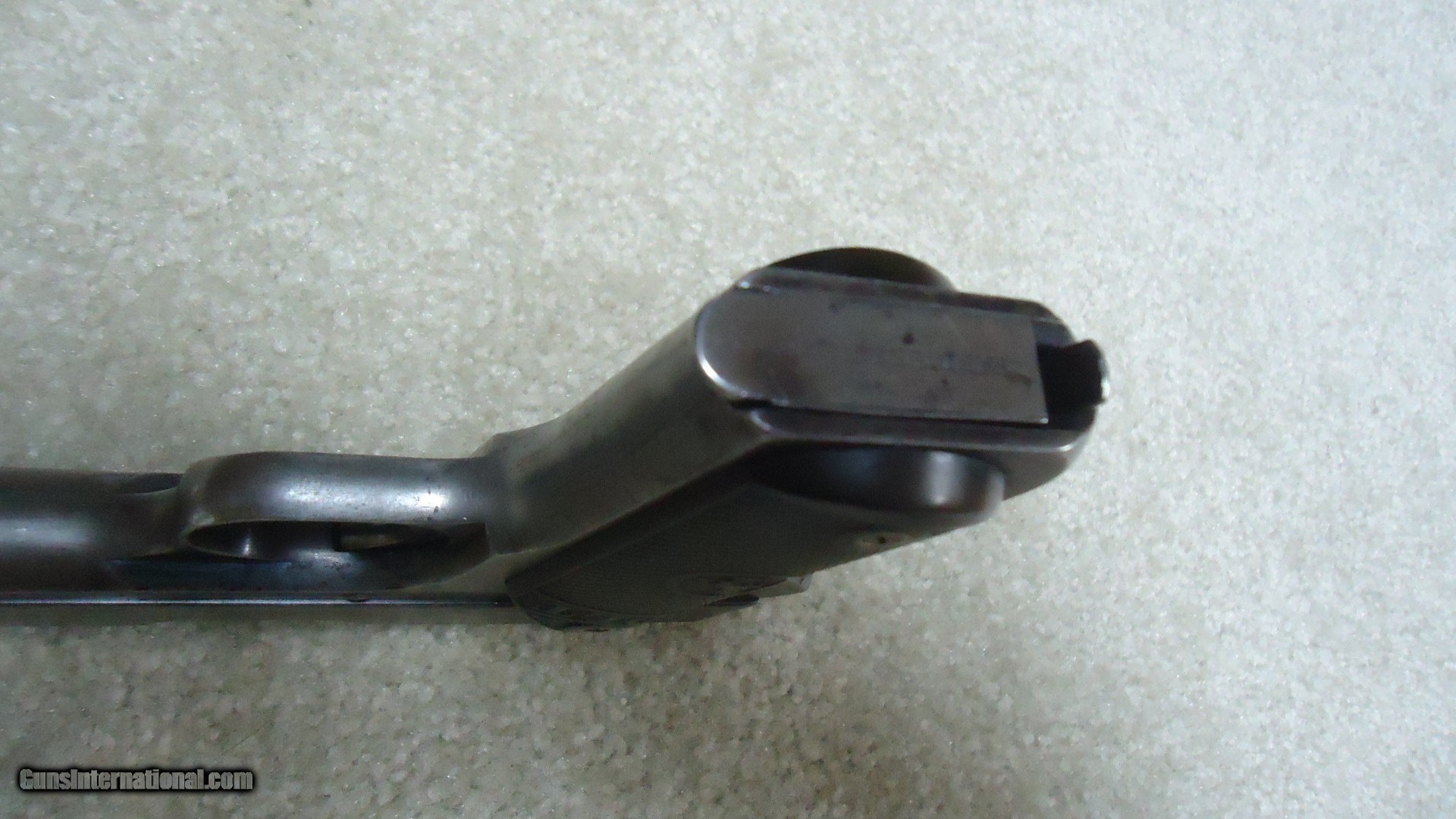 Description: HISTORIC, DOCUMENTED VERY EARLY MODEL 1902 SPORTING AUTO PISTOL, .38 ACP, #8XXX, SHIPPED TO BROWNING BROTHERS, OGDEN, UTAH ON MAY 13, 1905! This was a very limited production very early full size Colt automatic pistol that followed the first auto, the Colt 1900, and only about 7,500 were made from 1903-1908. The 1902 Military Model was made in far more numbers and lasted from 1902-1929. This example has the correct "BROWNING'S PATENTS" of 1897 and 1902 on the slide and retains the correct magazine with the patent date of 1884 stamping on the bottom. This pistol is listed by serial number in the GOVERNMENT MODELS book by Goddard as having been shipped on may 13, 1905 to Browning Brothers who were located in Ogden, Utah. Obviously, John Browning designed these early Colt auto pistols and it is very possible he actually handled this exact pistol which was sold from his family shop 117 years ago. Additionally, this is a documented early western shipped Colt. In 1905 Utah most Colt buyers who wanted a holster sized handgun were choosing Single Action Armies and Bisleys or perhaps a big New Service double action revolver. It would have been a very savvy ahead-of-his-time shootist to choose one of the new-fangled auto loading pistols designed by Jonathan Browning and sold by Colt! This is an honest example that has seen western usage, but is solid and fully functional. The metal surfaces retain little original blue except in the more protected areas- around the grips, above the trigger guard and on the frame beneath the slide. Sights are original and unaltered. This is an early model with the slide serrations at the FRONT of the slide only. The round stub hammer retains traces of light case color on the sides. Grips are fine and not chipped or cracked. Mechanically excellent and tight with excellent bore. Interestingly, there are no safeties or slide catches/releases on this early auto. Just a half-cock on the hammer. A wonderful piece of western history directly associated with John Browning himself! SOLD Curio/Relic: Yes Manufacturer: COLT Model: 1902 SPORTING AUTO Serial Number: 8XXX Condition: VG |