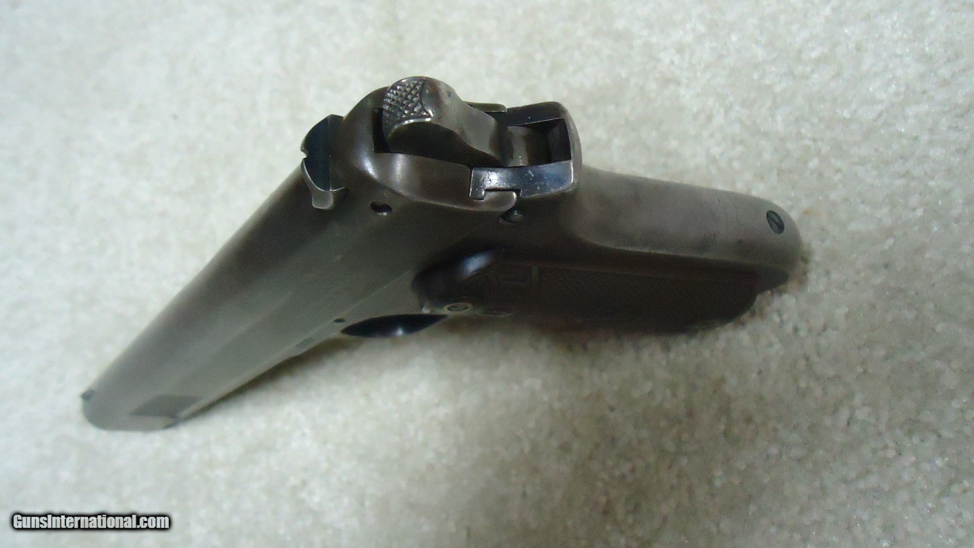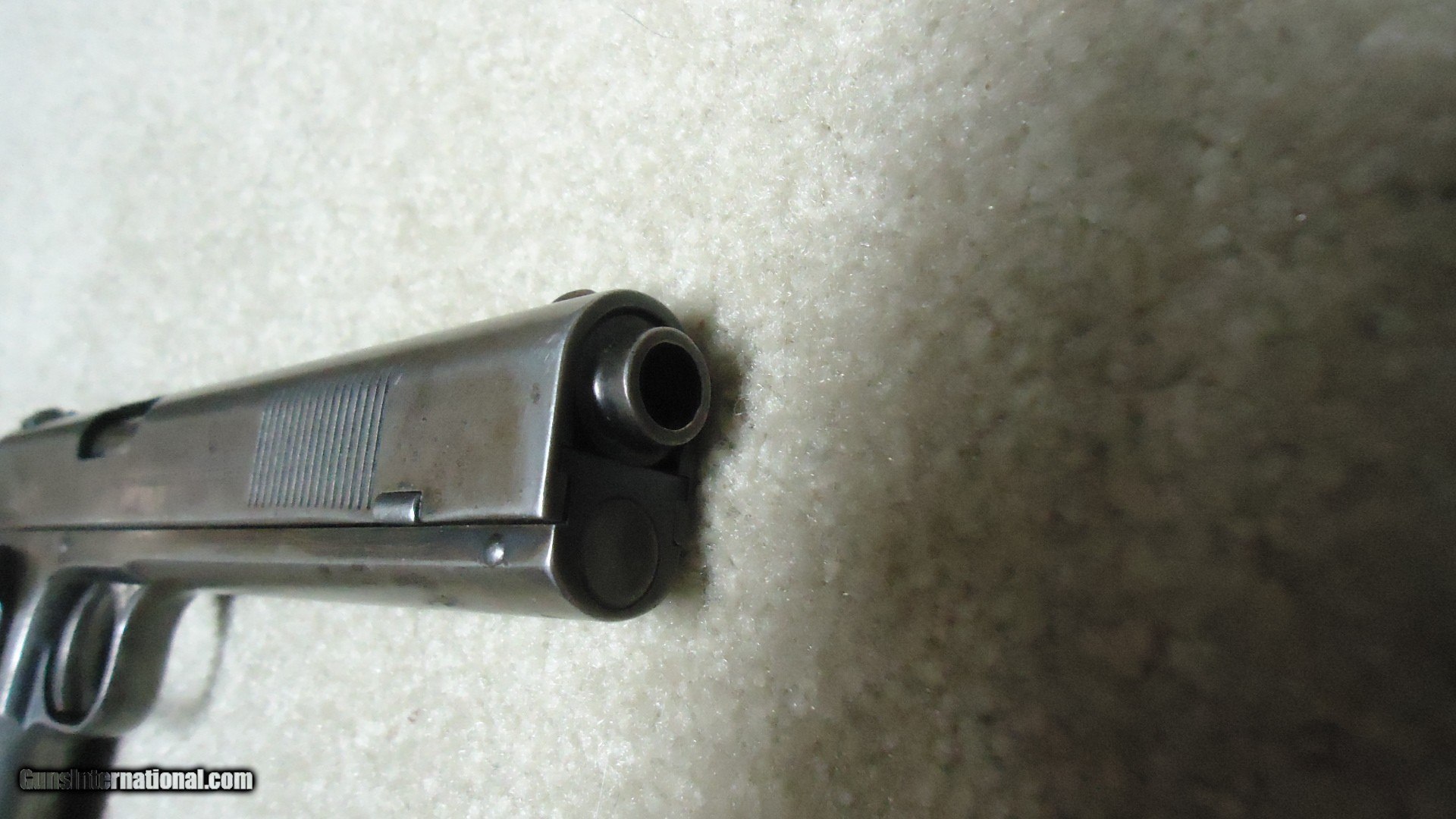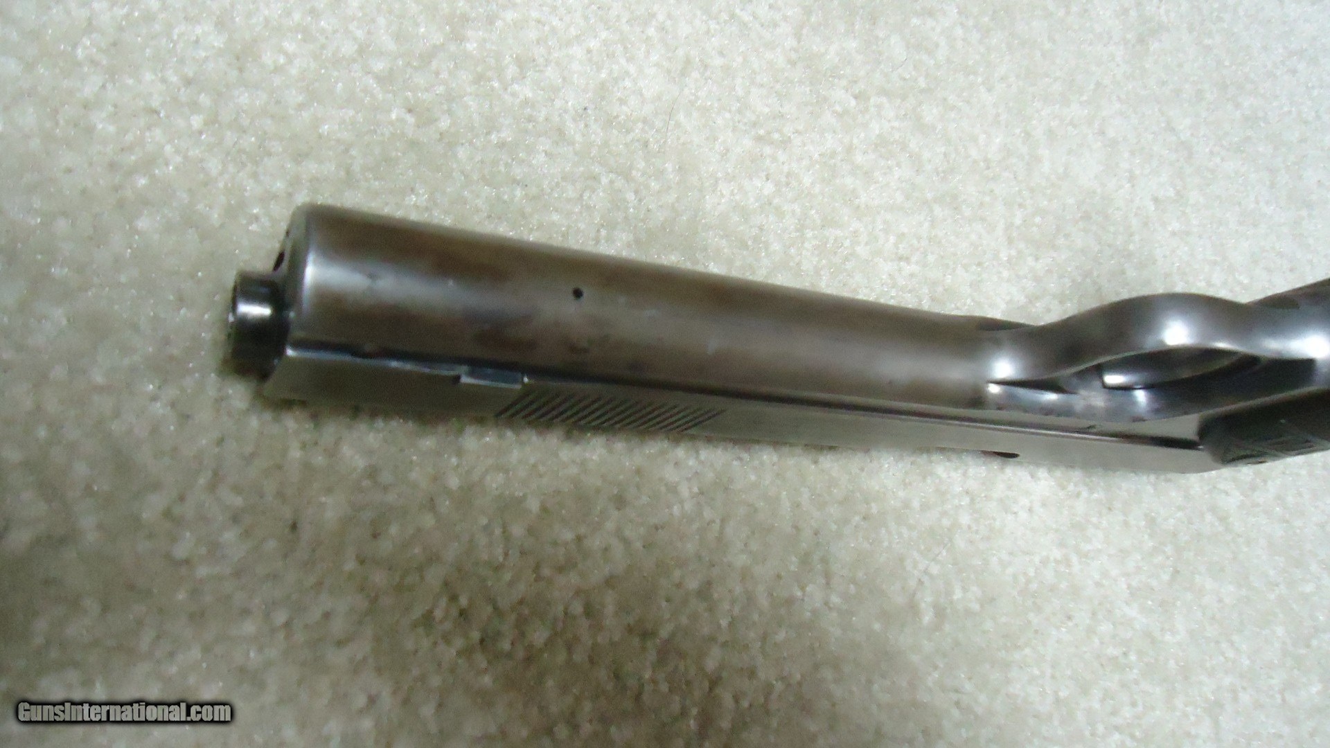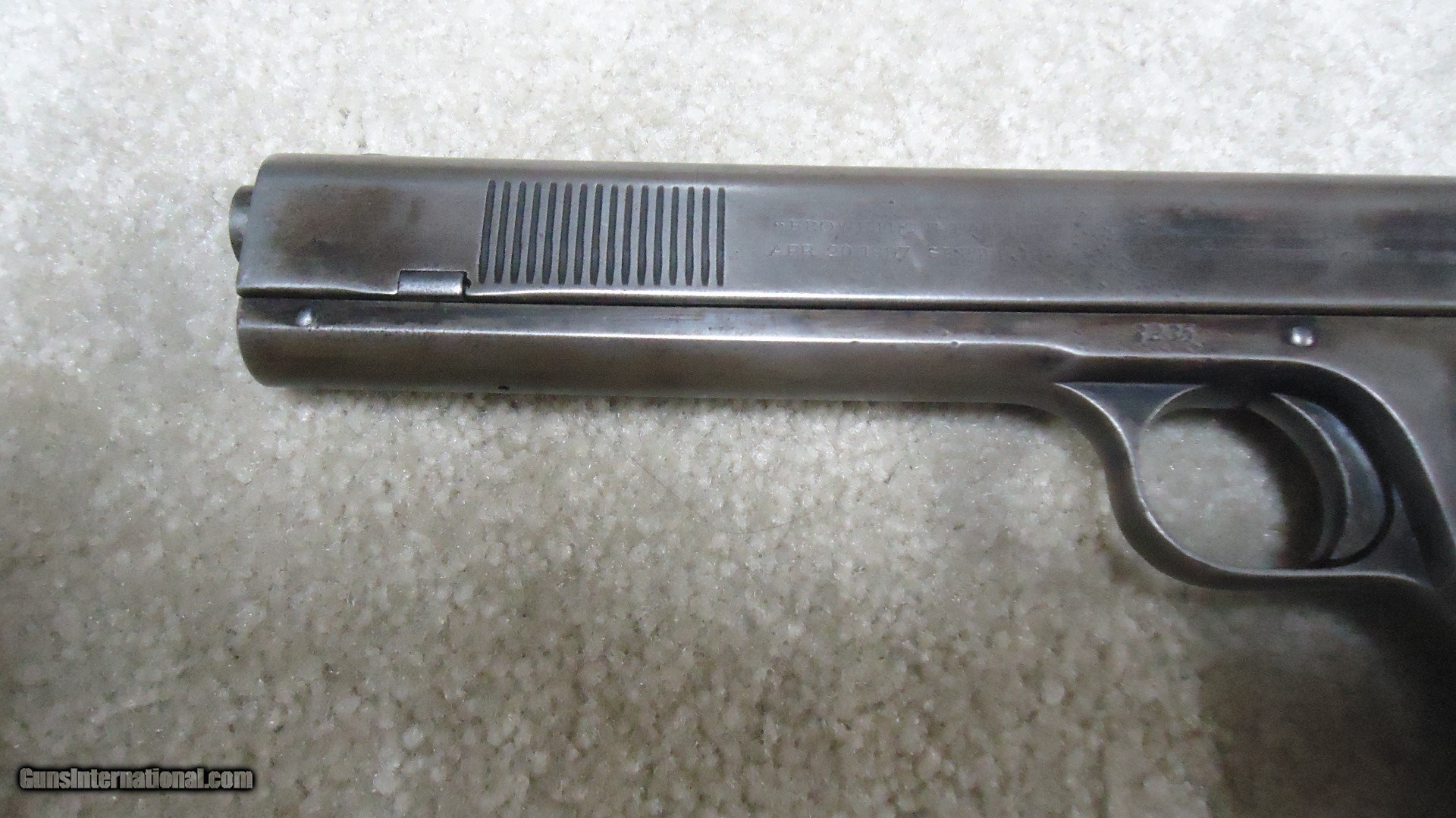 Description: HISTORIC, DOCUMENTED VERY EARLY MODEL 1902 SPORTING AUTO PISTOL, .38 ACP, #8XXX, SHIPPED TO BROWNING BROTHERS, OGDEN, UTAH ON MAY 13, 1905! This was a very limited production very early full size Colt automatic pistol that followed the first auto, the Colt 1900, and only about 7,500 were made from 1903-1908. The 1902 Military Model was made in far more numbers and lasted from 1902-1929. This example has the correct "BROWNING'S PATENTS" of 1897 and 1902 on the slide and retains the correct magazine with the patent date of 1884 stamping on the bottom. This pistol is listed by serial number in the GOVERNMENT MODELS book by Goddard as having been shipped on may 13, 1905 to Browning Brothers who were located in Ogden, Utah. Obviously, John Browning designed these early Colt auto pistols and it is very possible he actually handled this exact pistol which was sold from his family shop 117 years ago. Additionally, this is a documented early western shipped Colt. In 1905 Utah most Colt buyers who wanted a holster sized handgun were choosing Single Action Armies and Bisleys or perhaps a big New Service double action revolver. It would have been a very savvy ahead-of-his-time shootist to choose one of the new-fangled auto loading pistols designed by Jonathan Browning and sold by Colt! This is an honest example that has seen western usage, but is solid and fully functional. The metal surfaces retain little original blue except in the more protected areas- around the grips, above the trigger guard and on the frame beneath the slide. Sights are original and unaltered. This is an early model with the slide serrations at the FRONT of the slide only. The round stub hammer retains traces of light case color on the sides. Grips are fine and not chipped or cracked. Mechanically excellent and tight with excellent bore. Interestingly, there are no safeties or slide catches/releases on this early auto. Just a half-cock on the hammer. A wonderful piece of western history directly associated with John Browning himself! SOLD Curio/Relic: Yes Manufacturer: COLT Model: 1902 SPORTING AUTO Serial Number: 8XXX Condition: VG |