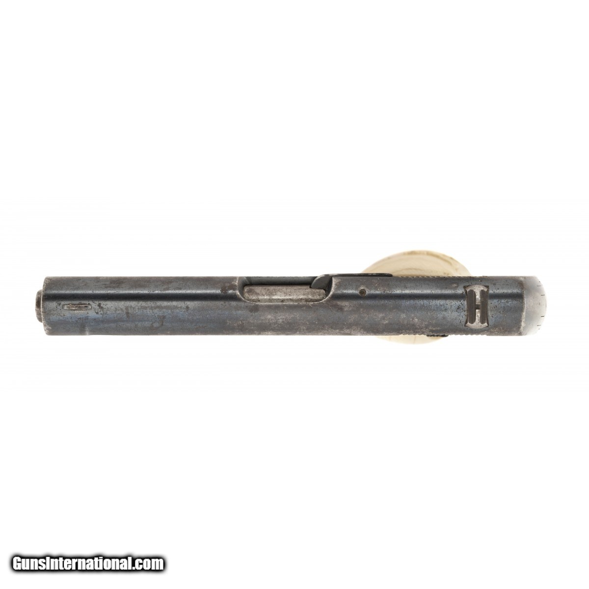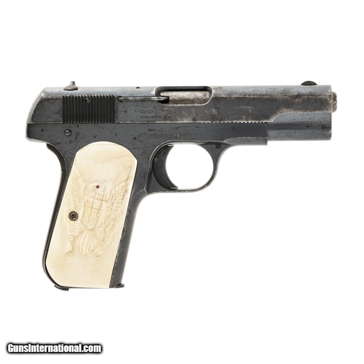 Description: " Pre-war pocket auto made in 1926. Has about 60% blue with wear on the slide. The bore is dark and worn. Has old ivory grips carved with an American eagle with ruby eye. A classic pocket auto. SOLD Curio/Relic: Yes |