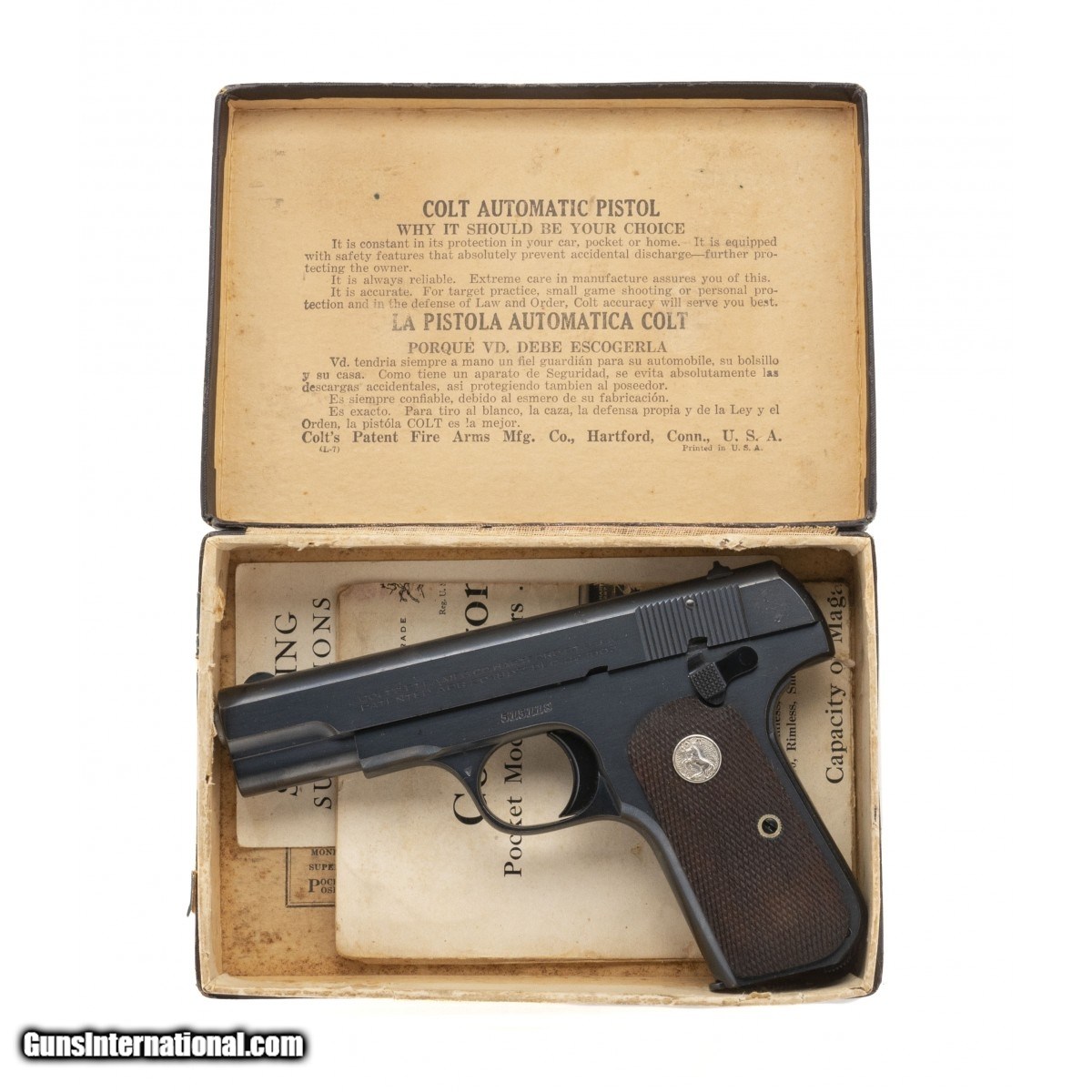 Description: " Pre-war Pocket auto made in 1934. Has virtually 100% of its original blue. The grips are in excellent condition. Overall excellent condition. Comes with original Colt box and papers! SOLD Curio/Relic: Yes |