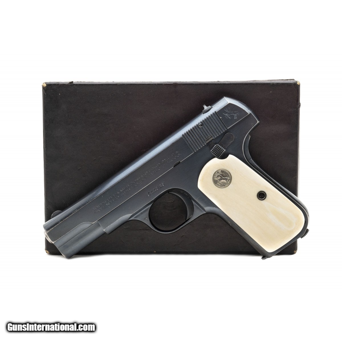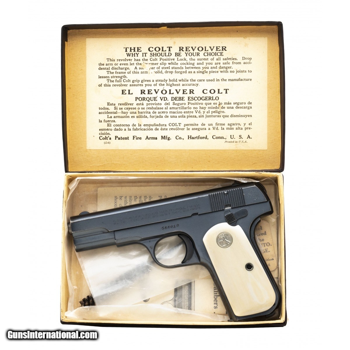 Manufactured in 1941. Bore is excellent. Metal has approximately 97% original finish with minimal wear. Ivory grips have Colt medallions and look beautiful. Comes with an original box. The bottom of the box is numbered to a different 1903.