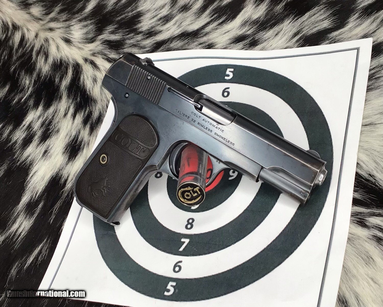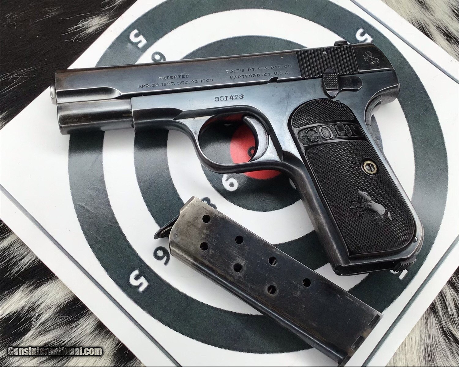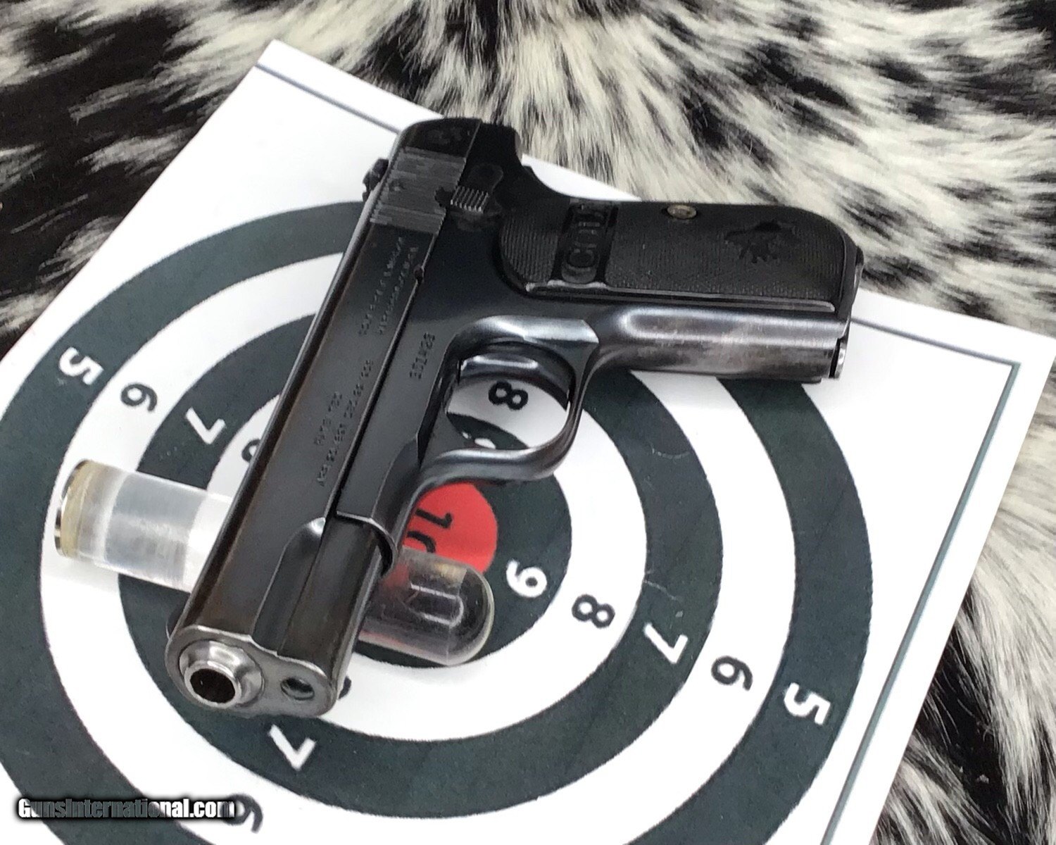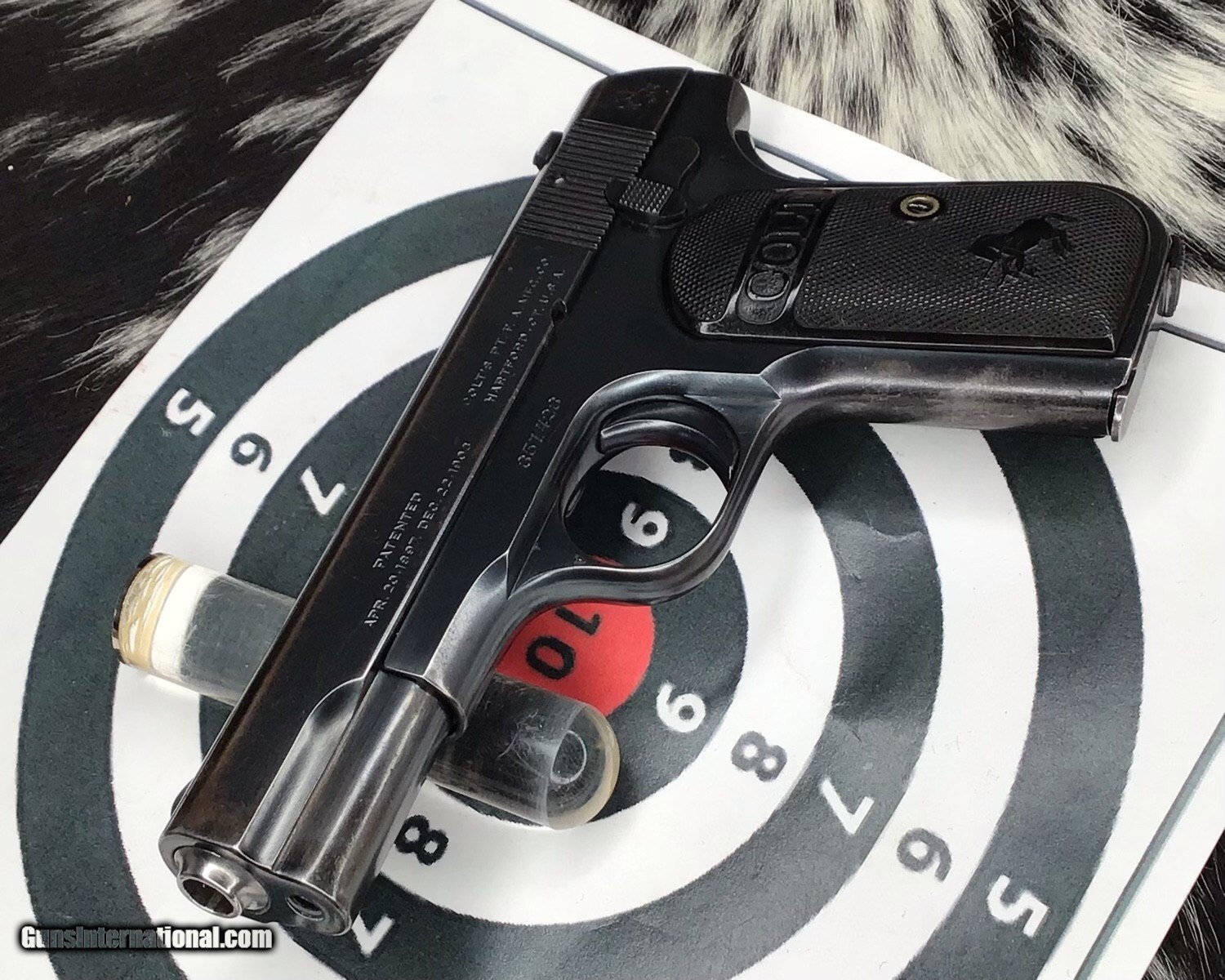 Description: 1903 Colt Hammerless Pistol chambered in .32 acp and made in 1920. Most of the original Blued finish remains with thinning near muzzle and high lines of slide. Original grips very good with no cracks. Correct early tutone magazine. Very good bore with strong rifling. A design of Mr. John Moses Browning that was a very popular piece to those on both sides of the law. John Dillinger had one in his pocket that fateful night in Chicago when he attended the Biograph theater with the "Lady in Red" This model saw service in both world wars. With the rule of "The higher the rank, the smaller the gun" was issued to General Officers. Add 3% if paying with credit card. God Bless America from a proud American, and a Viet Nam Vet , thankful for our freedoms.. paid for by the Blood ,Sweat and Tears of our brave men and women in uniform. Ten Below Firearms is a Veteran owned and operated business. We specialize in out of production models of high quality firearms. We love to ship! If you are out of state or can't make it to our store, just give us a call! Handguns normally ship for $30 and Long guns for $40 to $55 for extra length long guns. That's 2-3 day USPS Priority shipping, Delivery conformation and with tracking number. Optional Postal insurance is additional $1.50 per $100 and highly recommended. We are OPEN BY APPOINTMENT ONLY FOR IN PERSON VISITS. SOLD Curio/Relic: Yes Handgun Caliber: .32 ACP (7.65x17mm Browning SR) Manufacturer: Colt Model: 1903 Barrel Length: 3.75 inch Condition: Very good Metal Condition: Very good Bore Condition: Very good Action: Semi-auto Finish: Blued Sights: Fixed Manufacture Date: 1920 |