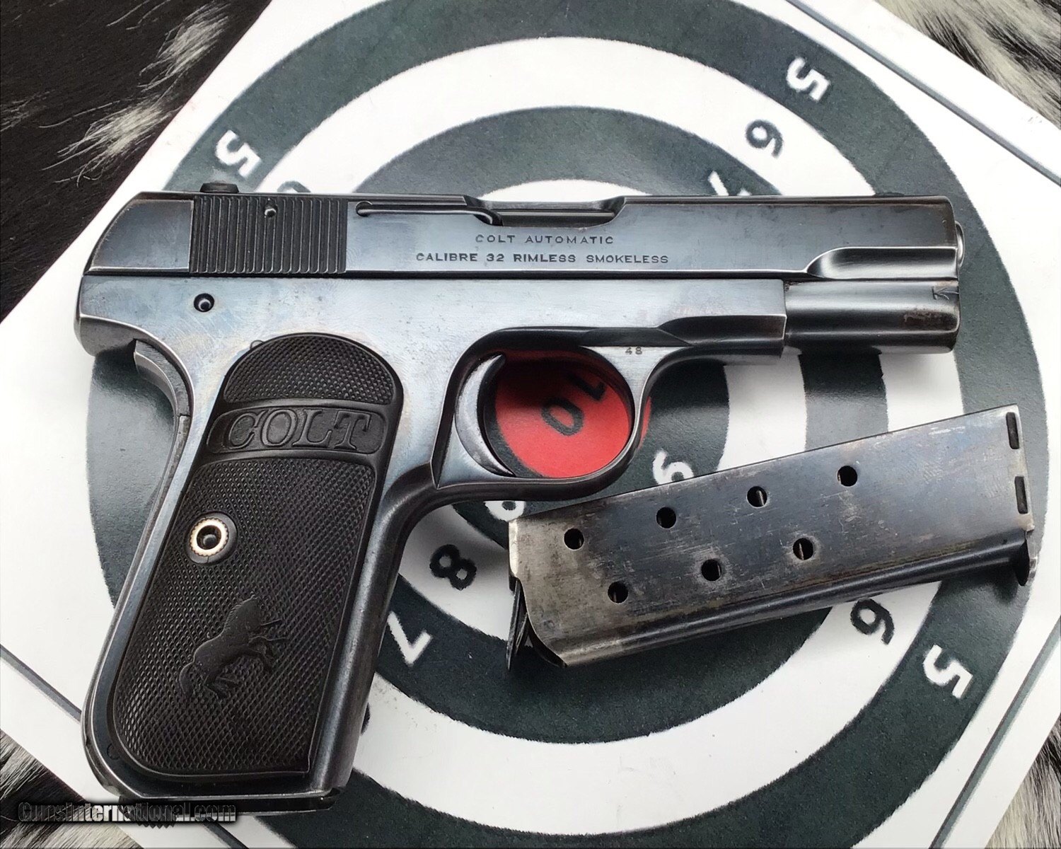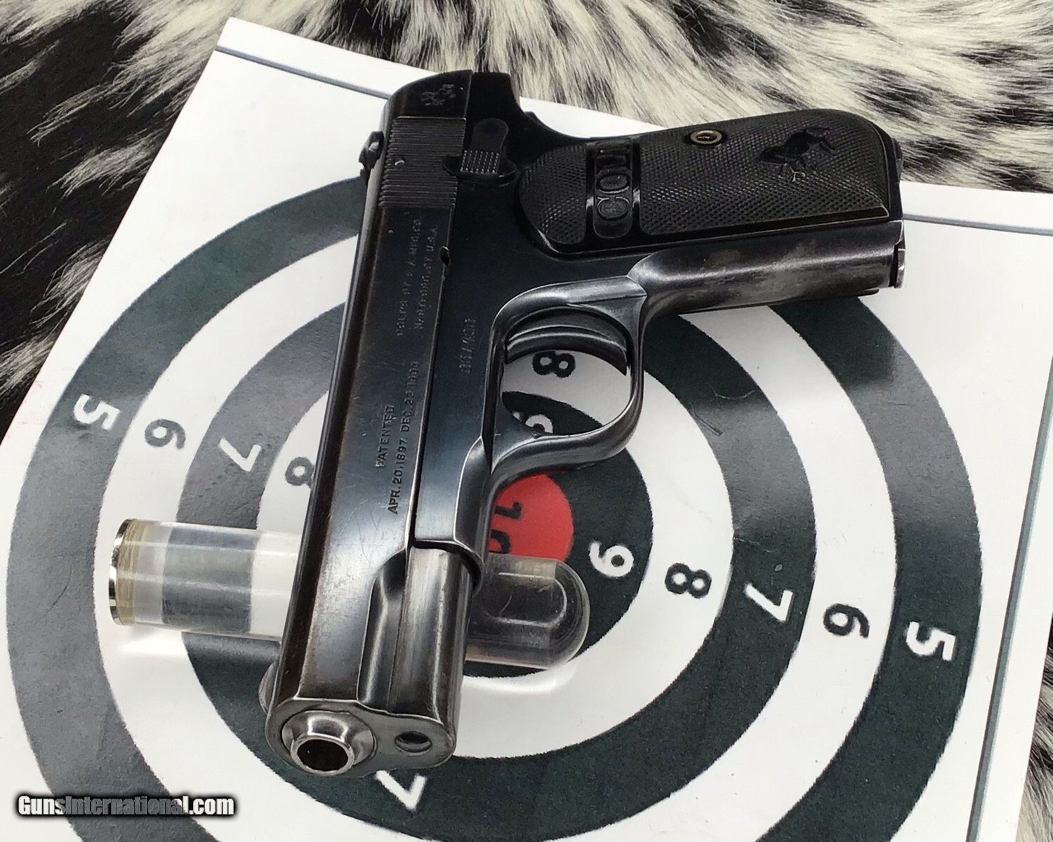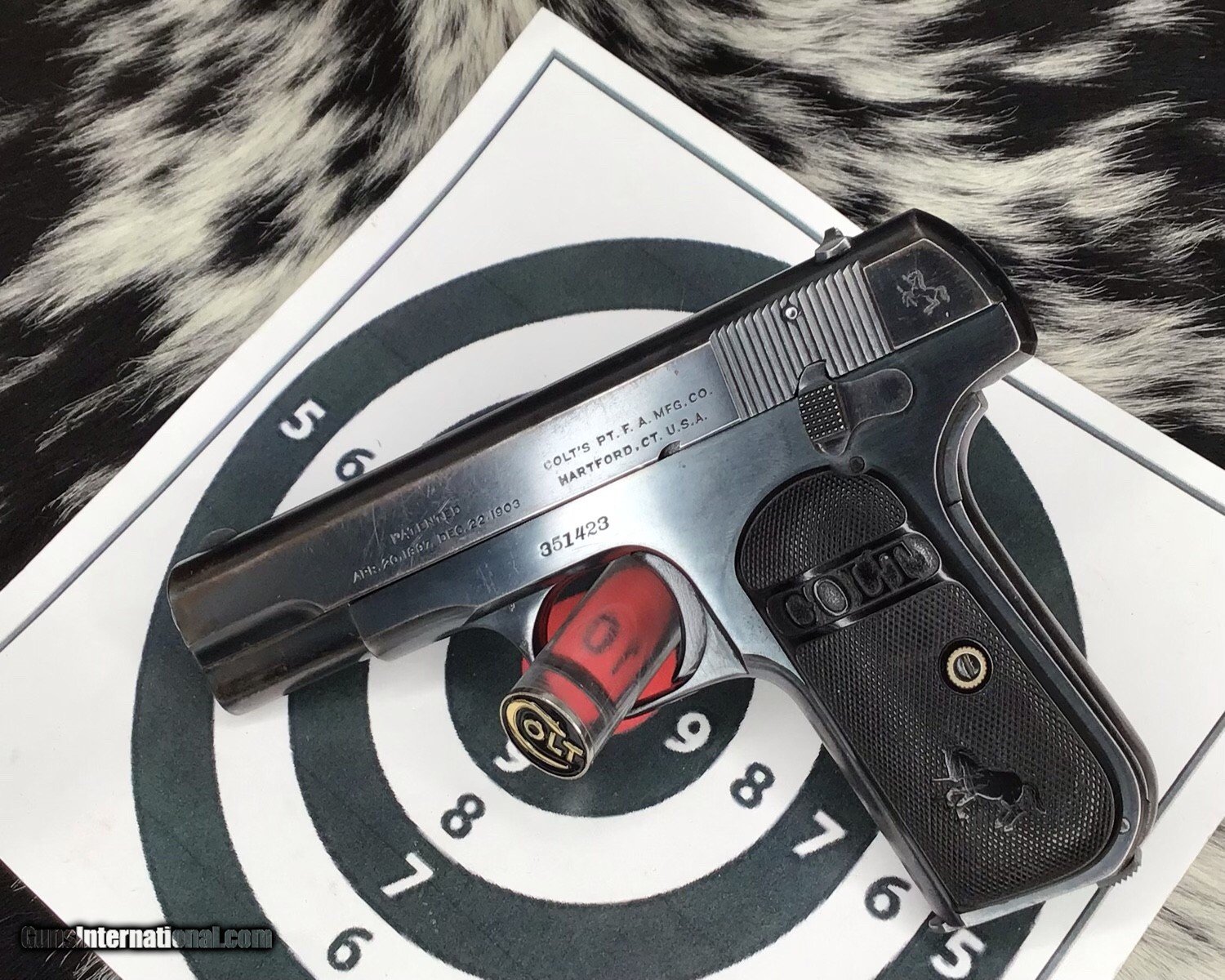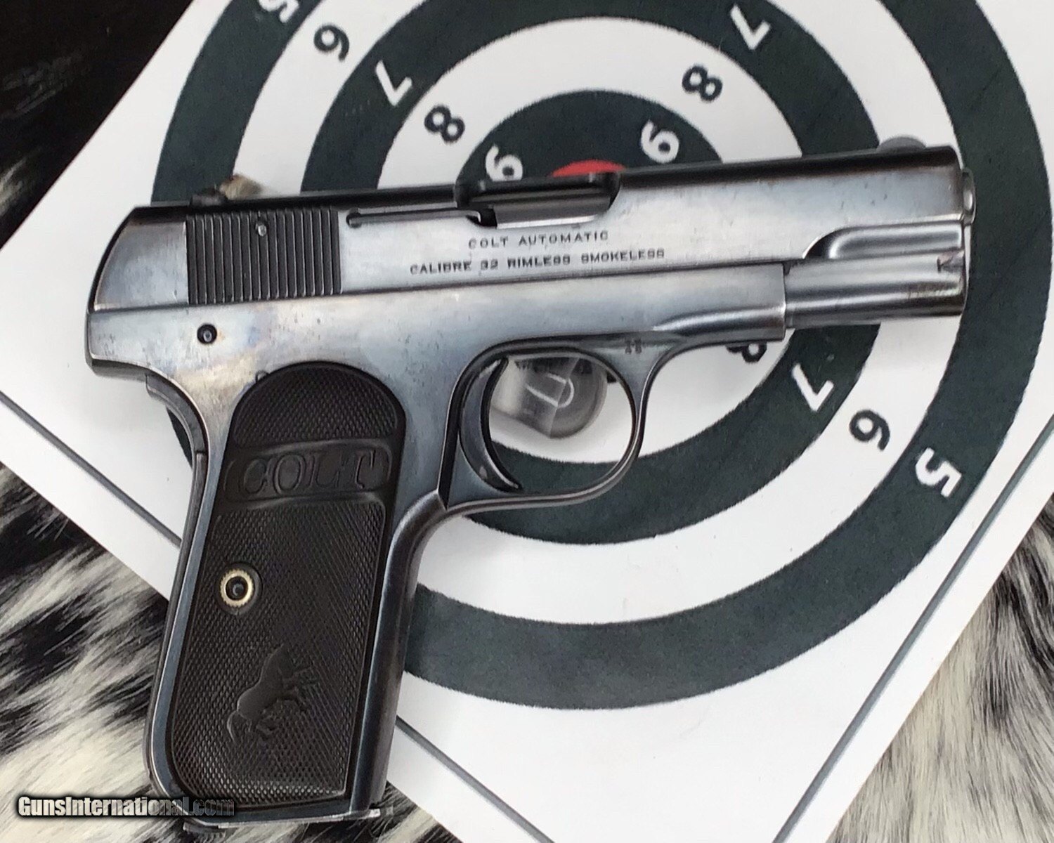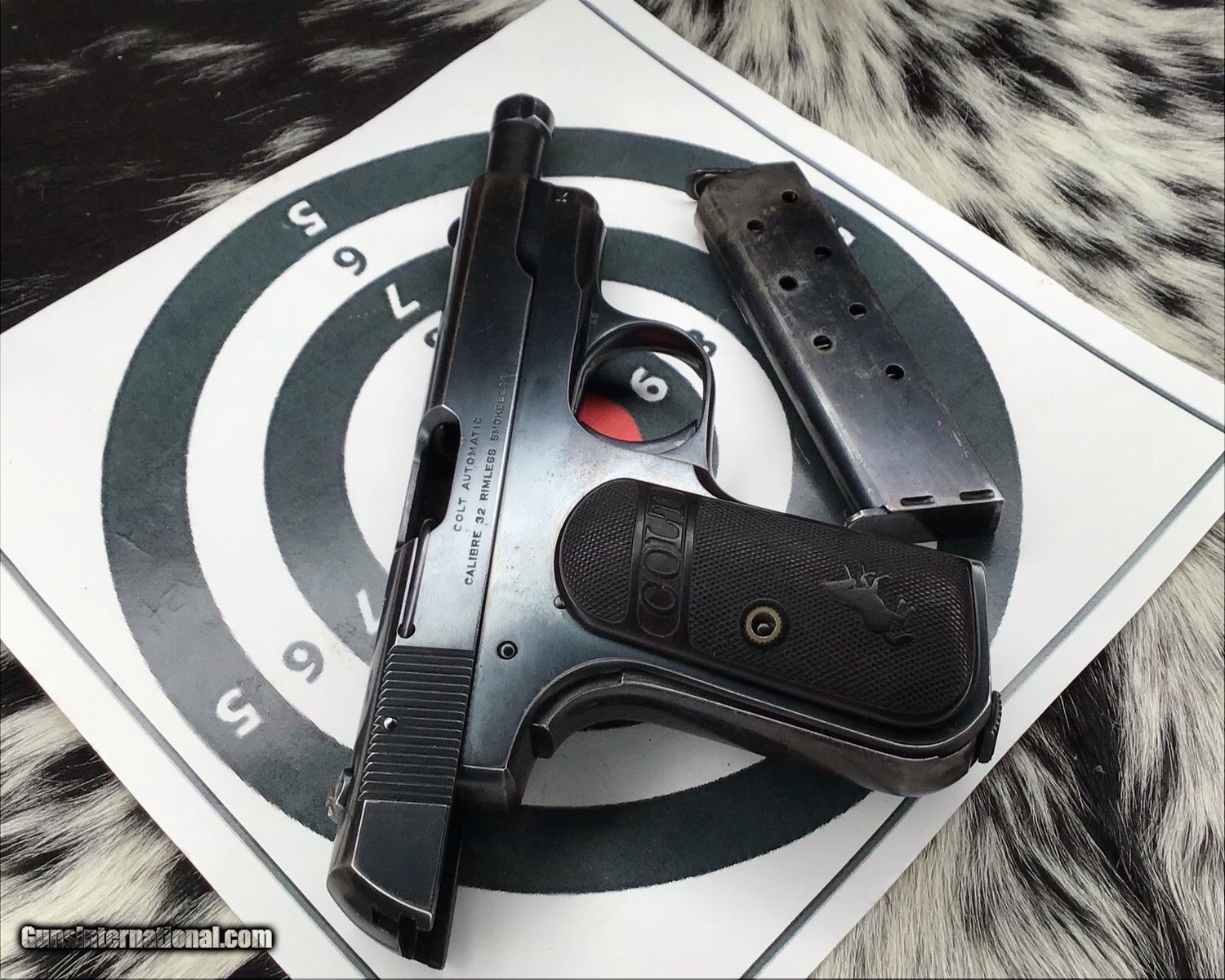 Description: 1903 Colt Hammerless Pistol chambered in .32 acp and made in 1920. Most of the original Blued finish remains with thinning near muzzle and high lines of slide. Original grips very good with no cracks. Correct early tutone magazine. Very good bore with strong rifling. A design of Mr. John Moses Browning that was a very popular piece to those on both sides of the law. John Dillinger had one in his pocket that fateful night in Chicago when he attended the Biograph theater with the "Lady in Red" This model saw service in both world wars. With the rule of "The higher the rank, the smaller the gun" was issued to General Officers. Add 3% if paying with credit card. God Bless America from a proud American, and a Viet Nam Vet , thankful for our freedoms.. paid for by the Blood ,Sweat and Tears of our brave men and women in uniform. Ten Below Firearms is a Veteran owned and operated business. We specialize in out of production models of high quality firearms. We love to ship! If you are out of state or can't make it to our store, just give us a call! Handguns normally ship for $30 and Long guns for $40 to $55 for extra length long guns. That's 2-3 day USPS Priority shipping, Delivery conformation and with tracking number. Optional Postal insurance is additional $1.50 per $100 and highly recommended. We are OPEN BY APPOINTMENT ONLY FOR IN PERSON VISITS. SOLD Curio/Relic: Yes Handgun Caliber: .32 ACP (7.65x17mm Browning SR) Manufacturer: Colt Model: 1903 Barrel Length: 3.75 inch Condition: Very good Metal Condition: Very good Bore Condition: Very good Action: Semi-auto Finish: Blued Sights: Fixed Manufacture Date: 1920 |