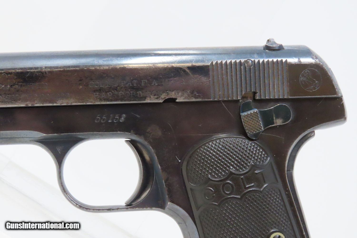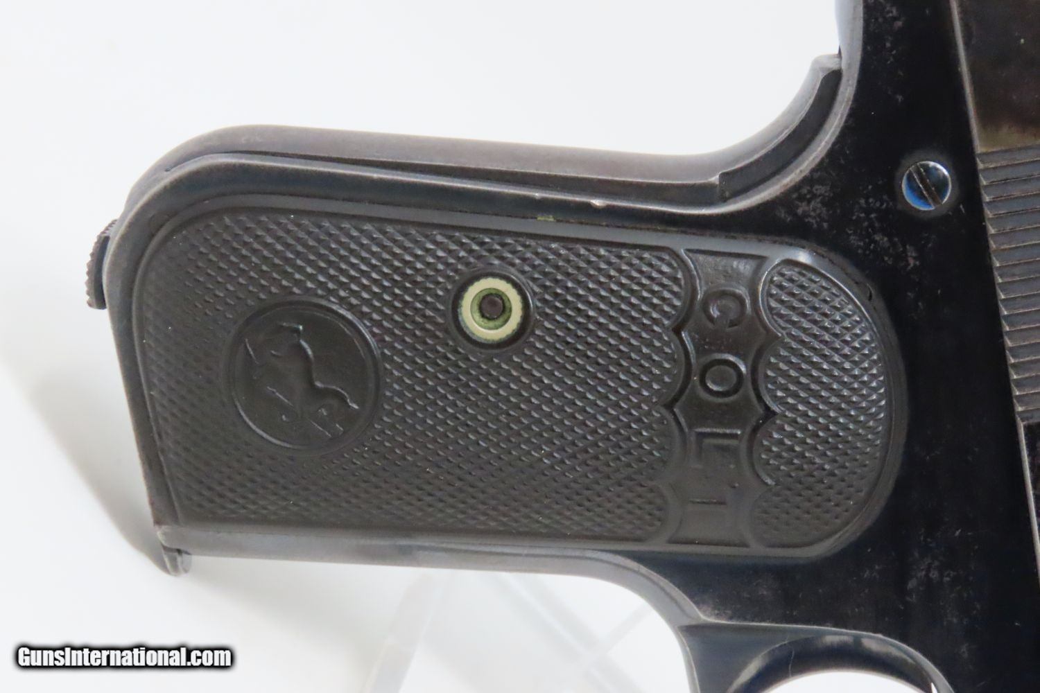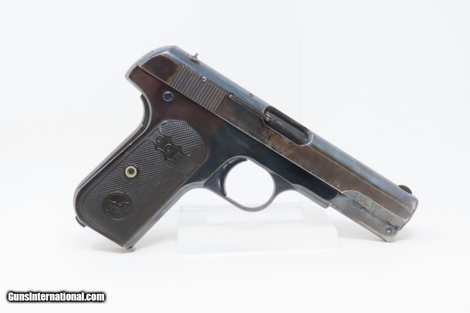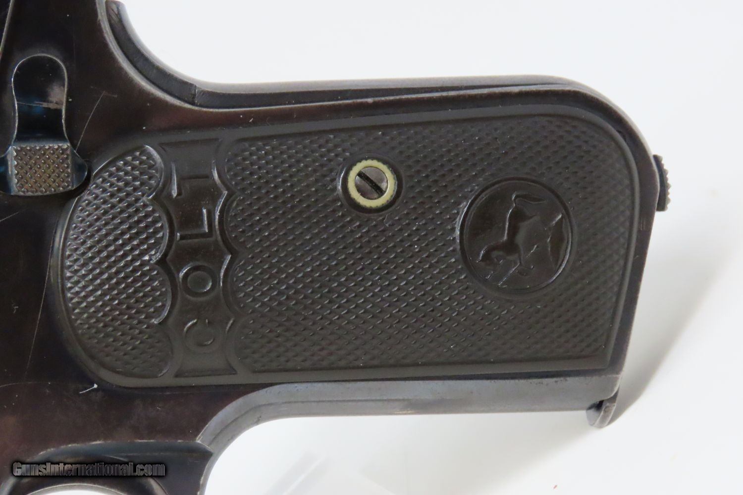 Description: 1907 COLT Model 1903 POCKET HAMMERLESS .32 ACP Semi-Automatic PISTOL C&R Pre-WORLD WAR I Sidearm, Carry Pistol Here we present a Colt Model 1903 Pocket Hammerless Semi-Automatic Pistol manufactured in Hartford, Connecticut is 1907. The Colt Model 1903 Pocket Hammerless was a short-recoil, semi-automatic pistol, designed by the American arms designer John Moses Browning. The Colt Model 1903 Pocket Hammerless (not to be confused with the Colt Model 1903 Pocket Hammer) is a .32 ACP caliber, self-loading, semi-automatic pistol. Despite the title "hammerless", the Model 1903 does have a hammer. The hammer is covered and hidden from view under the rear of the slide. This allows the pistol to be carried in and withdrawn from a pocket quickly and smoothly without snagging. Approximately 570,000 Colt Pocket Hammerless pistols were produced from 1903 to 1945, in five different types. Some were issued to US Army and US Air Force general officers from World War II through the 1970s. In addition to lawful owners, many gangsters of the pre-World War II era favored the Model 1903 because they were relatively small and easily concealed. It is said that Al Capone kept one in his coat pocket and Bonnie Parker used one to break Clyde Barrow out of jail after smuggling it into the jail by taping it to her thigh. Bank robber John Dillinger was carrying this model of pistol when he was shot by FBI agents outside the Biograph theater on July 22, 1934. The overall condition is fine. Great original blue finish. The action is strong. The bore is in good shape. Both grips are firm and sharp with minimal handling marks. A fantastic example of the Colt 1903 that is sure to please! This firearm is classified as a Curio & Relic. Barrel is 3-3/4 inches. Caliber: .32 ACP Overall condition as seen in photos. Very Fast. Very Safe. FREE SHIPPING. Will need to be sent to your local FFL or C&R licensee. This firearm is classified as a Curio & Relic. Guaranteed AUTHENTIC & Includes CERTIFICATE OF AUTHENTICITY. ancestryguns $1475 #201154 SOLD Curio/Relic: Yes |