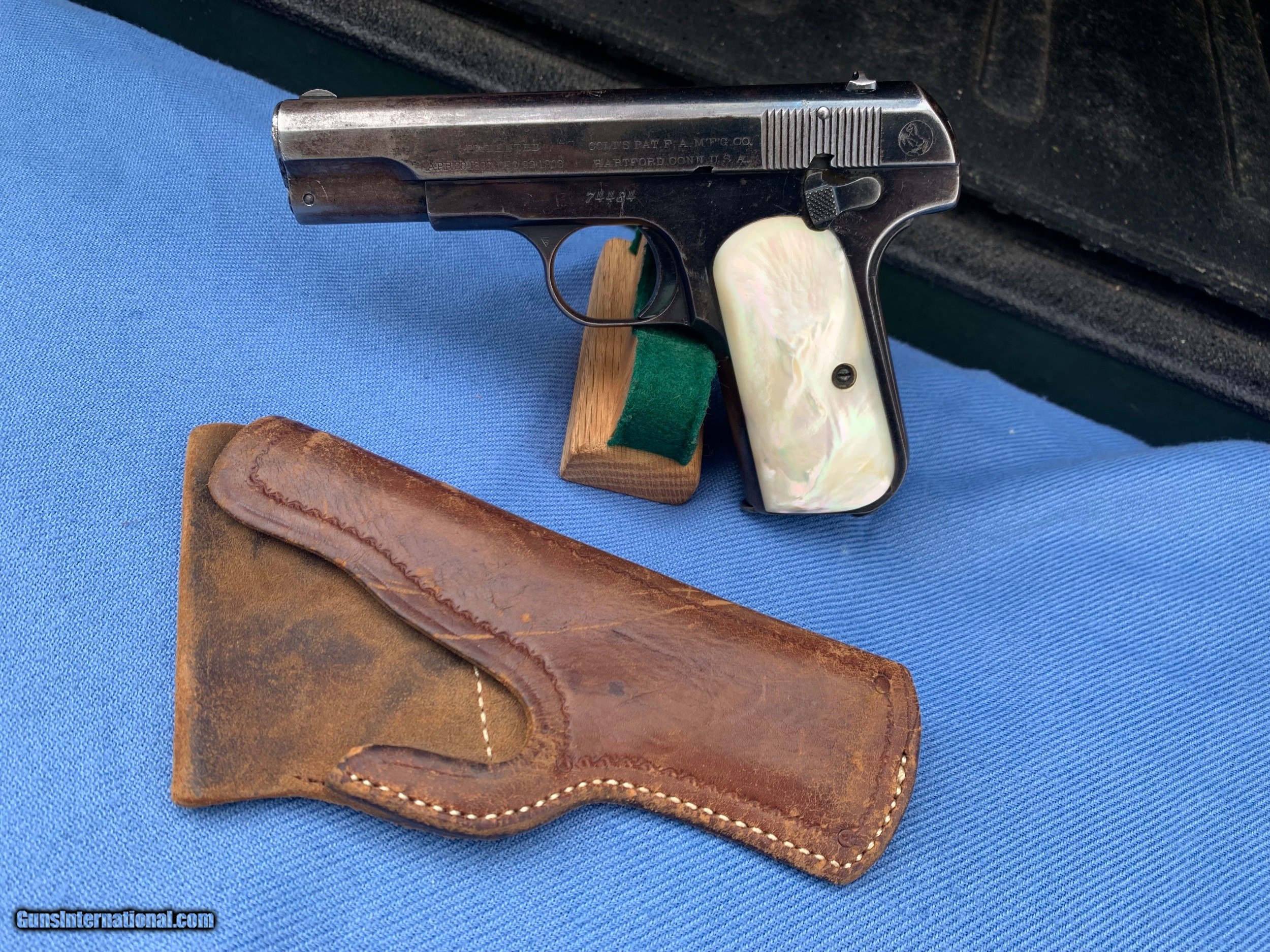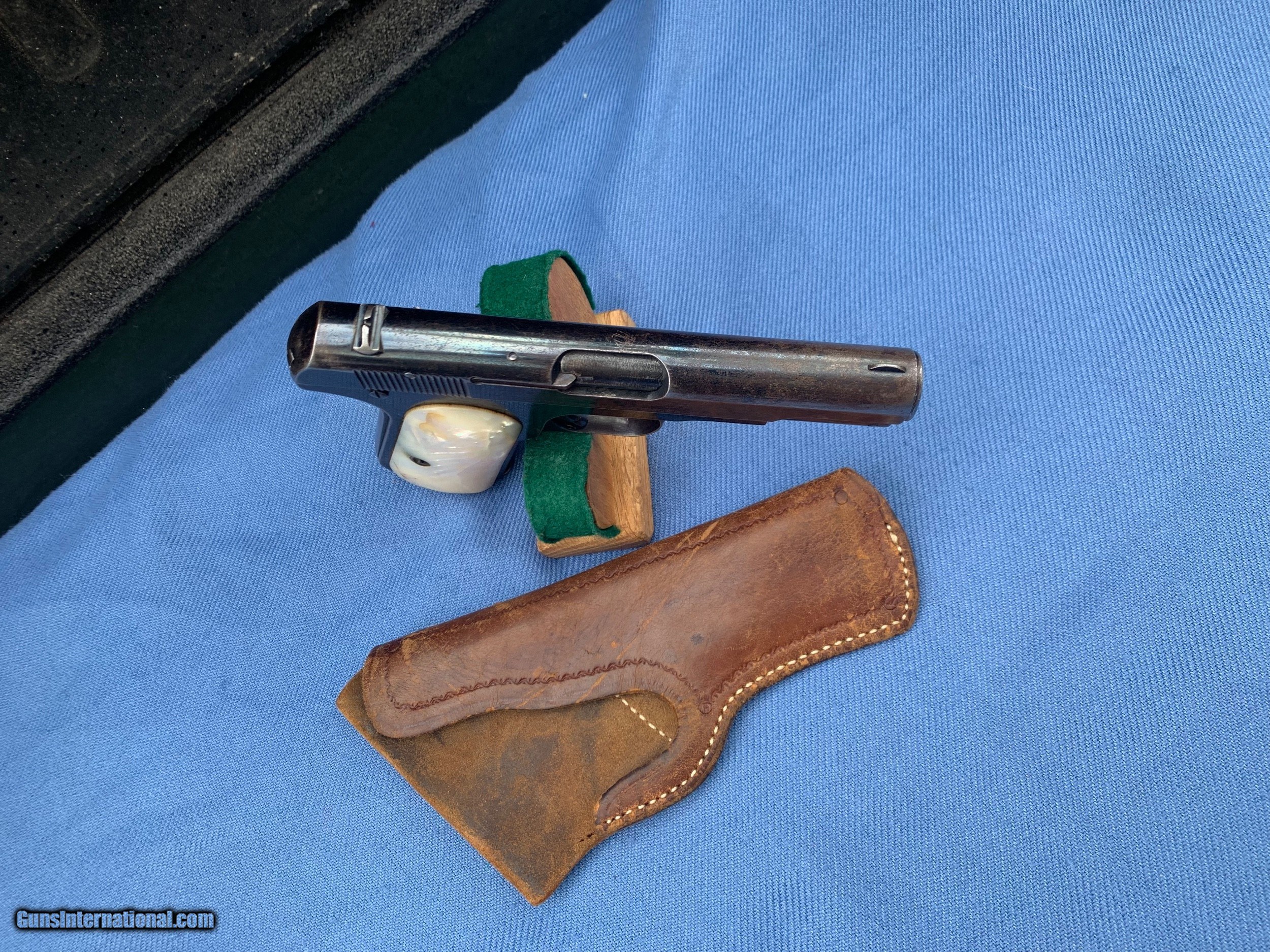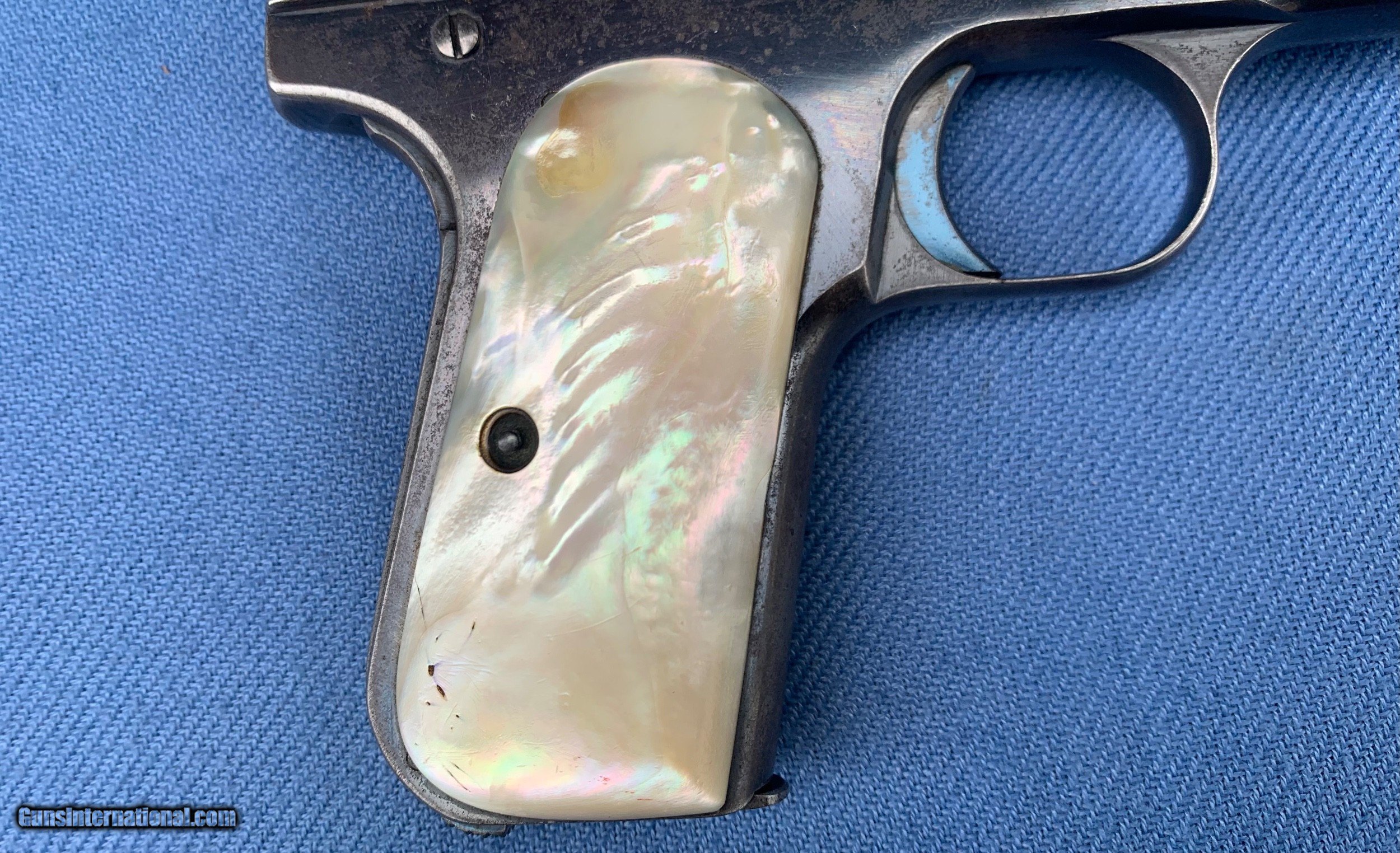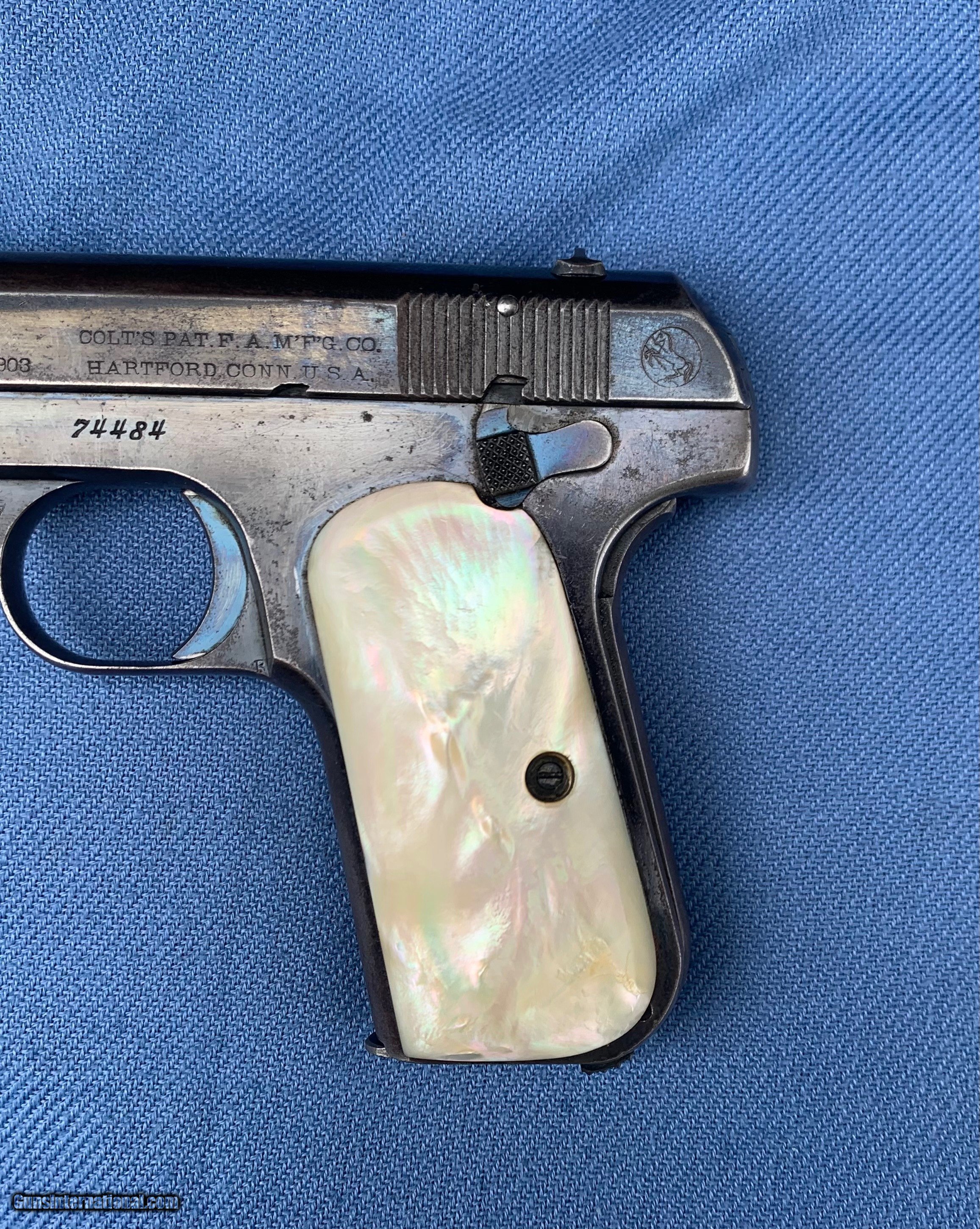 Description: Here's a Very early Colt 1903 ! Serial number 74484 . Early Bushing gun ! Love these Early 1903's because they used that Fire blue finish early on . Gun comes with original Mother of Pearl Grips ! Period leather holster . 32 auto . Gun has wear and has seen use . It still has most of its original blue finish with mostly holster wear . Markings are sharp . Bore and mechanics are in excellent condition! Gun locks up tight and is in excellent working order ! Super nice early Colt 1903 ! Please review my photos and please email me with any questions ? 3 day inspection as allways ! Thank you for looking, Little Jo SOLD Antique: Yes Handgun Caliber: .32 ACP (7.65x17mm Browning SR) Manufacturer: Colt Model: 1903 Serial Number: 74484 Condition: Excellent |