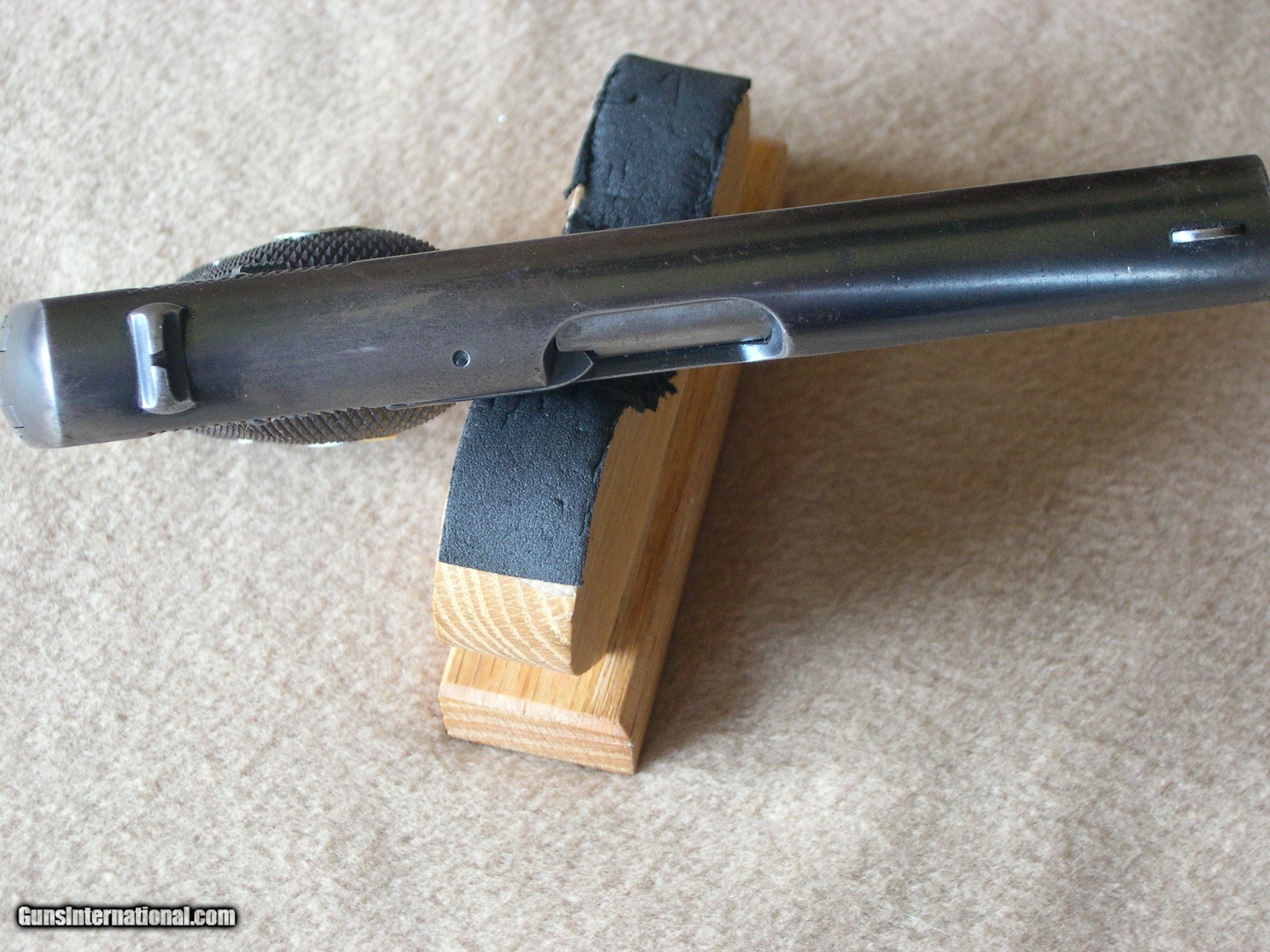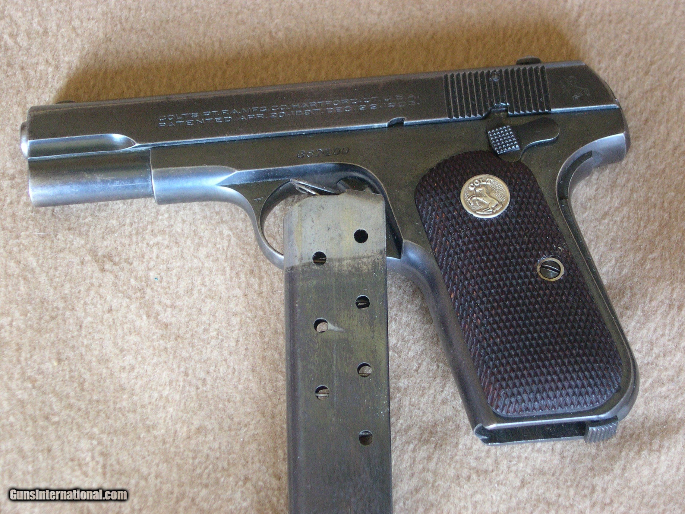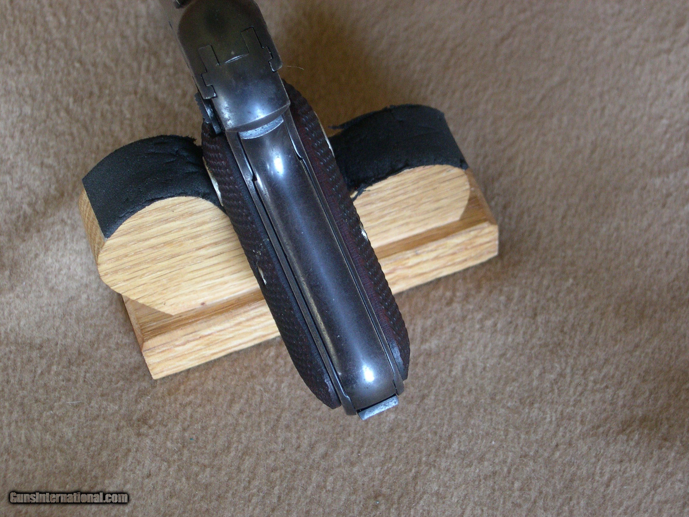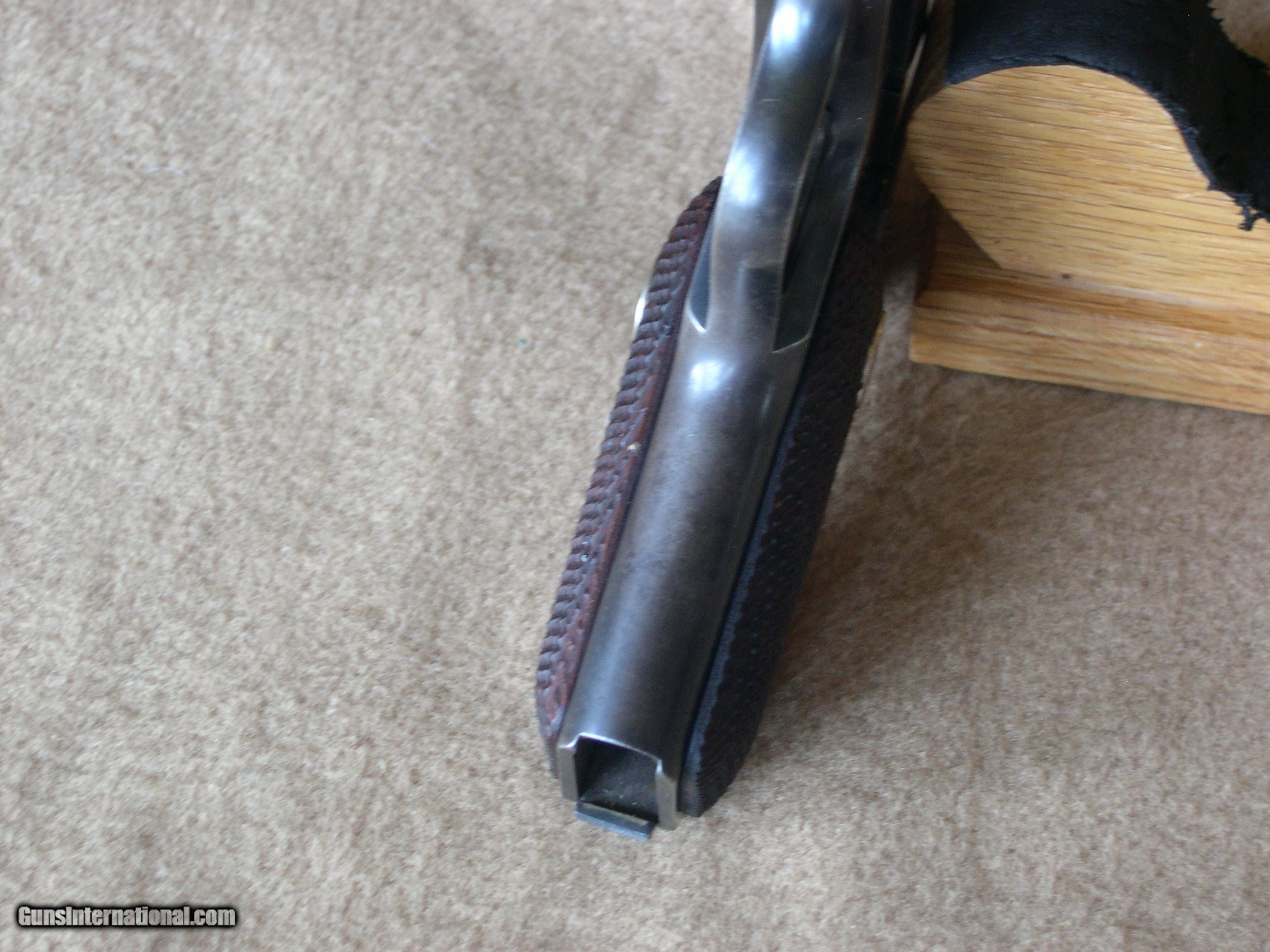 Description: Made in 1920, in 32 acp caliber, with about 70% orig finish,Exc Bore and mechanics, perfect checkered wood grips, factory original, Exc mechanical condition, and a great lt. wt. carry gun, you can carry cocked and locked safely! And you have easy acess!! Has thin profile, and very dependable! Also two tone magazine SOLD |