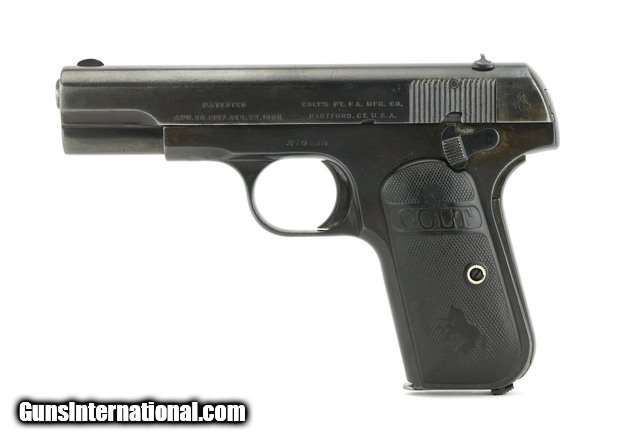 Description: Colt 1903 .32 ACP caliber pistol. Manufactured 1918. Very good bore. Action works perfectly. Pistol has approximately 95% blue which is an old refinish which looks good. Right side grip has a crack. Left side is fine.