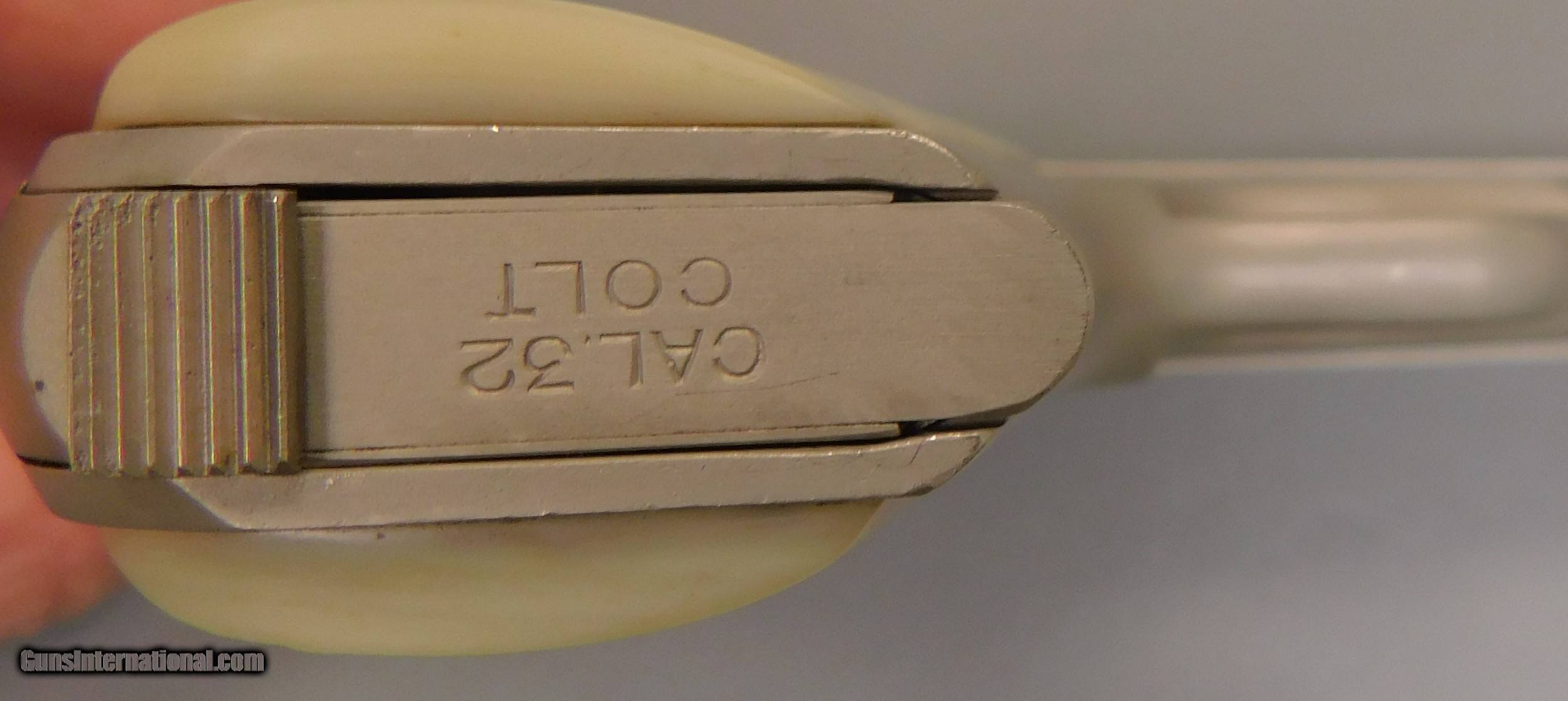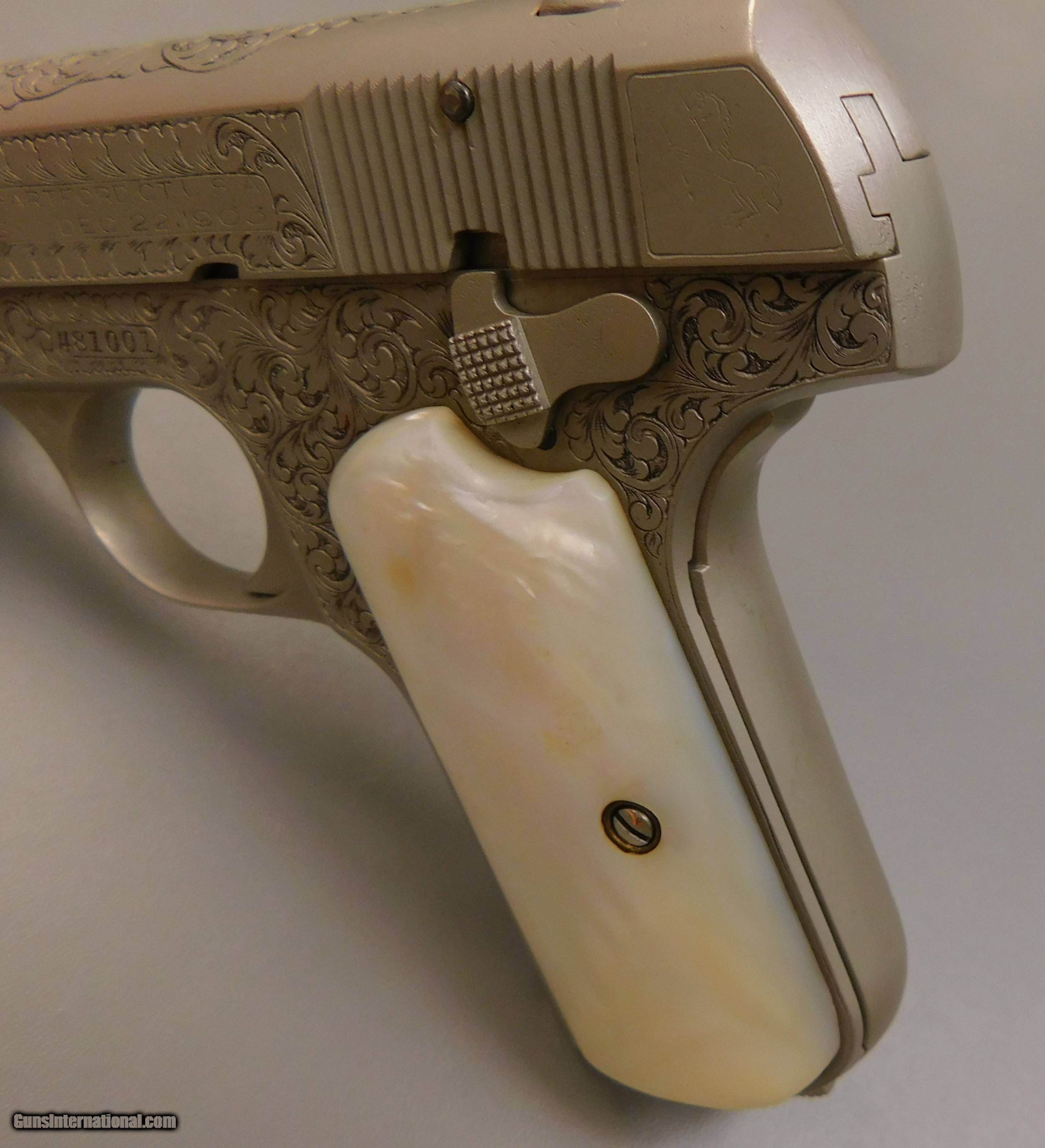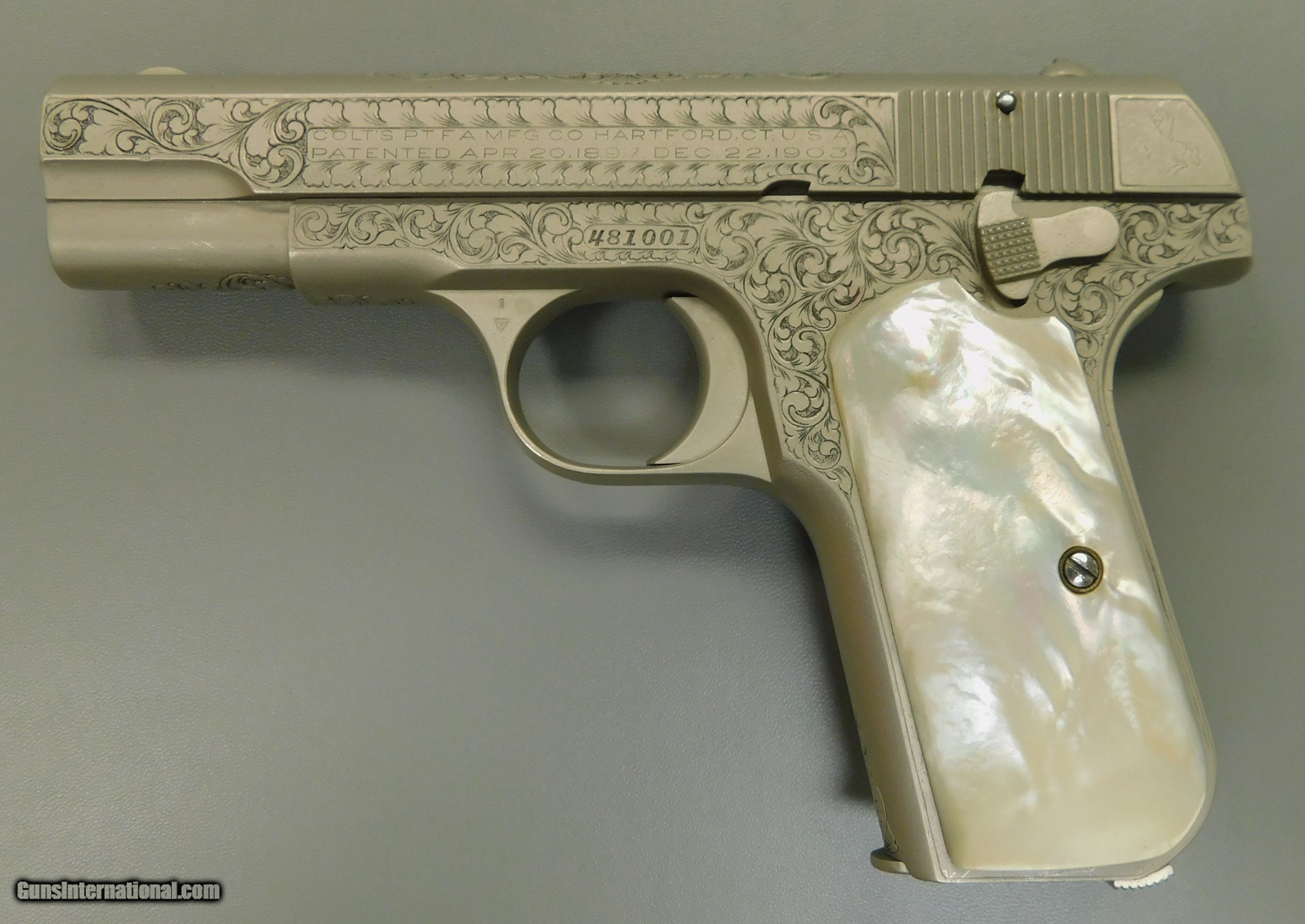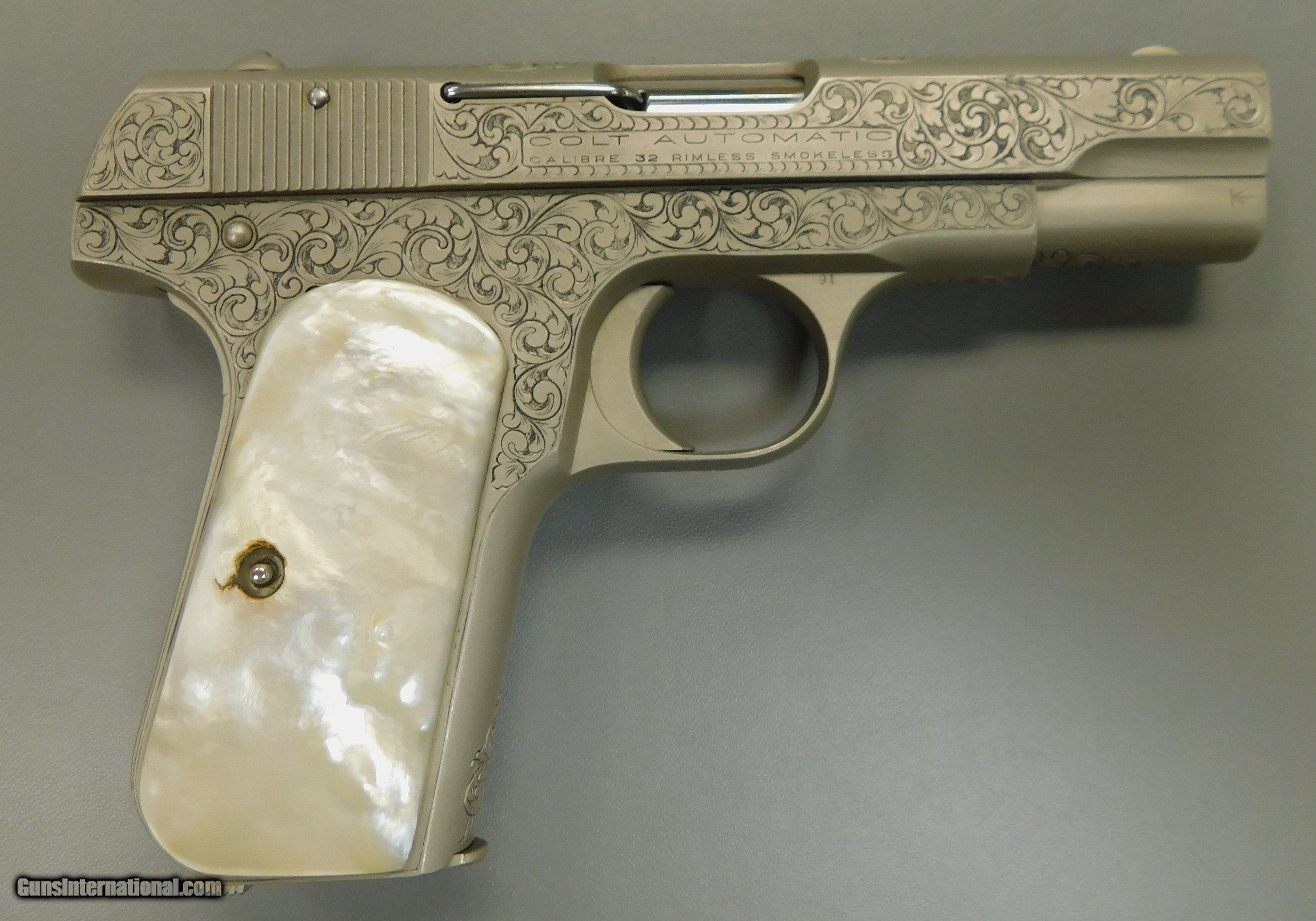 Description: Colt 1903,32 acp, pearl grips, engraved by don henderson, no box,98%. SOLD |