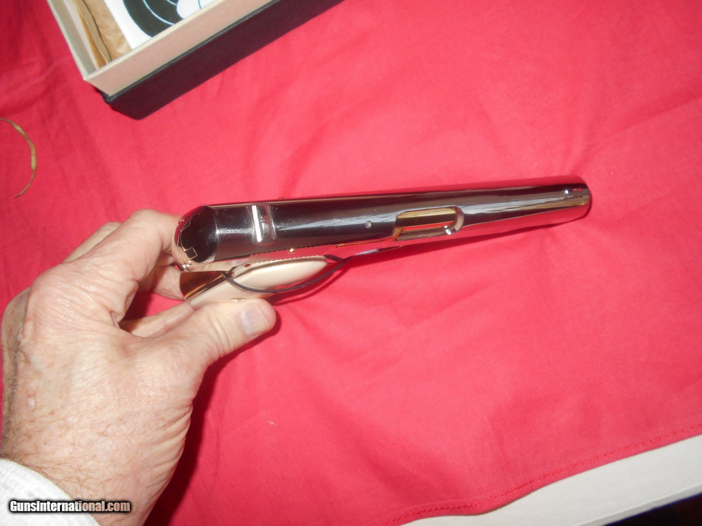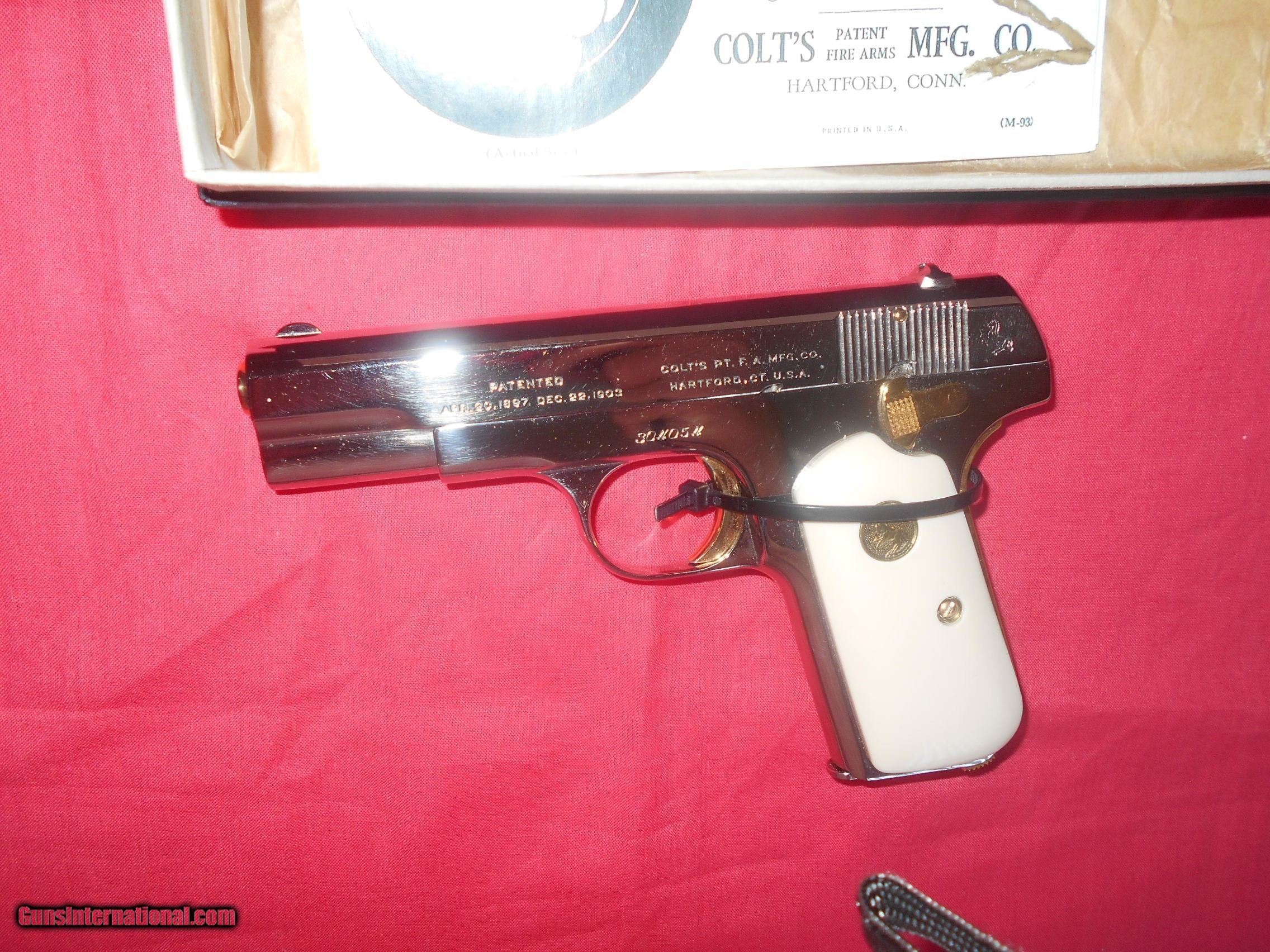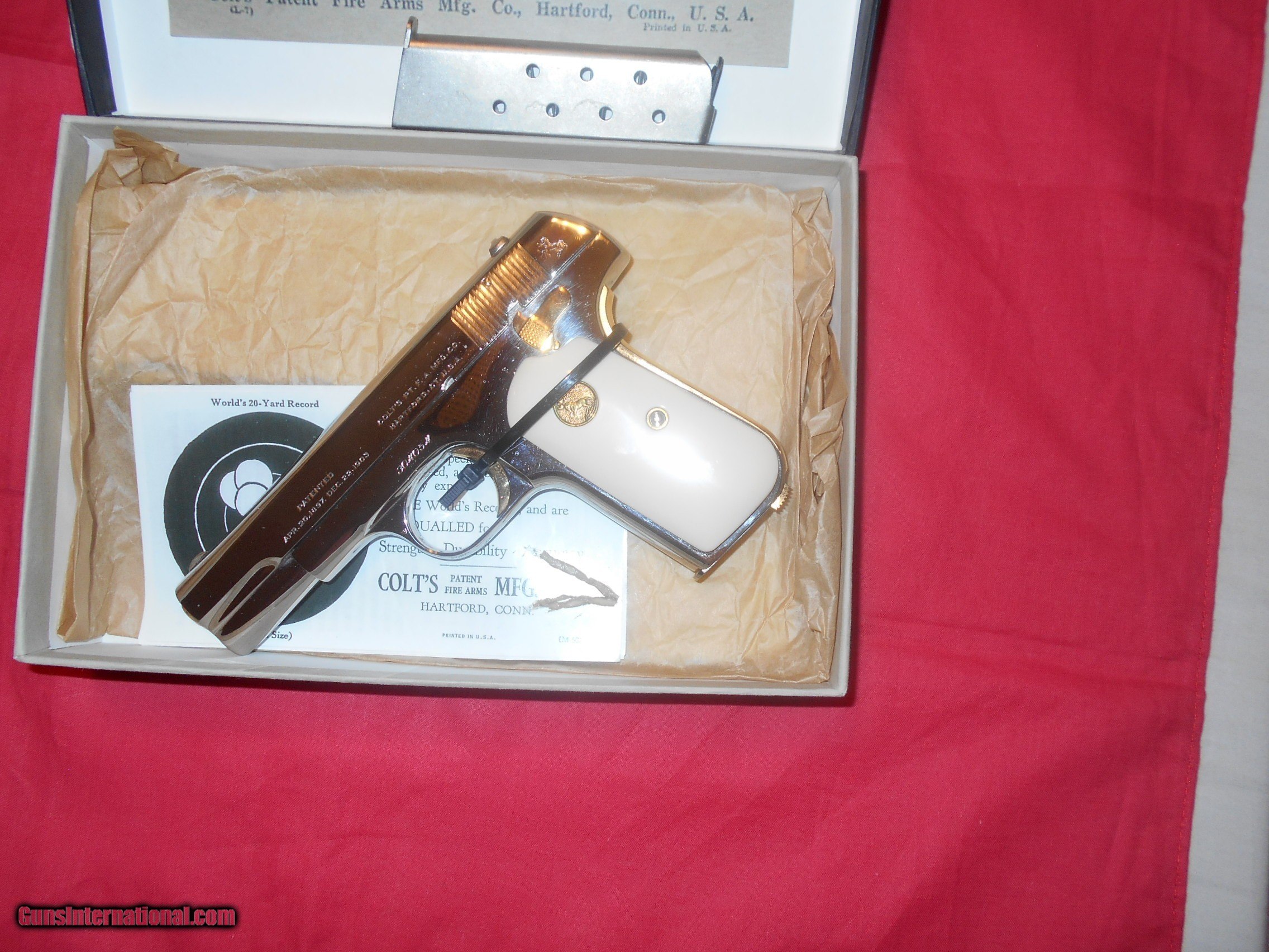 Description: Colt 1903 APC Nickel & Gold Acc. Like new in box.Bright org. nickel with later gold (99%) come with pearllite grips also come with Two clips ( Made 1920) $1750 +shipping There can be a restocking fee SOLD Handgun Caliber: .32 ACP (7.65x17mm Browning SR) Manufacturer: Colt Model: 1903 Bore: EX Condition: EX Metal Condition: EX Barrels: EX Finish: Nickel |