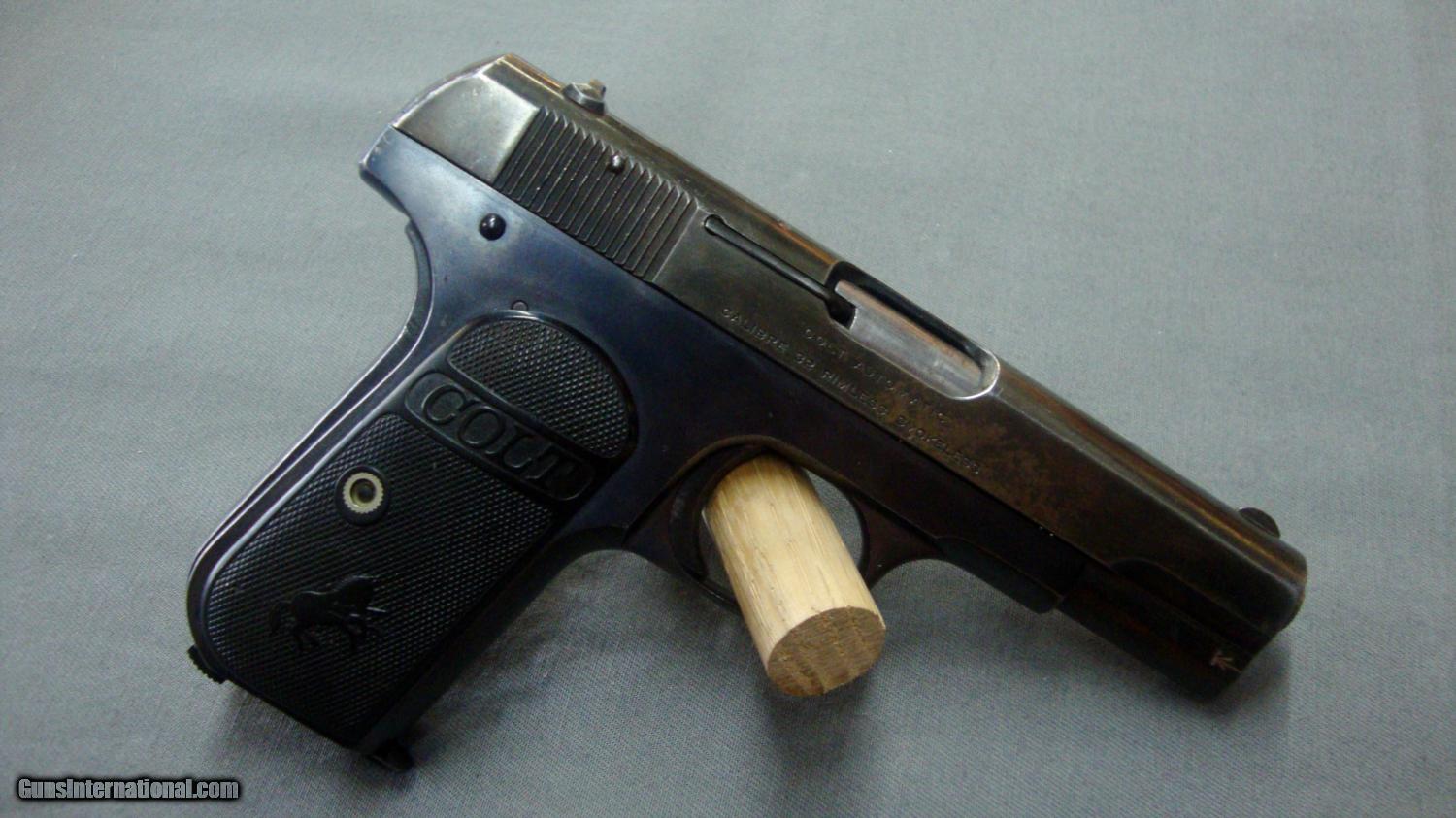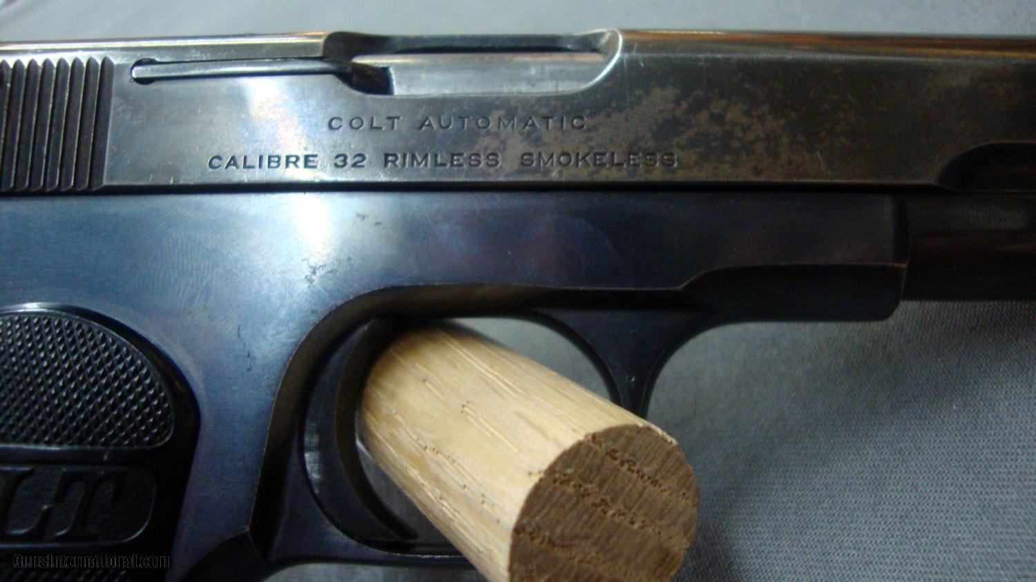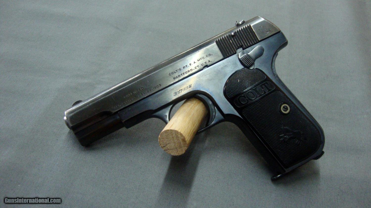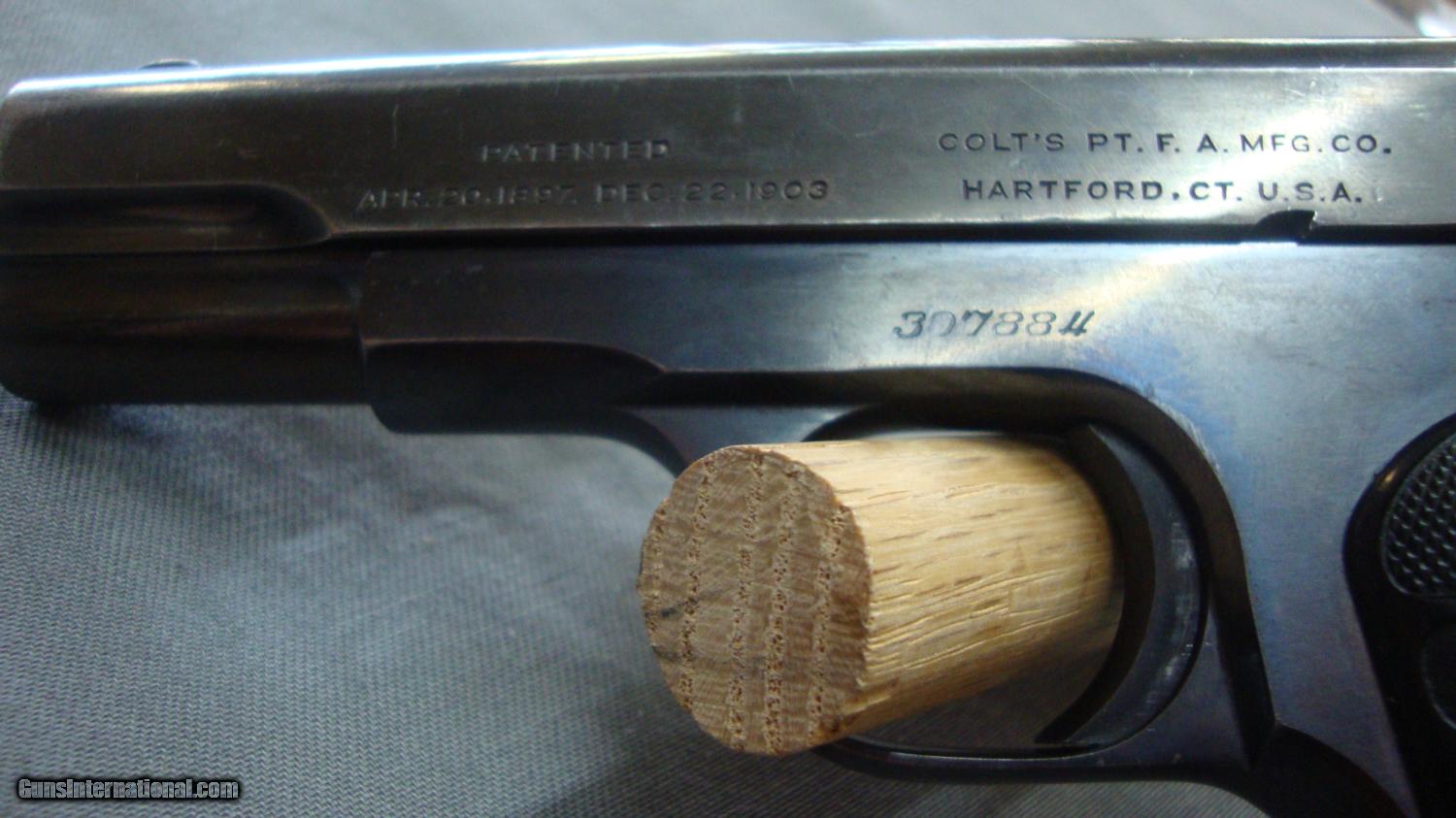 Description: Colt 1903 .32 ACP Manufactured in 1919 Serial# 307884 3-3/4" barrel Blued frame and slide Colt black hard rubber grips SOLD |