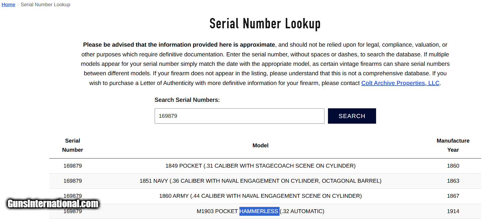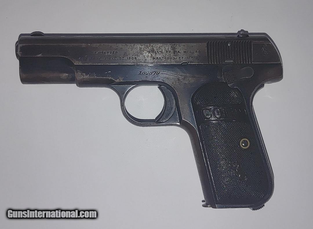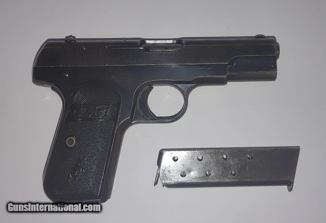 Description: Guns Listing ID: 497288 The Colt Model 1903 Pocket Hammerless is a .32 ACP caliber, self-loading, semi-automatic pistol designed by John Browning and built by Colt Patent Firearms Manufacturing Company of Hartford, Connecticut. The hammer is covered and hidden from view under the rear of the slide, which allows the pistol to be carried in and withdrawn from a pocket quickly and smoothly without snagging. This pistol was manufactured in 1914. It has one 8 rd magazine. SOLD Manufacturer: COLT Model: 1903 Caliber Info: .32 ACP Condition: Used - Non-Certified Barrels: 3 Action: SEMI AUTOMATIC Finish: black |