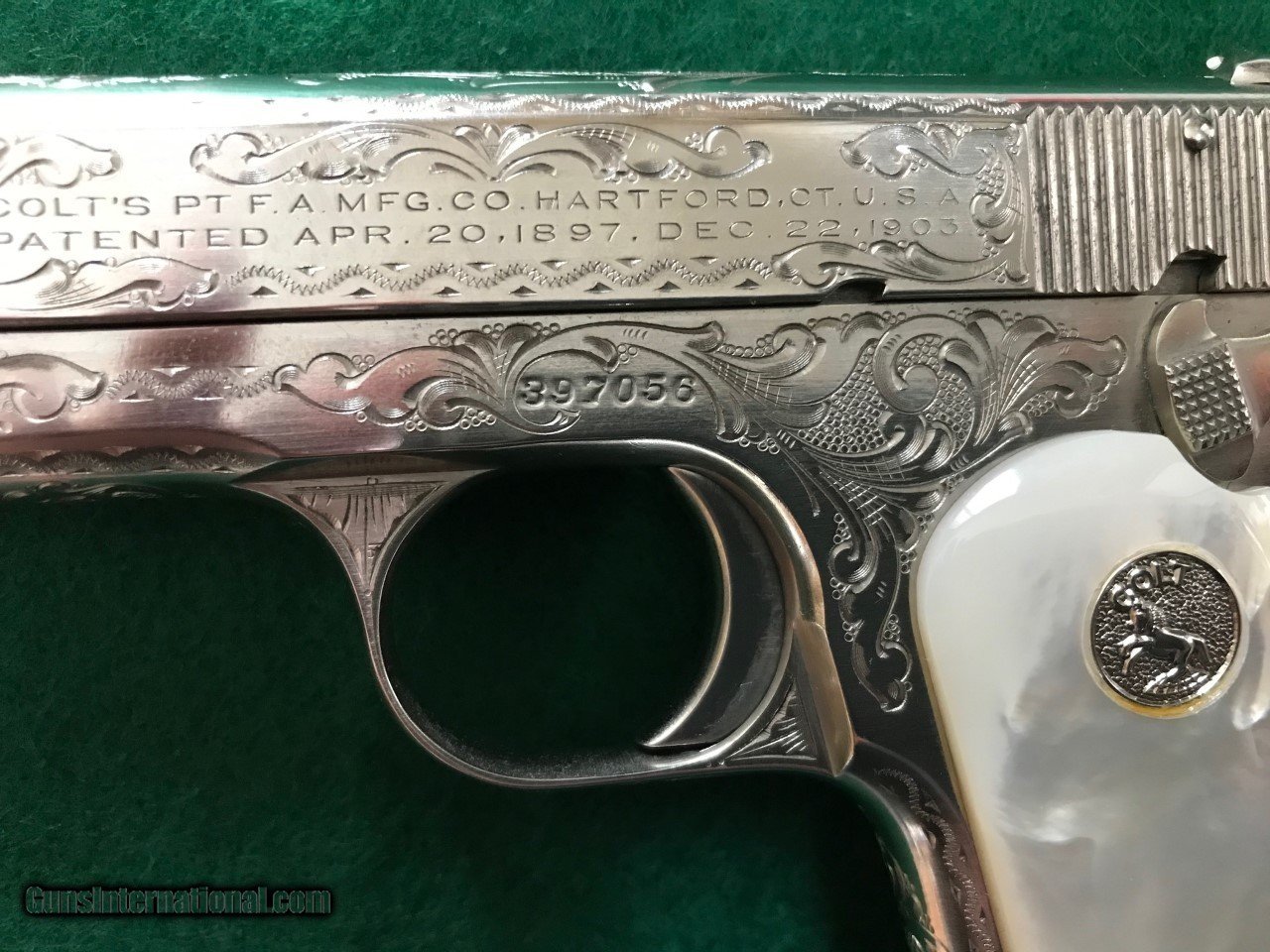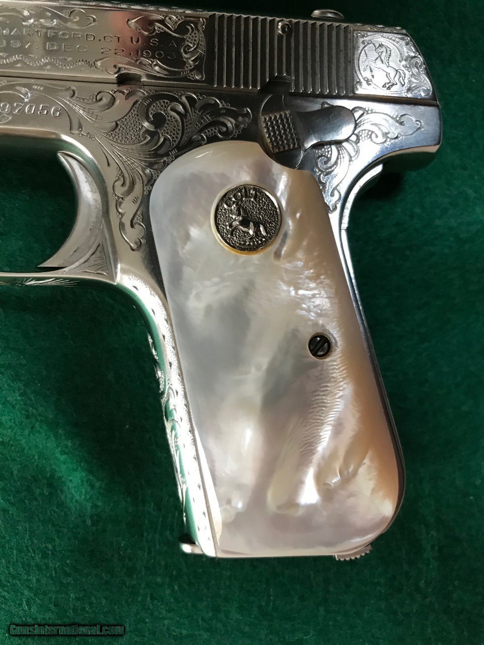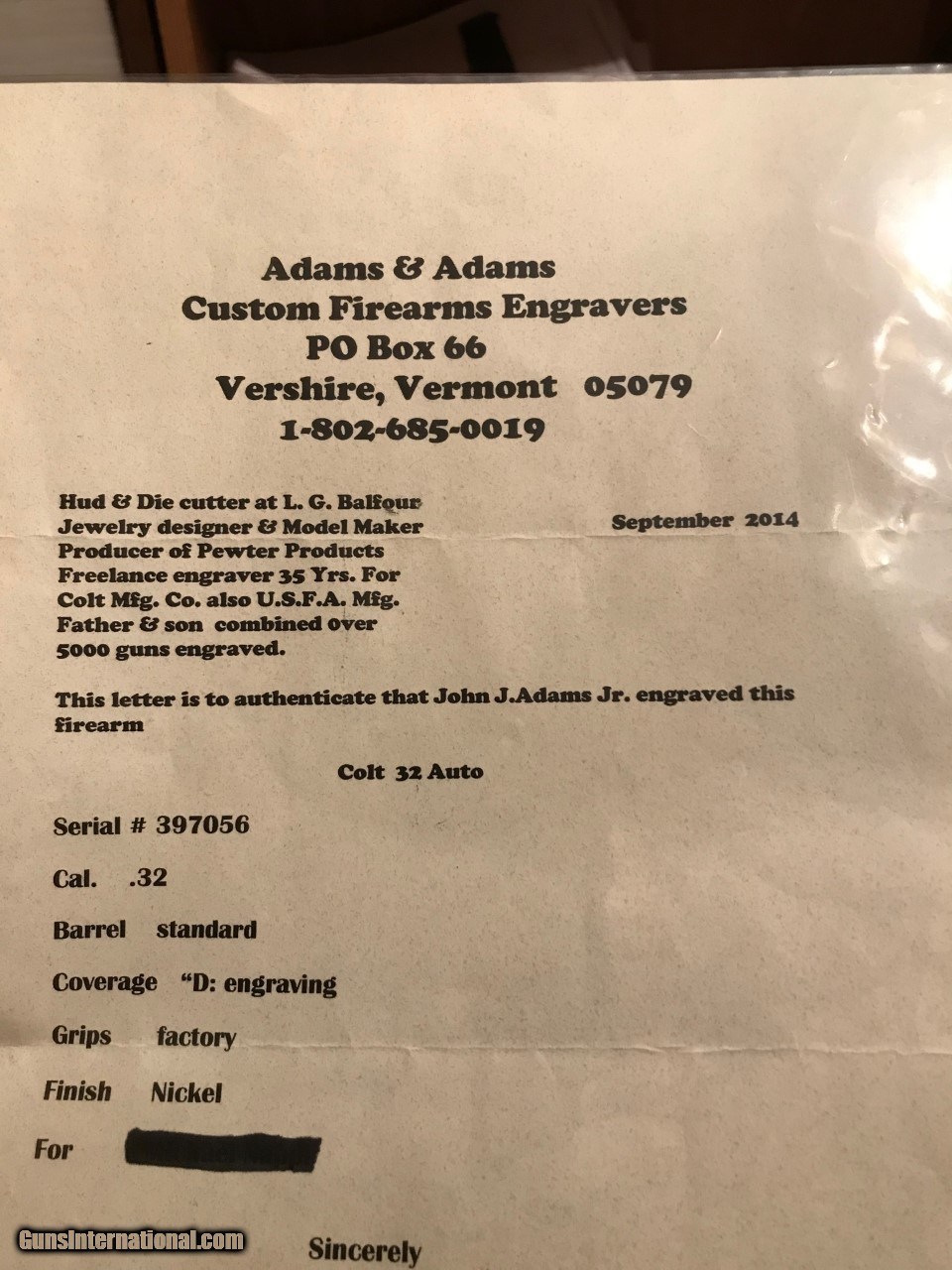 Description: Colt 1903 .32 calibre Mfg in 1921 Ser # 397,056 Fully engraved in nickel finish By engraver J.J. Adams Jr. as the letter states. Its a very attractive engraving job by John Adams , High percentabe of engraving as the pictures show. It functions perfect and has a good bore for its age. It has very nice modern figured Mother of pearl grips with Colt Medalions. A beauty of a classic 1903 .32 Auto . This piece looks nicer in person, nic is hard to phograph . Call with any questions anytime , Tom 612 859 5673 may 25th is the last day for this gun to be listed, if not sold im planning to keep it, thanks for looking. SOLD Curio/Relic: Yes |