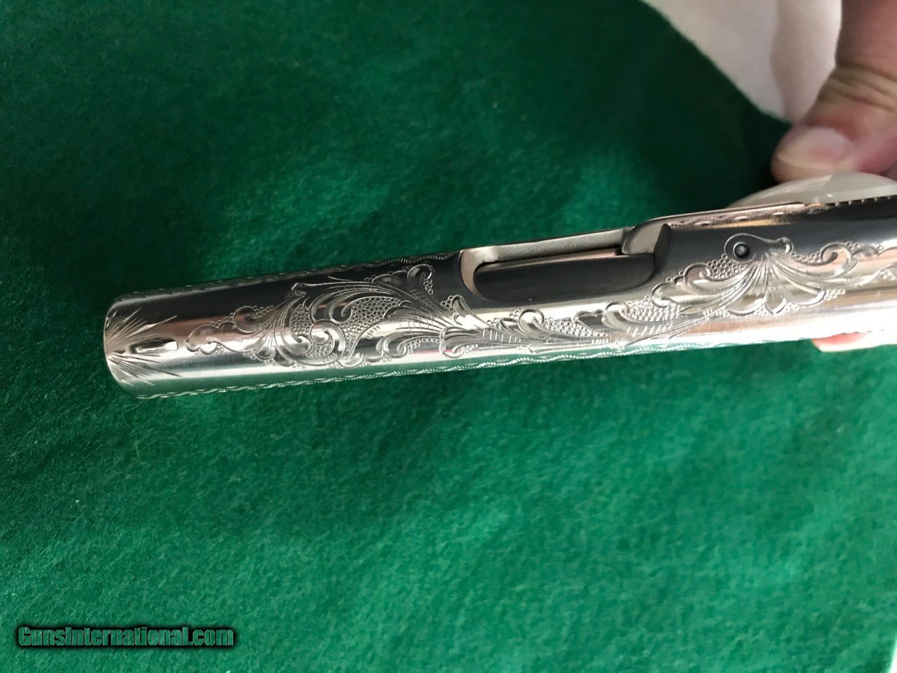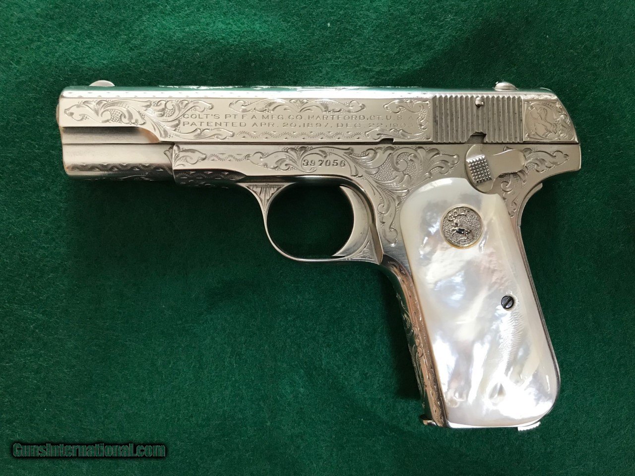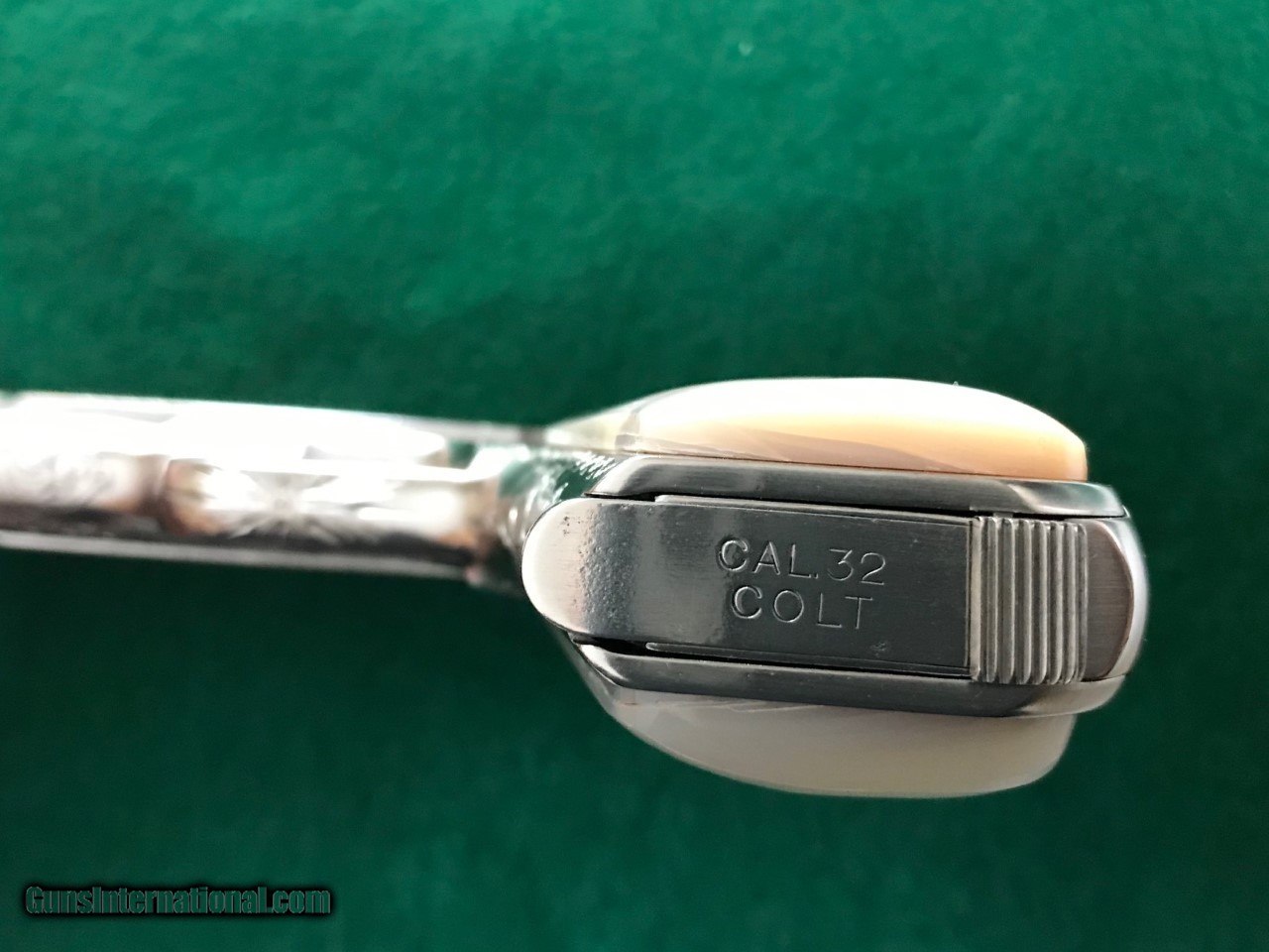 Description: Colt 1903 .32 calibre Mfg in 1921 Ser # 397,056 Fully engraved in nickel finish By engraver J.J. Adams Jr. as the letter states. Its a very attractive engraving job by John Adams , High percentabe of engraving as the pictures show. It functions perfect and has a good bore for its age. It has very nice modern figured Mother of pearl grips with Colt Medalions. A beauty of a classic 1903 .32 Auto . This piece looks nicer in person, nic is hard to phograph . Call with any questions anytime , Tom 612 859 5673 may 25th is the last day for this gun to be listed, if not sold im planning to keep it, thanks for looking. SOLD Curio/Relic: Yes |