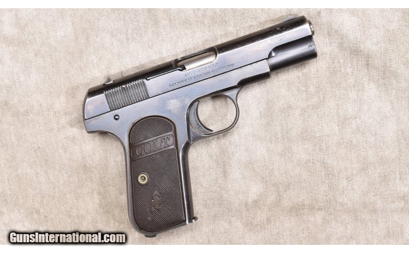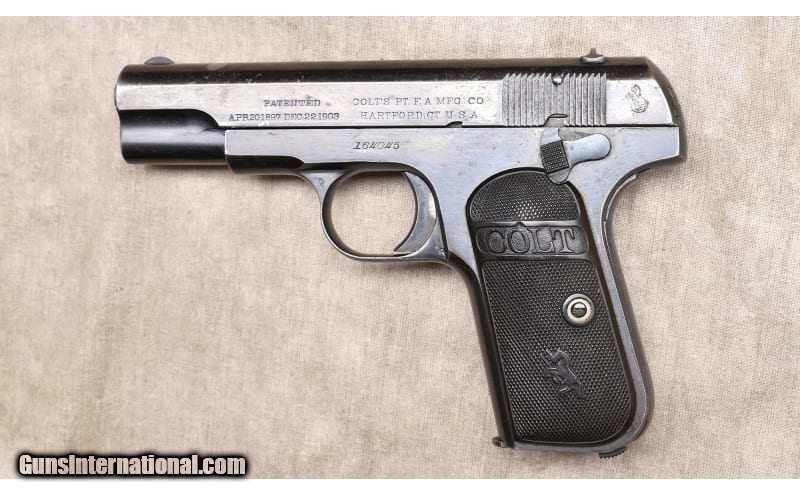 Description: This features the slim profile that made this so popular as a carry pistol on both sides of the law. Fixed sights, and easy to use. It comes with the appropriate blue cardboard box and the instruction sheet/manual. .32 ACP SOLD Curio/Relic: Yes Chambers: 8-round magazine Metal Condition: "Good. There is blue wear on the edges and high points, some pitting on the left side. Wood Condition: Very good. Sharp logos. Bore Condition: Shiny and bright with good rifling. Barrels: 3-3/4 inch Triggers: Factory single action trigger Butt Pad: Black plastic with Colt and Rampant Colt logos. Weight: 24 oz. Sights: Fixed low-profile post and notch. Item Location: Rogers |