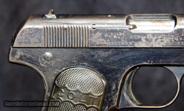 Description: .32acp, #58887, 4 inch barrel, blue finish, 2 piece hard rubber grips, original sights, correct 2 tone magazine, 1907. Condition: excellent bore, 80% blue overall, some surface blemishes, excellent grips, excellent mechanically, excellent marks. SOLD Curio/Relic: Yes |