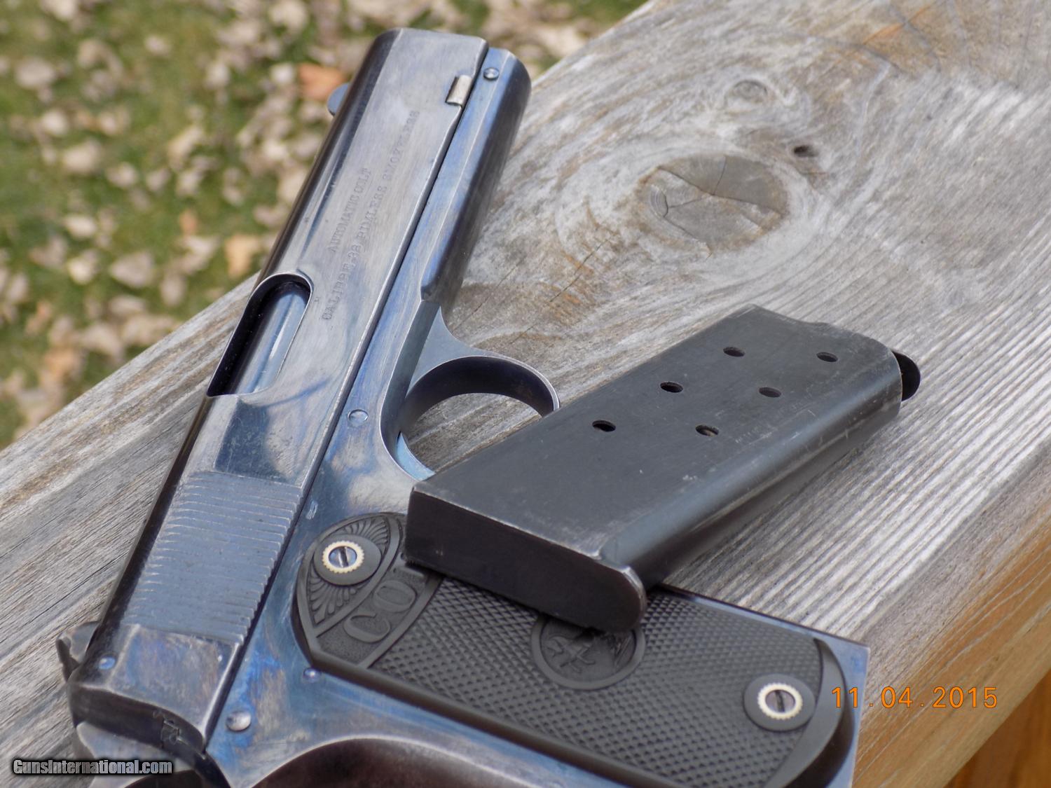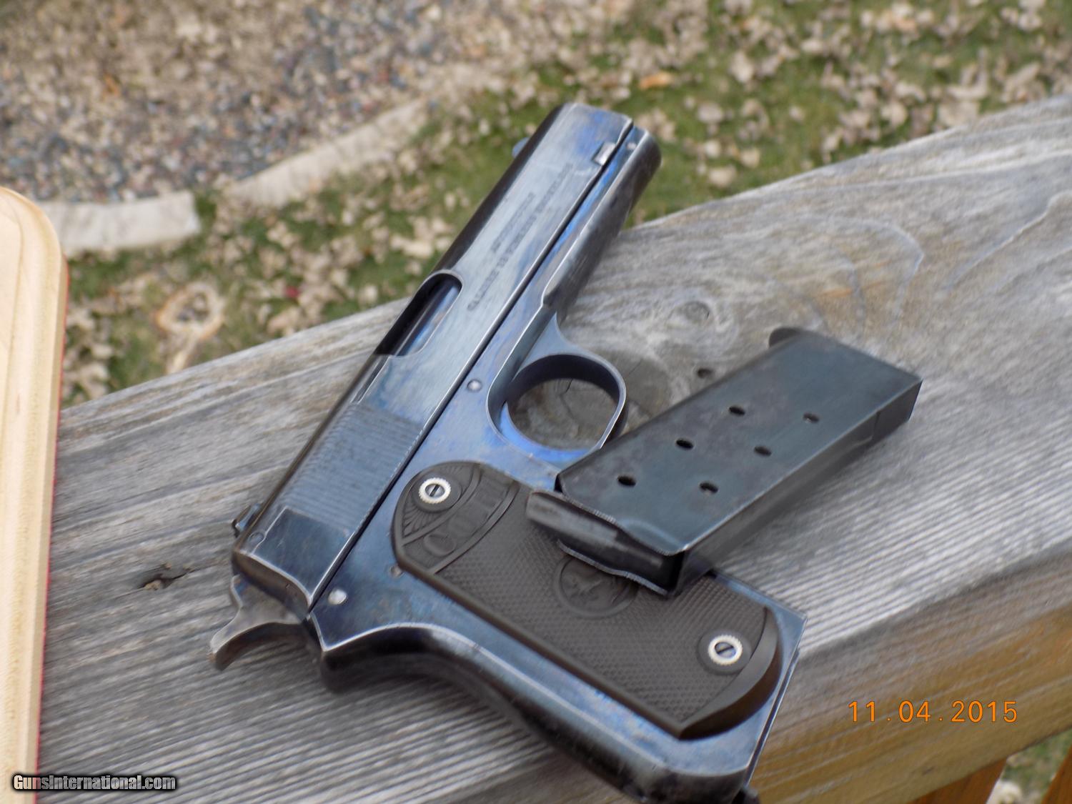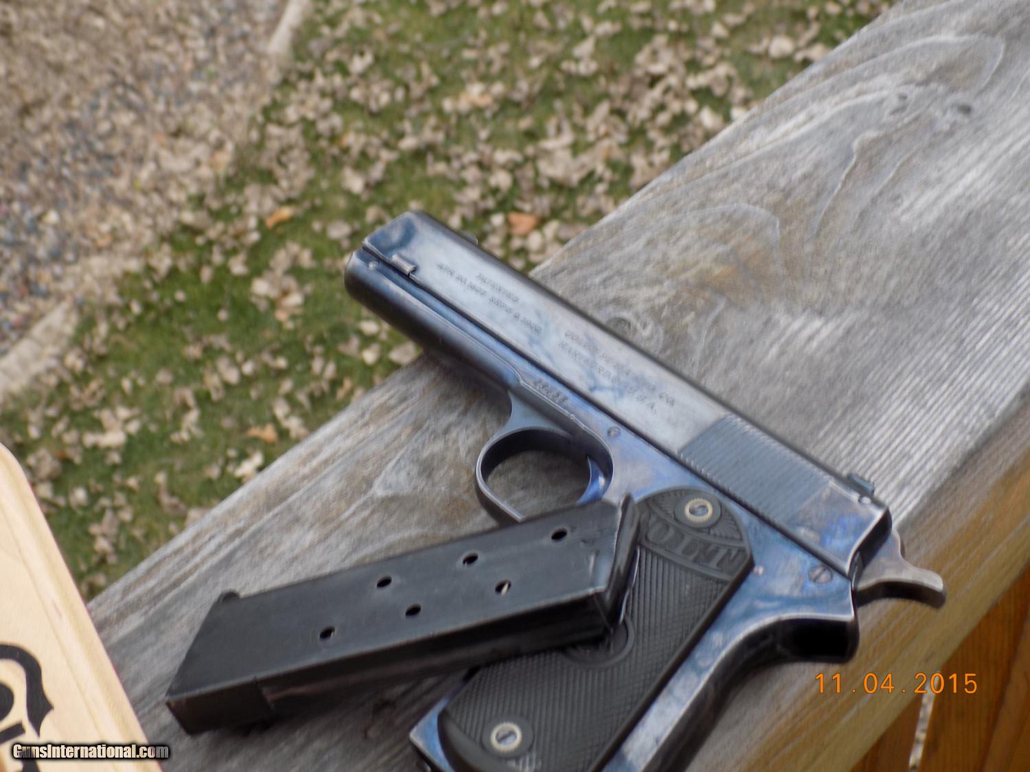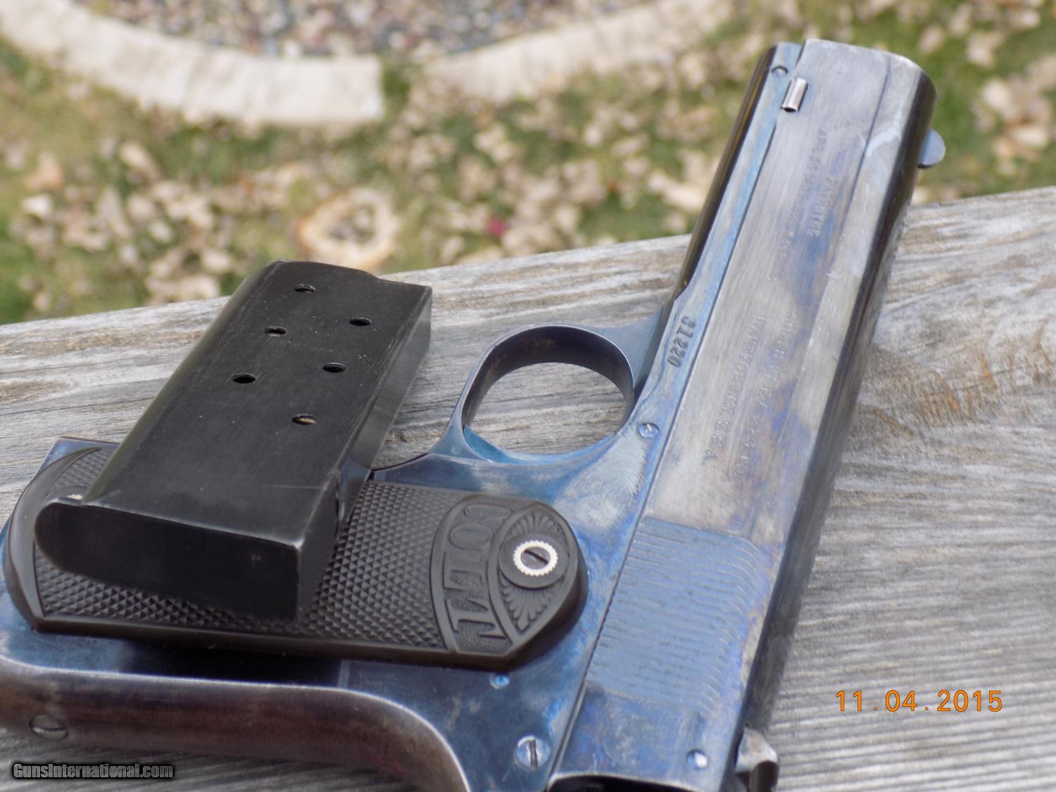 Description: Colt 1903 Pocket Hammer ..38 Auto. I have 2 high condition Pocket Hammers with the early high polish finish. These Colts are very seldom found in this condition. This finish was very fragile and the majority of examples with this finish are in poor conditrion. The 2 i have are 90 and 95+% with no ugly wear. It is nearly impossible to get quality photos of this finish and requires more photograpy skills than i have. The 90% gun has honest wear only on the front and back straps and it has turned a pleasing plum patina. The slide and frame are quite minty and there are traces of case color on the hammer. Beautiful gun! The 95% gun has minior handling marks with minimal wear on the front and back straps. Strong case color on the hammer. The condition of the guns aside from the front and back strap of the one pistol is near identical so i used pictures of both guns to get 10 + photos. Buyer pays $25 shipping to FFL C&R OK 95% sold 90% sold Open to offers SOLD Curio/Relic: Yes |