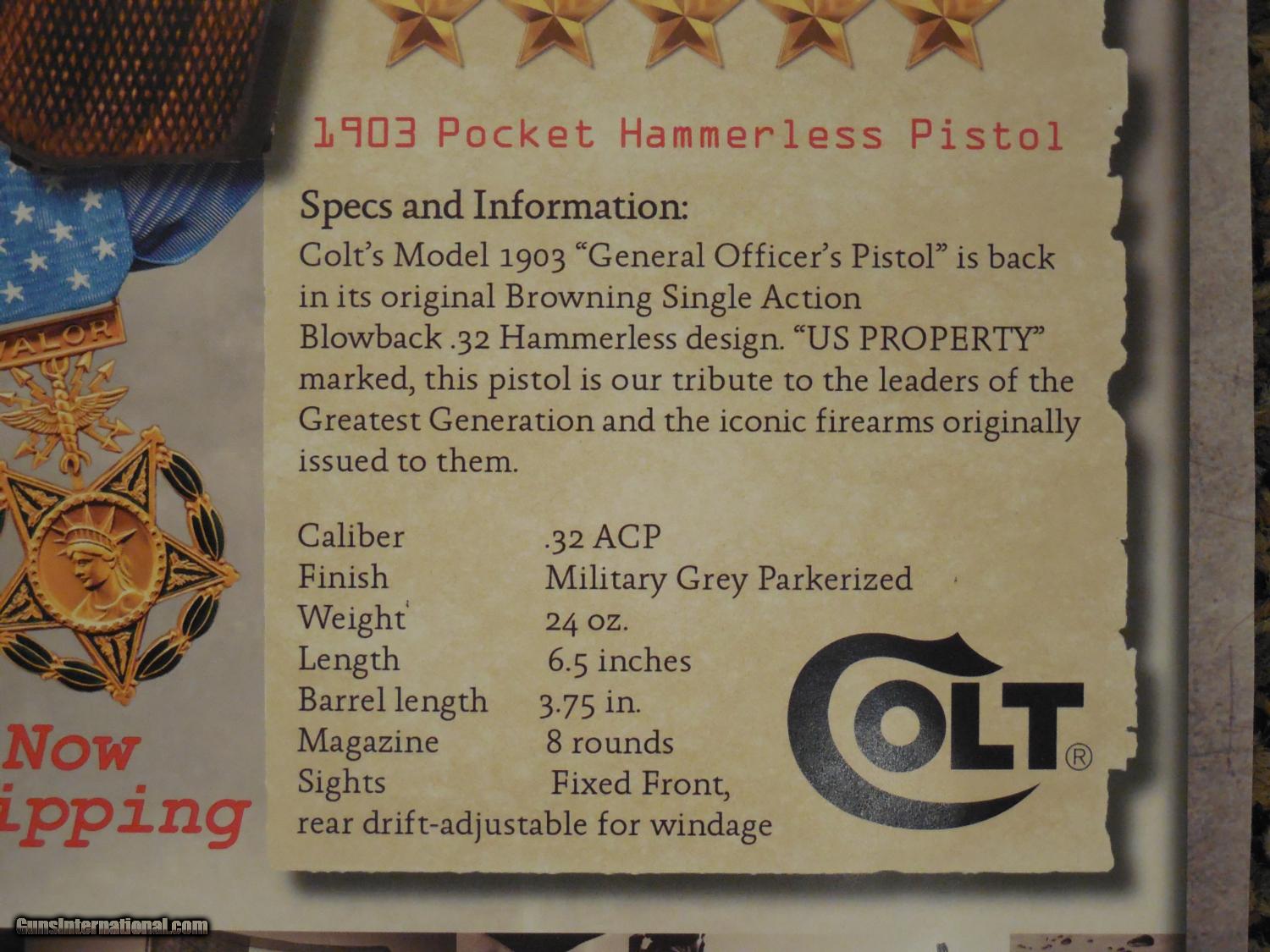 COLT 1903 POCKET HAMMERLESS .32 ACP "GENERAL OFFICER'S PISTOL MARKET "US PROPERTY