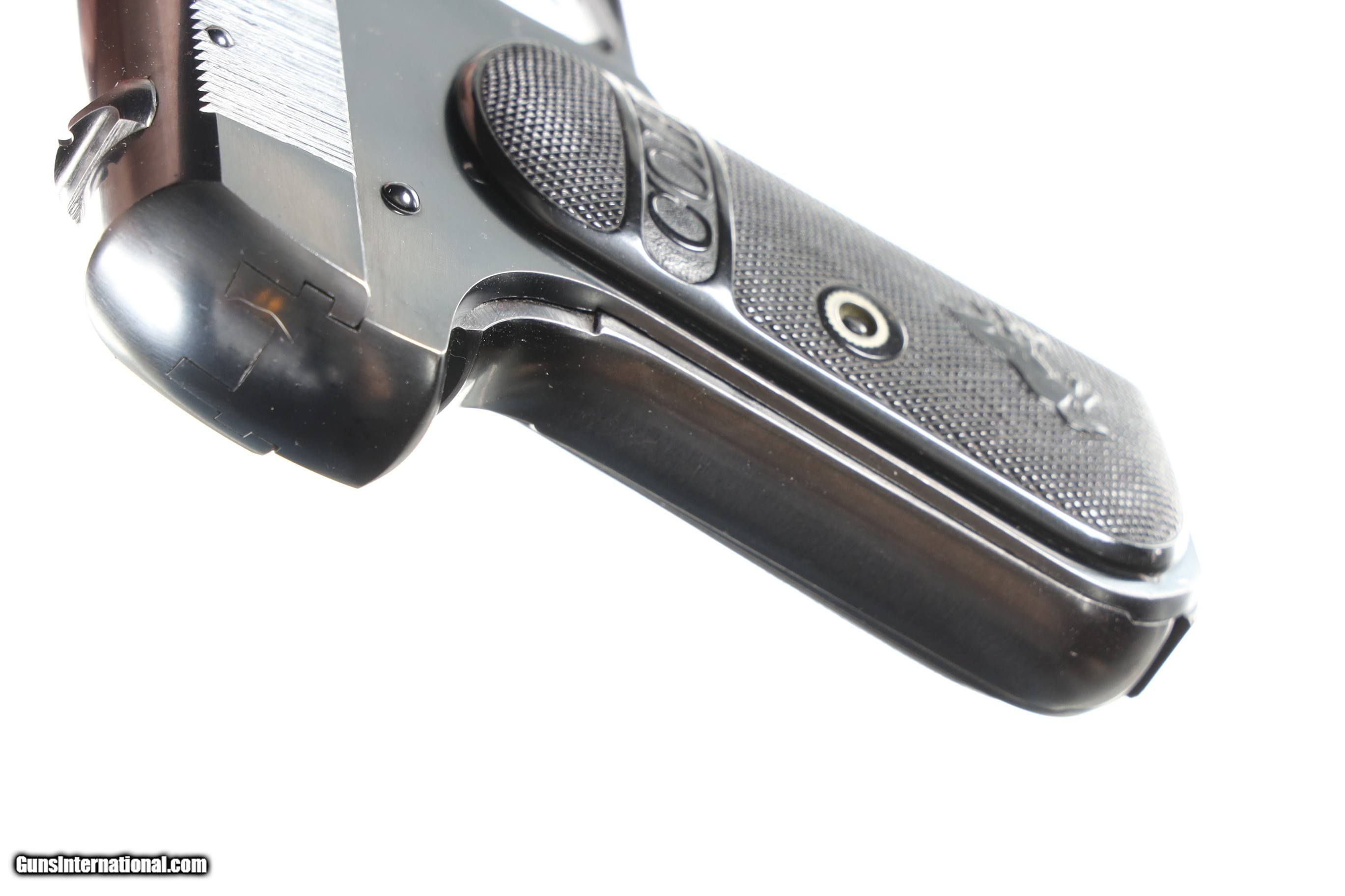 Description: Colt produced Model 1903 Pocket Hammerless .32 with 2 piece checkered plastic grips with Rampant Colt monogram. Matching serial number on slide and frame. 3rd model with factory 2 tone magazine with base marked "CAL 32 COLT" Blade front sight with drift adjustable rear sight. Housed in factory original box with partial label and no number on underrside. Interior has Colt banner and full instruction paperwork. Condition, Exceptionally fine with pistol retaining 98%+ blue finish with some slight edge wear visible under bright light. a couple small dings are present on front strap. Grips are excellent. Bore is bright with sharp rifling. Magazine is very fine. Box is good with tape repairs and lightly soiled interior. Mechanically excellent. C&R • Free Shipping, No Credit Card Fees. • Lay-a-way available for this firearm. • 1/3 Down, a 1/3 in 30 Days, 1/3 in 60 Days. SOLD Curio/Relic: Yes Handgun Caliber: .32 ACP (7.65x17mm Browning SR) Manufacturer: Colt Model: 1903 Pocket Hammerless Serial Number: 413358 Barrel Length: 3 3/4 |