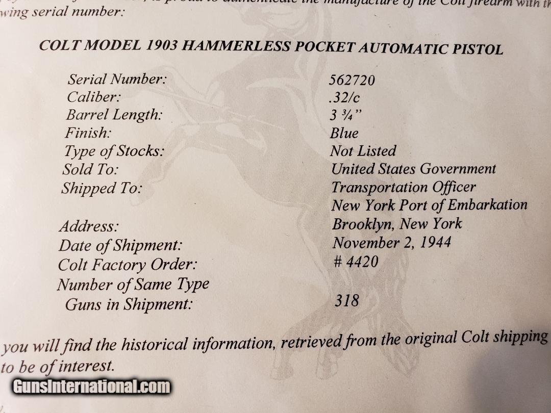 COLT 1903 POCKET HAMMERLESS US. PROPERTY