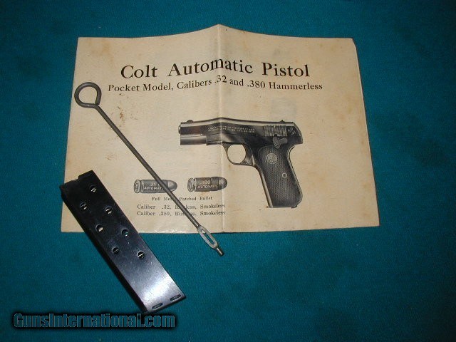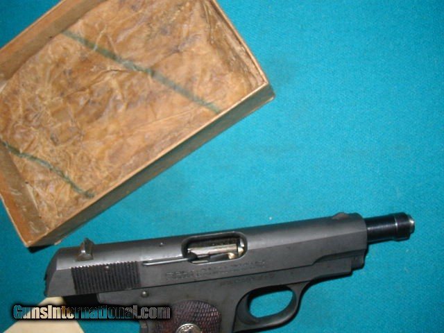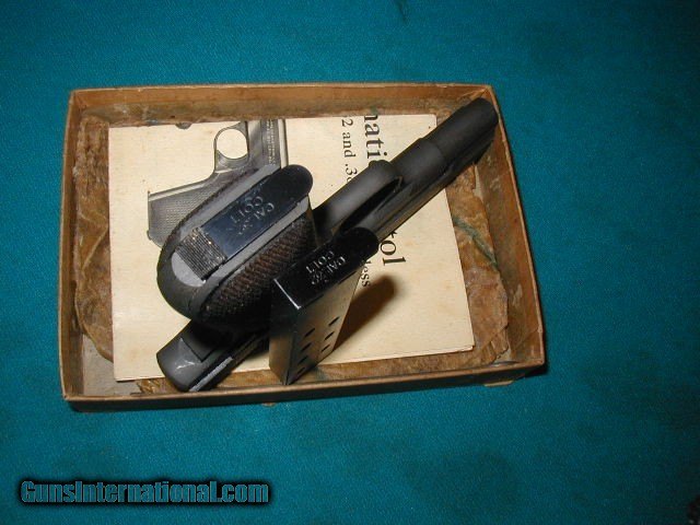 Description: THIS IS A MINT, IN THE BOX ALL ORIGINAL COLT .32 U.S. PROPERTY, MFD. IN 1944...IT IS LITERALLY UNFIRED, WITH ALL THE COSMOLINE IN THE ACTION THROUGHOUT...IT HAS IT'S ORIGINAL NUMBERED BOX AND A FACTORY LETTER. ALSO INCLUDED, IS THE CORRECT FULL BLUE EXTRA MAG, BROCHURE, PACKING PAPER AND CLEANING ROD... COULD NOT BE UP-GRADED. LIKE NEW, C&R OK SOLD Curio/Relic: Yes |