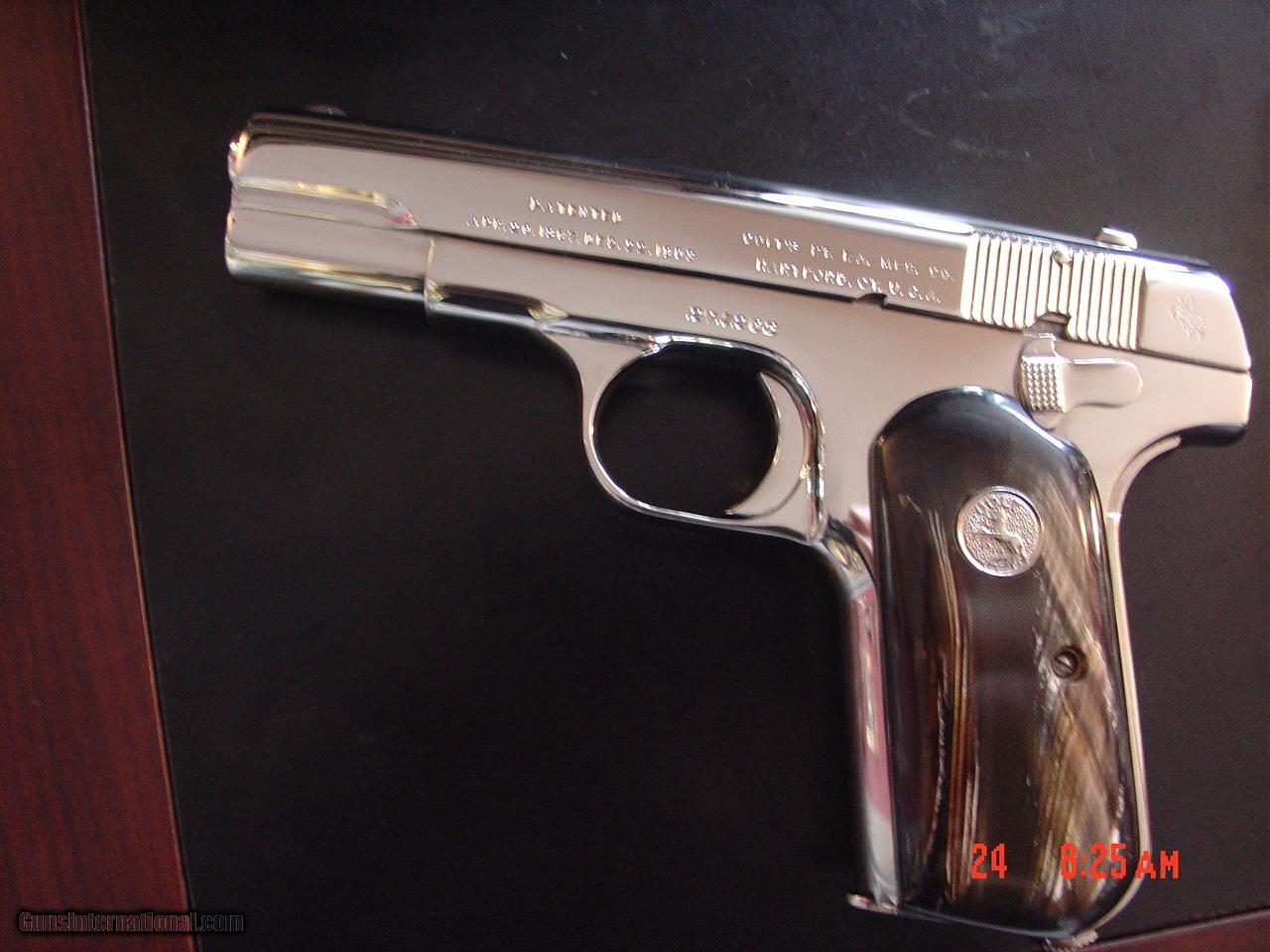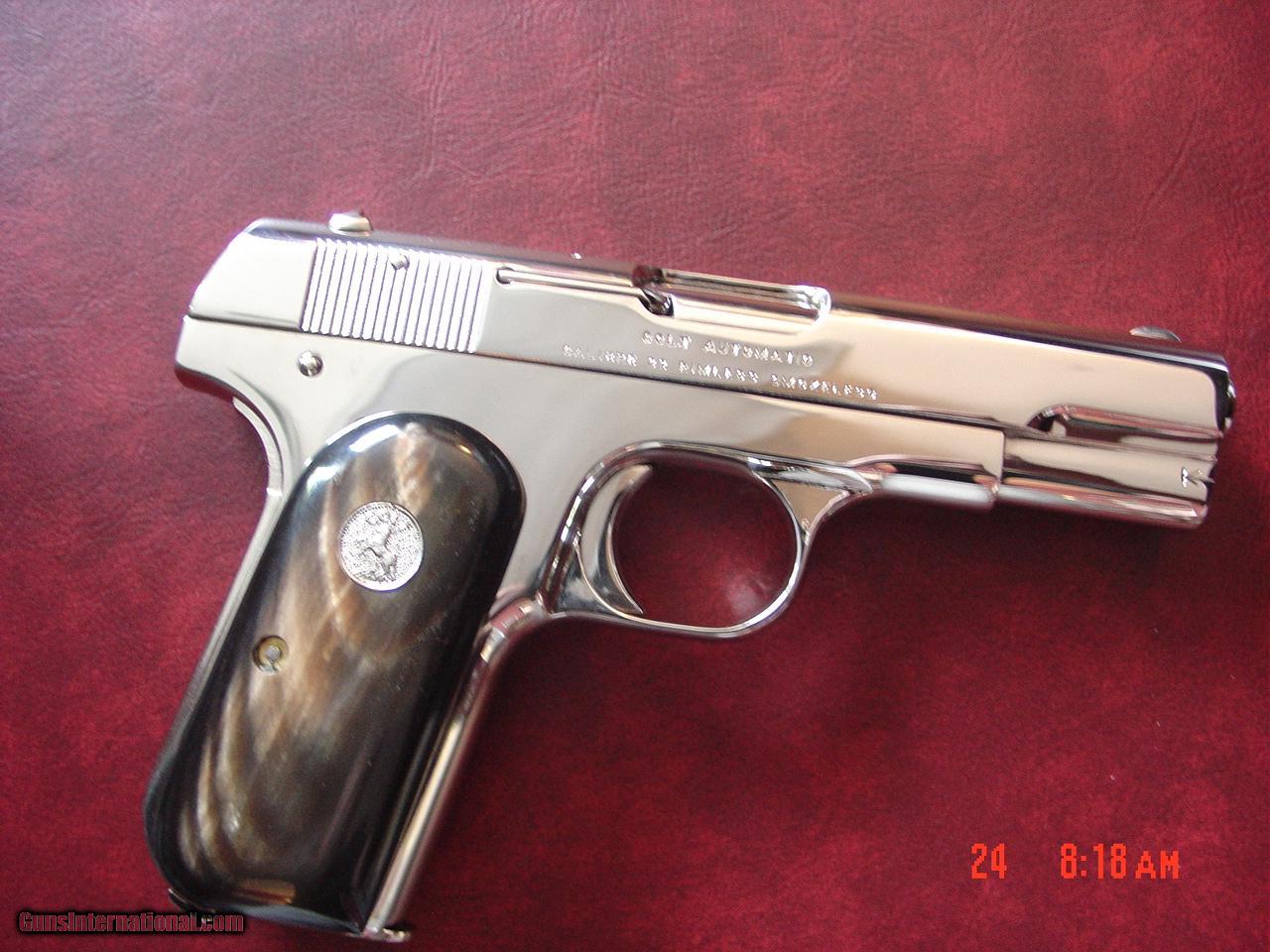 Colt 1903 with genuine Ox Horn grips, 32 ACP,fully refinished in bright nickel,grip safety,hammerless,, made circa 1918. 99 years old & a showpiece !!