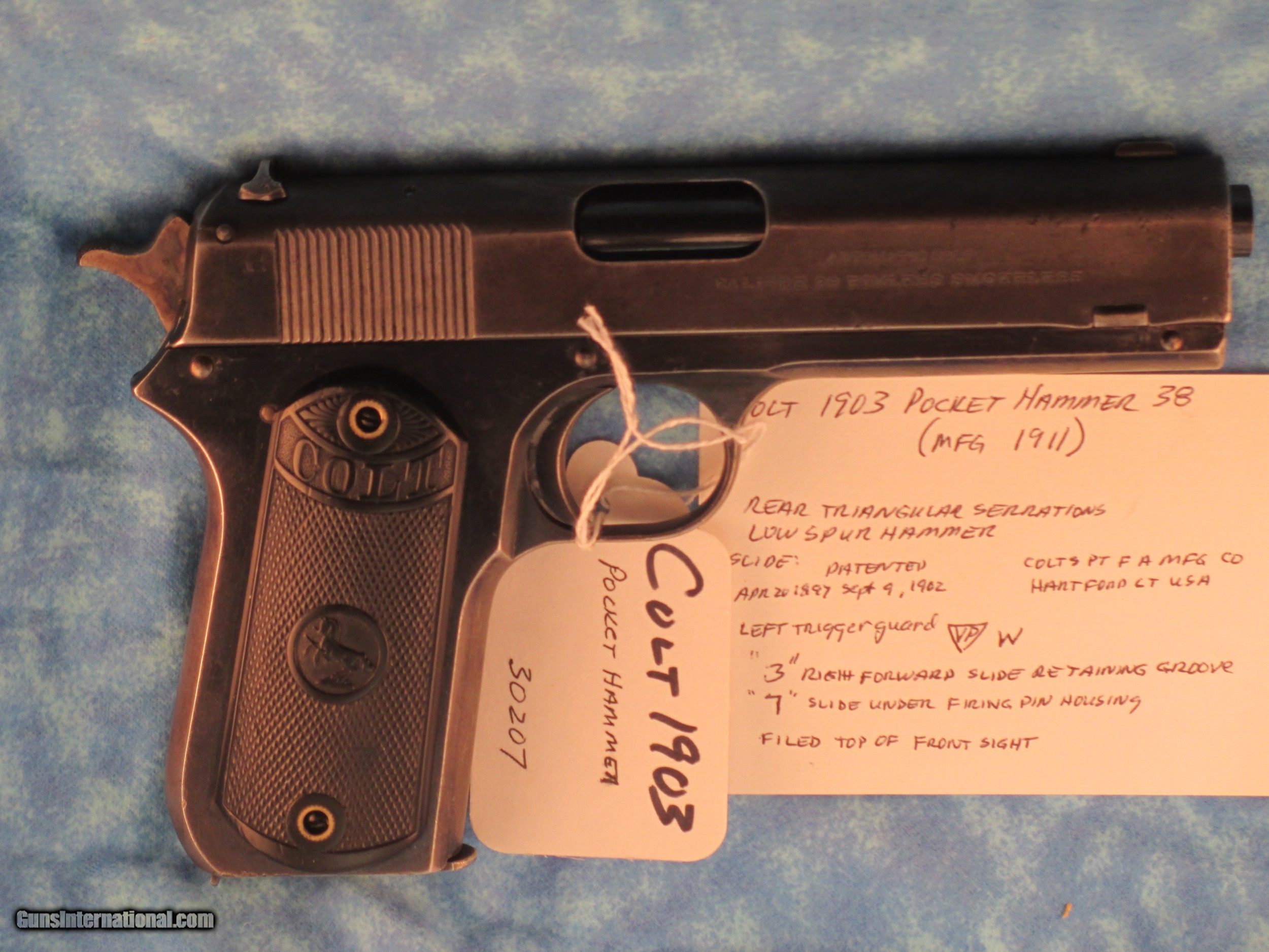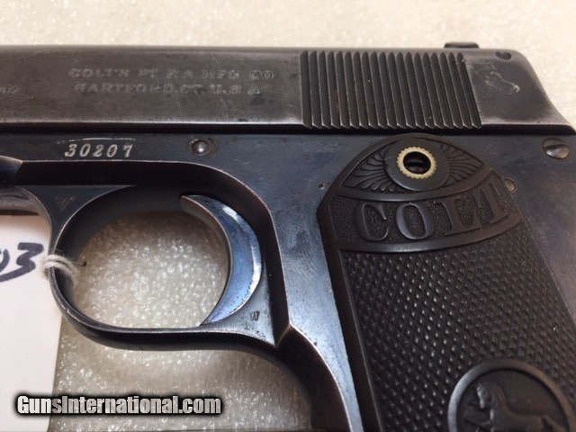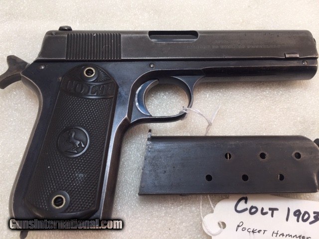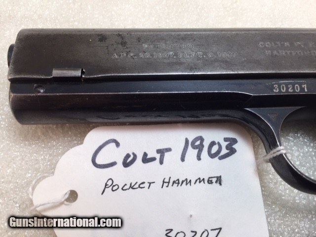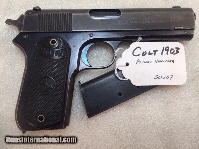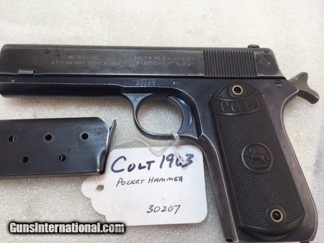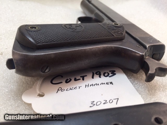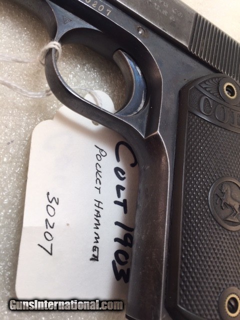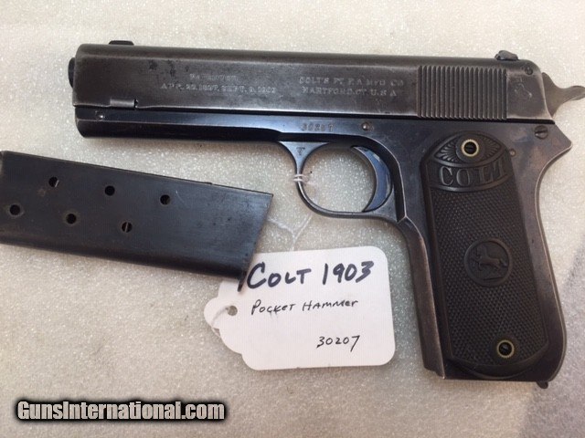 Description: Colt 1903 38 acp Pocket Hammer Description: Nice shape for a 108 year old early Colt auto with high polish especially on the frame and some fire blue on trigger. Colt Model 1903 Pocket Hammer 38 acp pistol. Functions and shoots well. Only 31,250 total manufactured from 1903 to 1927. Manufactured 1911 Weight 31 oz OAL length 7.5" Barrel length 4.5" good and shiny clean bore Mag: 7 rounds original unmarked blue Low spur checkered hammer Original hard rubber grips are in very good shape w/o cracks or chips. Markings good. Rear triangular slide serrations. Great shooting gangster type gun and these early Colt autos are fun to shoot. Must ship to FFL or C&R if legal in your state and jurisdiction - know your local laws. Shipping insured UPS is $40. See my other Colt listings. Price: $860.00 Curio/Relic: Yes Manufacturer: Colt Model: 1903 Pocket Hammer Serial Number: 30207 Caliber: 38 acp Bore: good Finish: blue. Some fire blue on trigger, high polish especially the frame. Weight: 31 oz Sights: fixed Manufacture Date: 1910 Item Location: NC Grips: Checkered hard rubber. Rampant Colt and banner SOLD Curio/Relic: Yes |