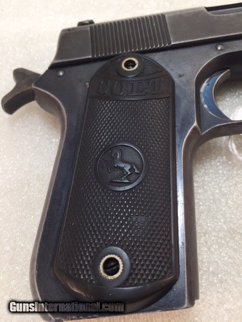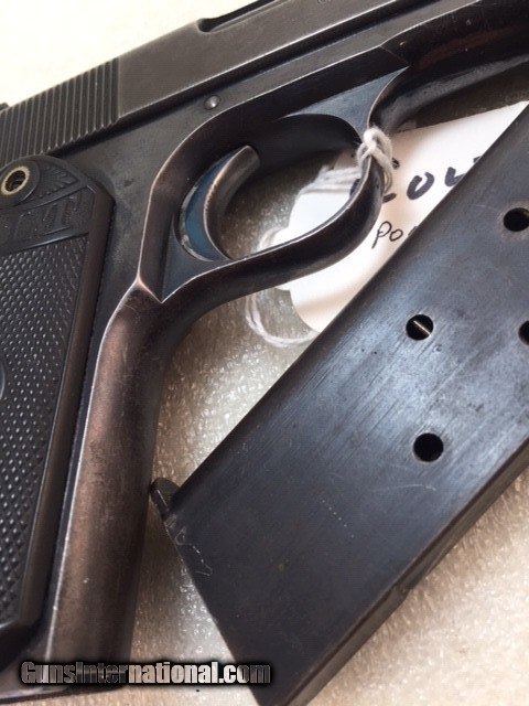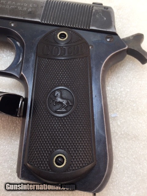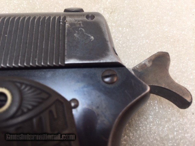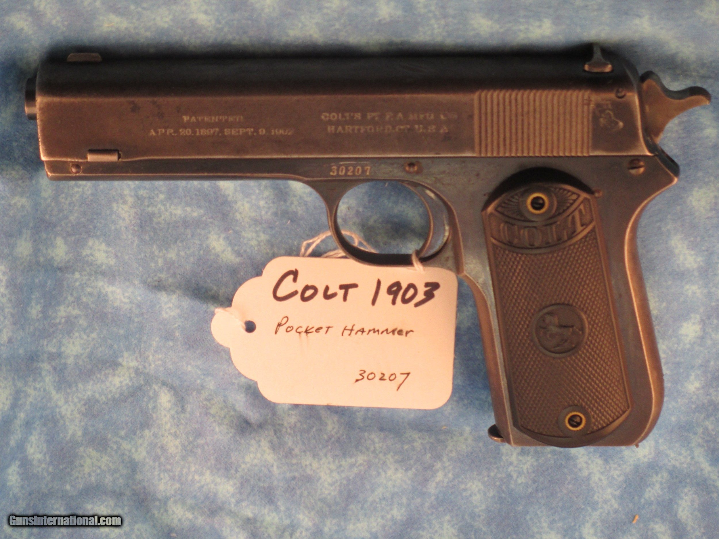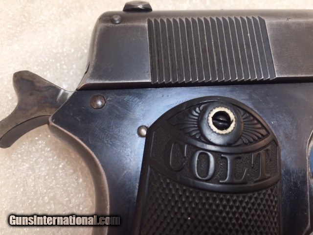 Description: Colt 1903 38 acp Pocket Hammer Description: Nice shape for a 108 year old early Colt auto with high polish especially on the frame and some fire blue on trigger. Colt Model 1903 Pocket Hammer 38 acp pistol. Functions and shoots well. Only 31,250 total manufactured from 1903 to 1927. Manufactured 1911 Weight 31 oz OAL length 7.5" Barrel length 4.5" good and shiny clean bore Mag: 7 rounds original unmarked blue Low spur checkered hammer Original hard rubber grips are in very good shape w/o cracks or chips. Markings good. Rear triangular slide serrations. Great shooting gangster type gun and these early Colt autos are fun to shoot. Must ship to FFL or C&R if legal in your state and jurisdiction - know your local laws. Shipping insured UPS is $40. See my other Colt listings. Price: $860.00 Curio/Relic: Yes Manufacturer: Colt Model: 1903 Pocket Hammer Serial Number: 30207 Caliber: 38 acp Bore: good Finish: blue. Some fire blue on trigger, high polish especially the frame. Weight: 31 oz Sights: fixed Manufacture Date: 1910 Item Location: NC Grips: Checkered hard rubber. Rampant Colt and banner SOLD Curio/Relic: Yes |