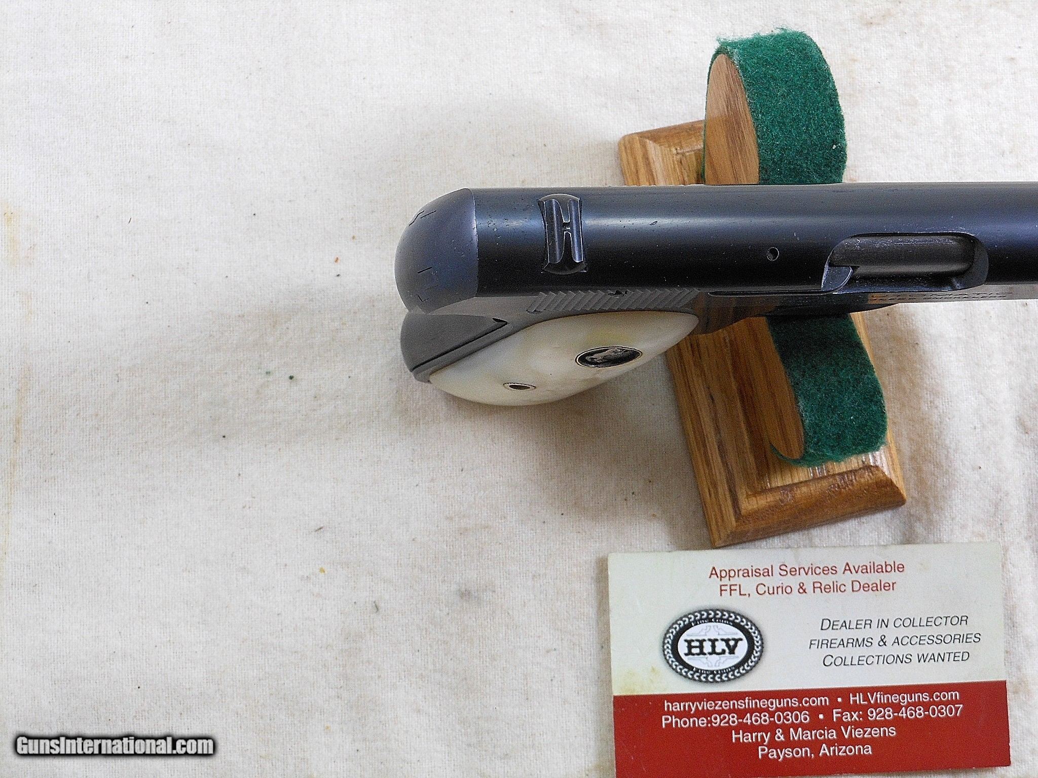 Description: SOLD This Colt was produced in 1923. The pistol's serial number is 436524. It has the standard 3 3/4 inch barrel chambered for the 32 A.C.P. cartridge. The bore is in minty condition. This Colt shows very little sign of being fired. There is a faint loss of bluing on the high point of the front of the slide on both sides. That seems to be all of the blue loss on this Colt. The factory bluing would rate a 98% or better condition. The original correct two tone magazine is in very fine condition. The pearl grips are in new condition. There is no damage or chips on this pair of grips. These grips have nice iridescent looks and finish! These original Colt grips have the correct Colt style mounting plates on the grips back panels. It is fairly rare to see the Colt deep dish medallions on these pearl grips. This is a fine indicator of the pearl grips age. This is certainly a highly collectable Colt with these fine pearl grips! This pistol certainly belongs in a fine gun collection! Curio&Relic BREE (3) F. No. 709-24 SOLD Curio/Relic: Yes Handgun Caliber: .32 ACP (7.65x17mm Browning SR) Manufacturer: Colt Model: 1903 Serial Number: 436524 Barrel Length: 3 3/4 Inch Chambers: Minty Condition: 98% Overall Metal Condition: As New Bore Condition: Minty Barrels: Pistol Barrel Type: Removable Action: Self Loading Finish: Blued Sights: Standard Manufacture Date: 1923 |