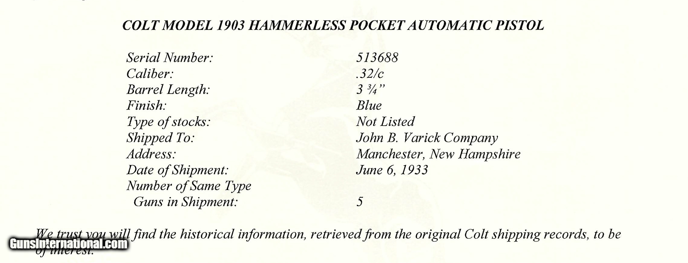 Colt Model 1903 Hammerless Pistol With Factory Letter