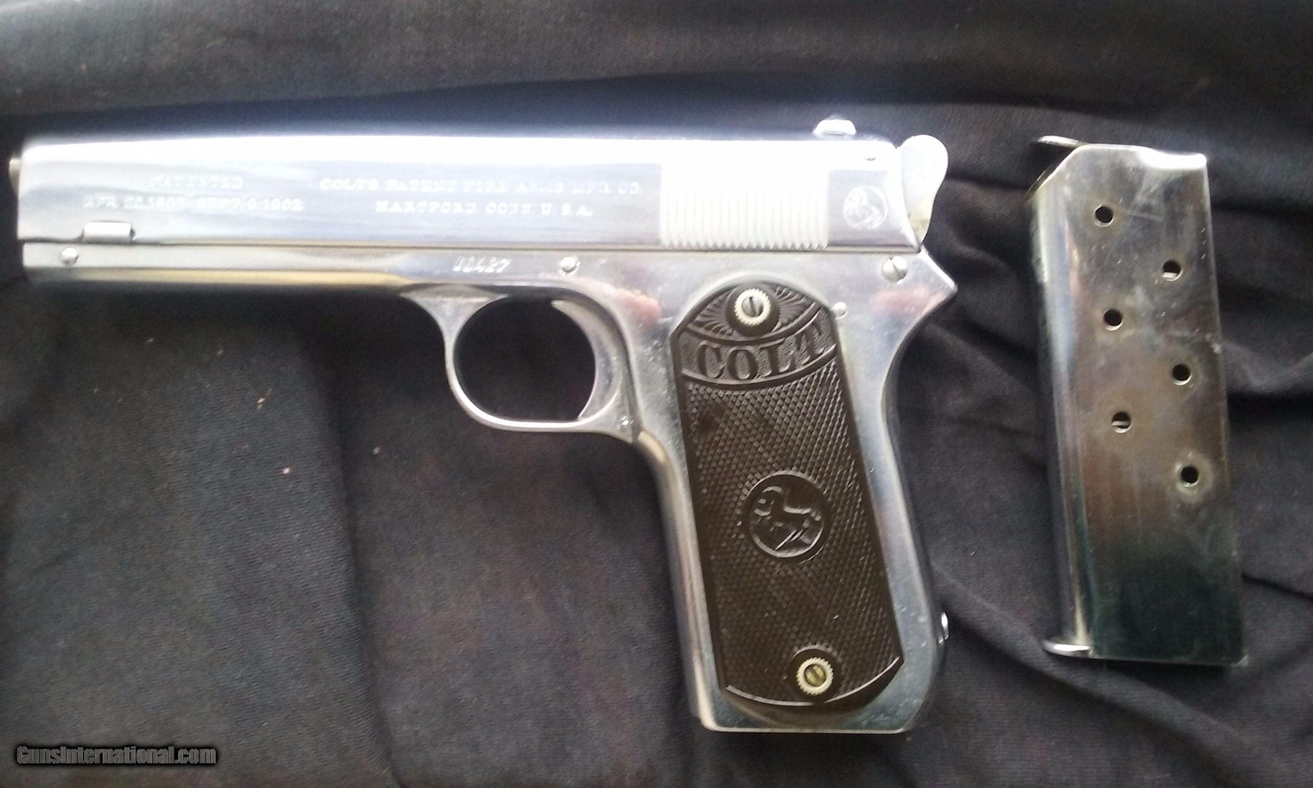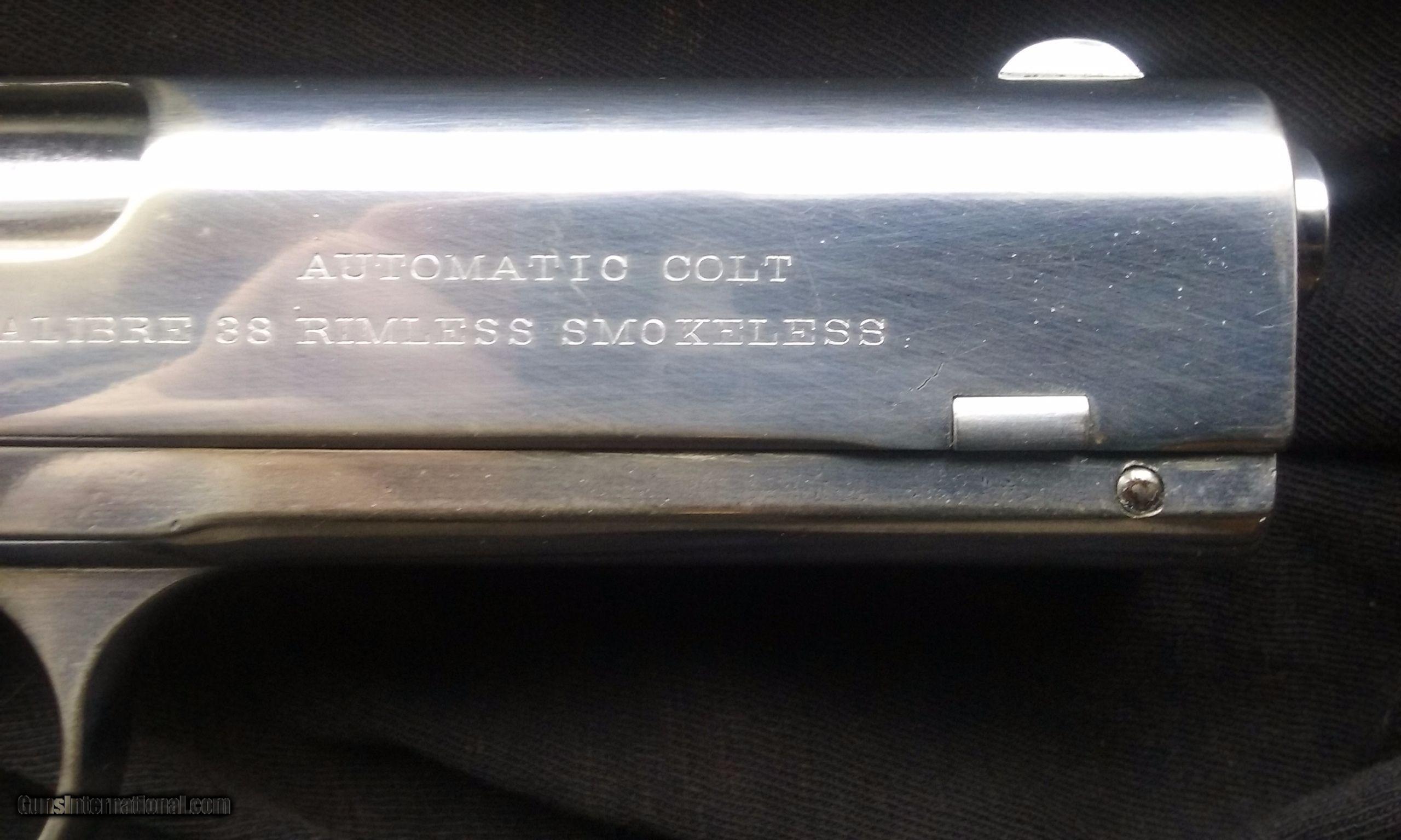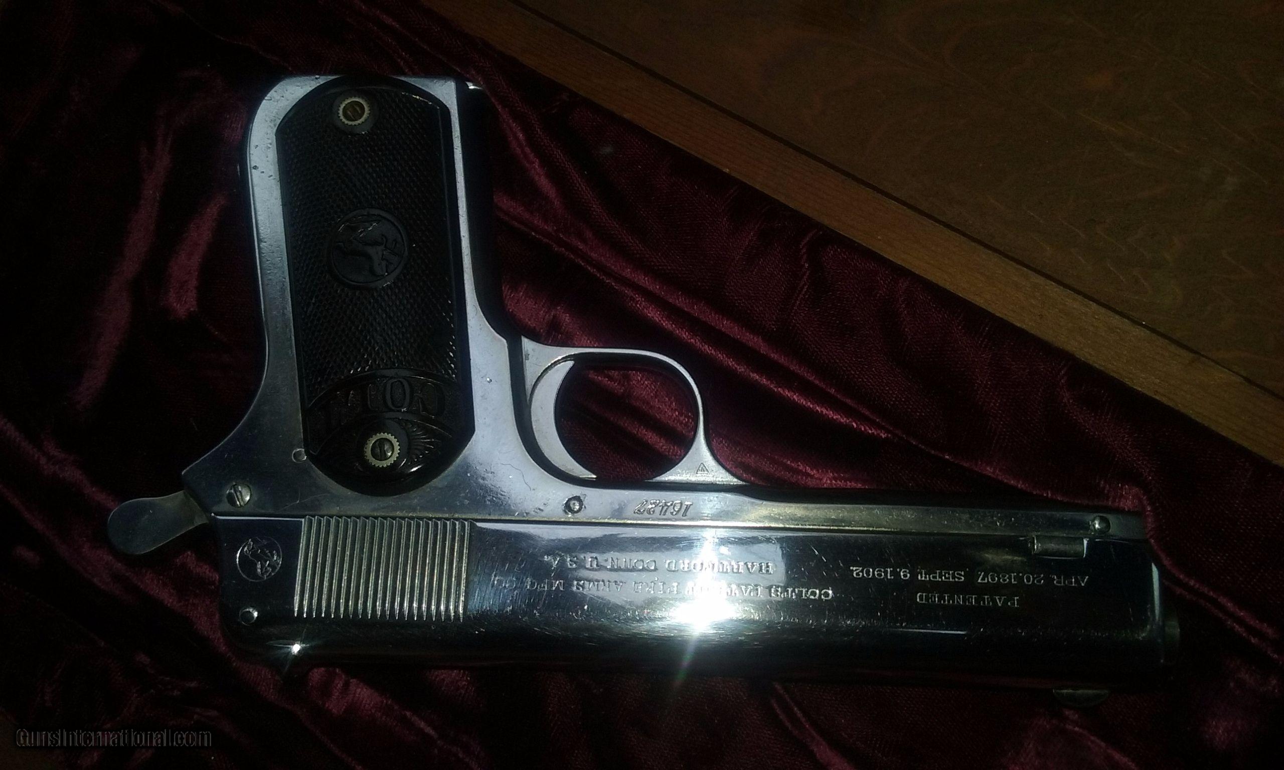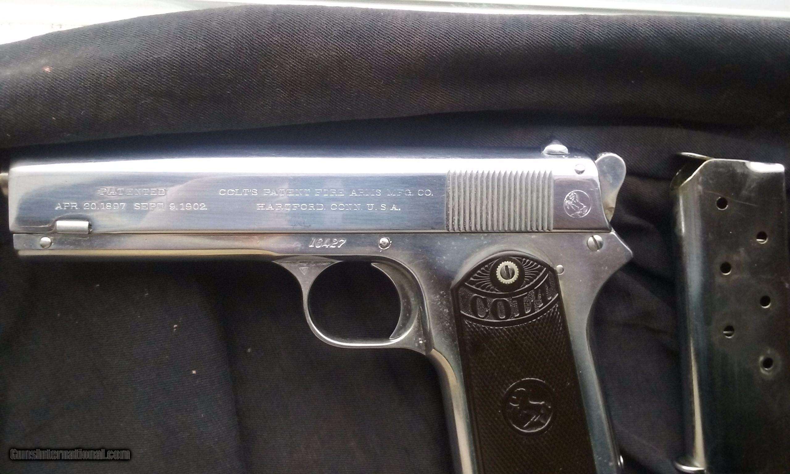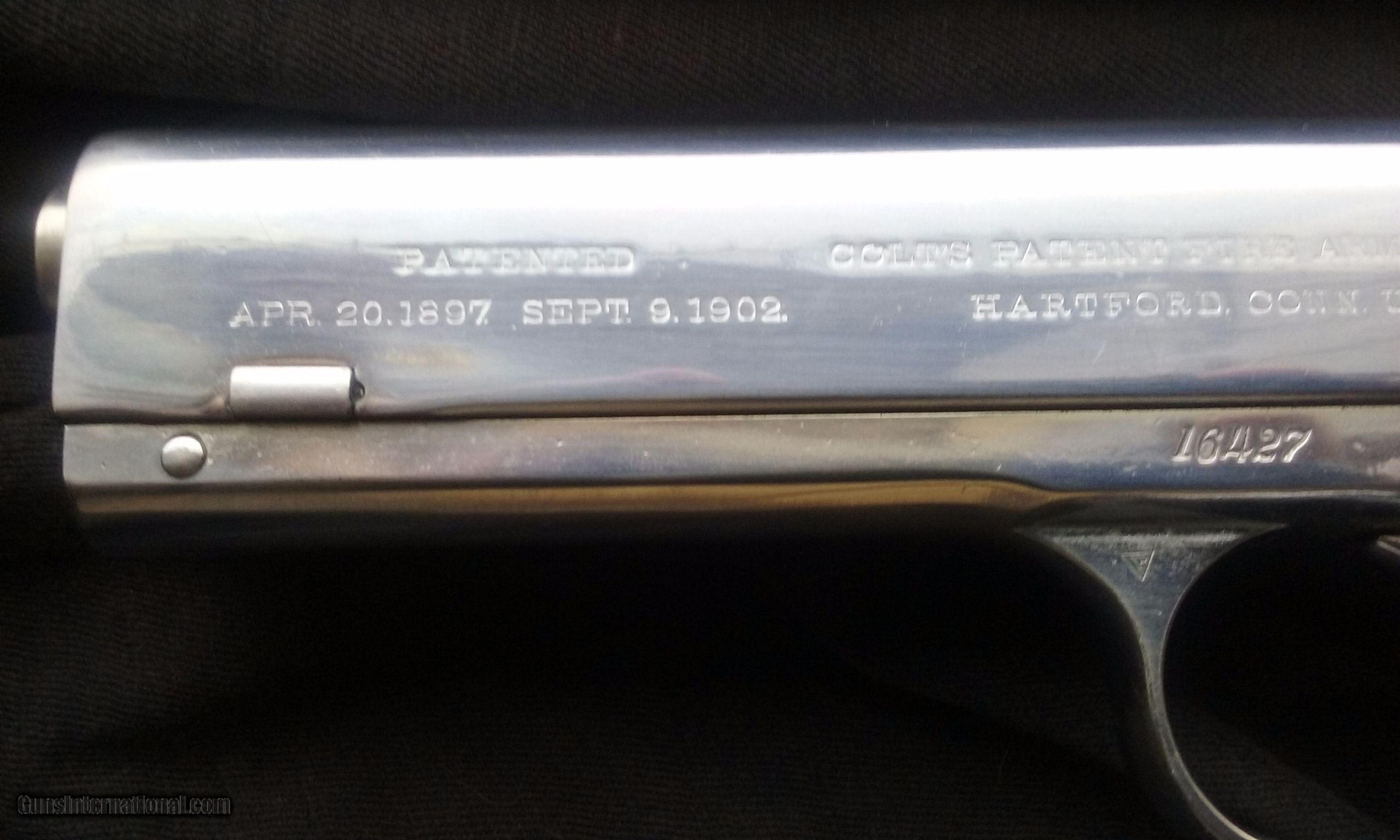 Description: SCARCE, Colt 1903 round hammer, nickel plated,checkered black hard rubber grips. Mfg. 1903-29. This is rare because of the round hammer and nickel finish. Model is serial numbered from 16,000-47,226. This pistol is number 16427, so it is the 427th manufactured in this series---the lowest number of any Colt in my collection. This pistol retains 98% of its original finish Calibur 38 Rimless Smokeless. Crisp lettering, Mechanically perfect. This is the best I gave ever seen. And I'm 71! $6$ SOLD Curio/Relic: Yes Manufacturer: Colt Model: 1903 Pocket Hammer Serial Number: 16427 Caliber Info: .38 ACP Bore: Excellent Condition: Excellent overall Metal Condition: Excellent Bore Condition: Distinct rifling no pitting Finish: Nickel Manufacture Date: 1903 |