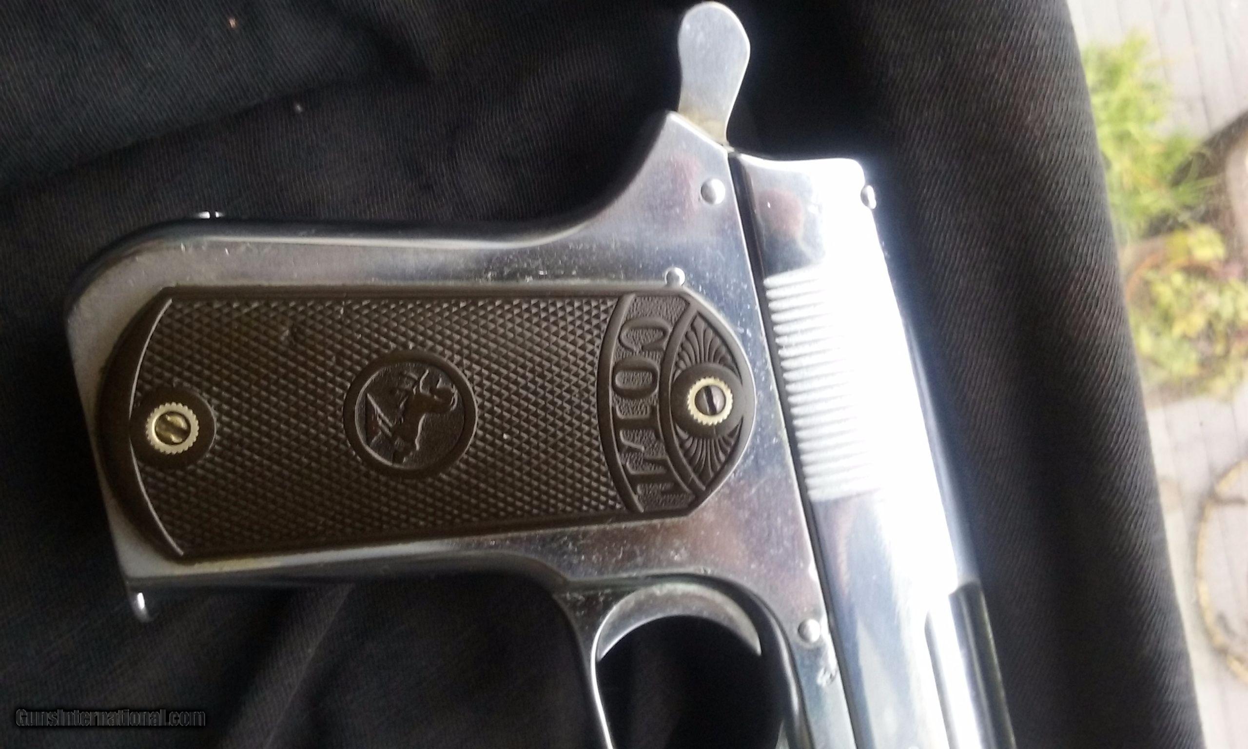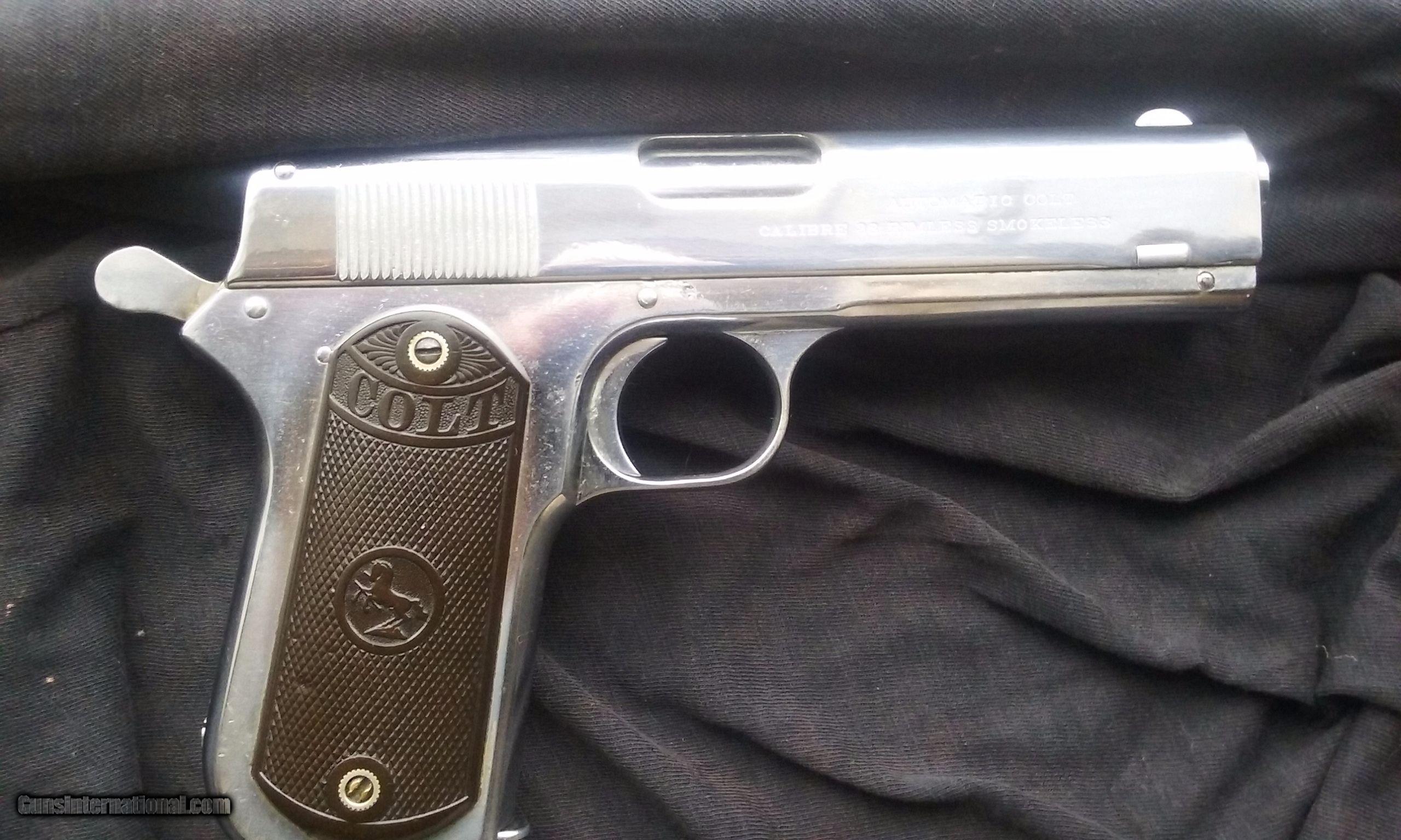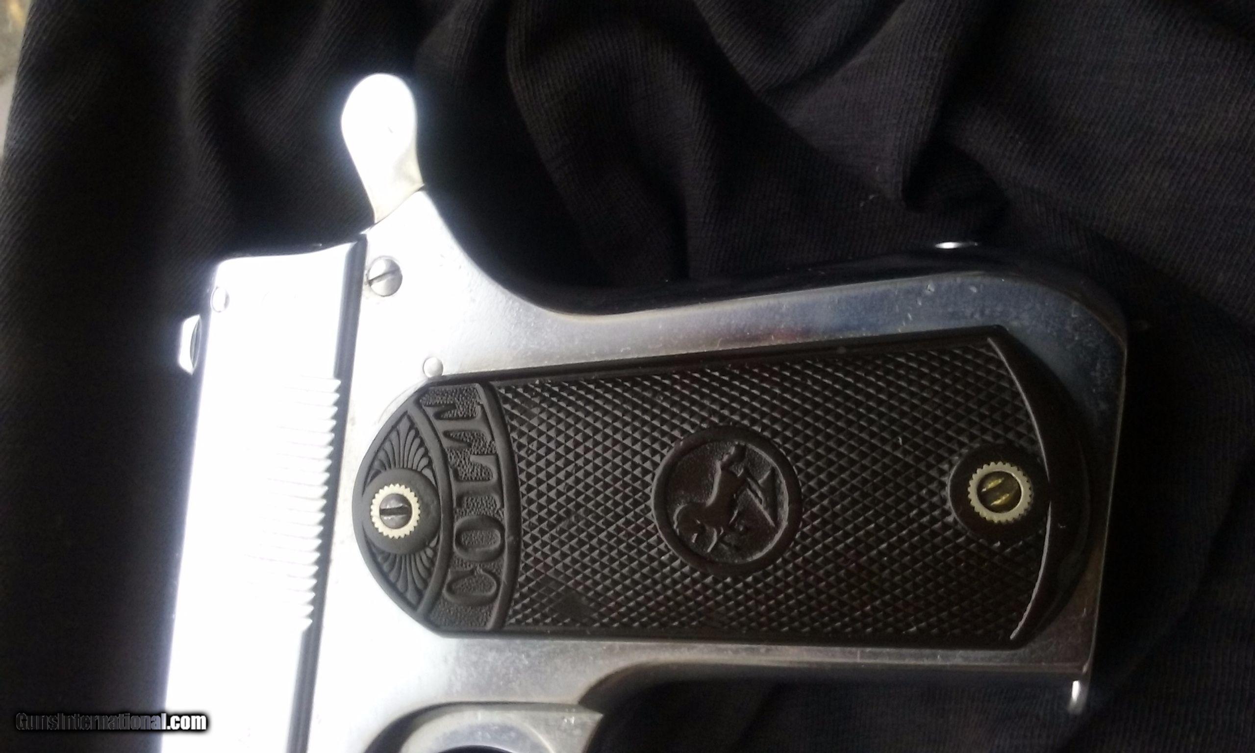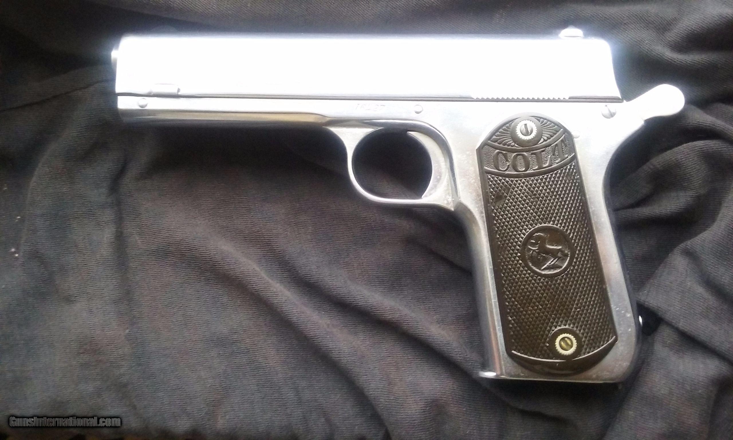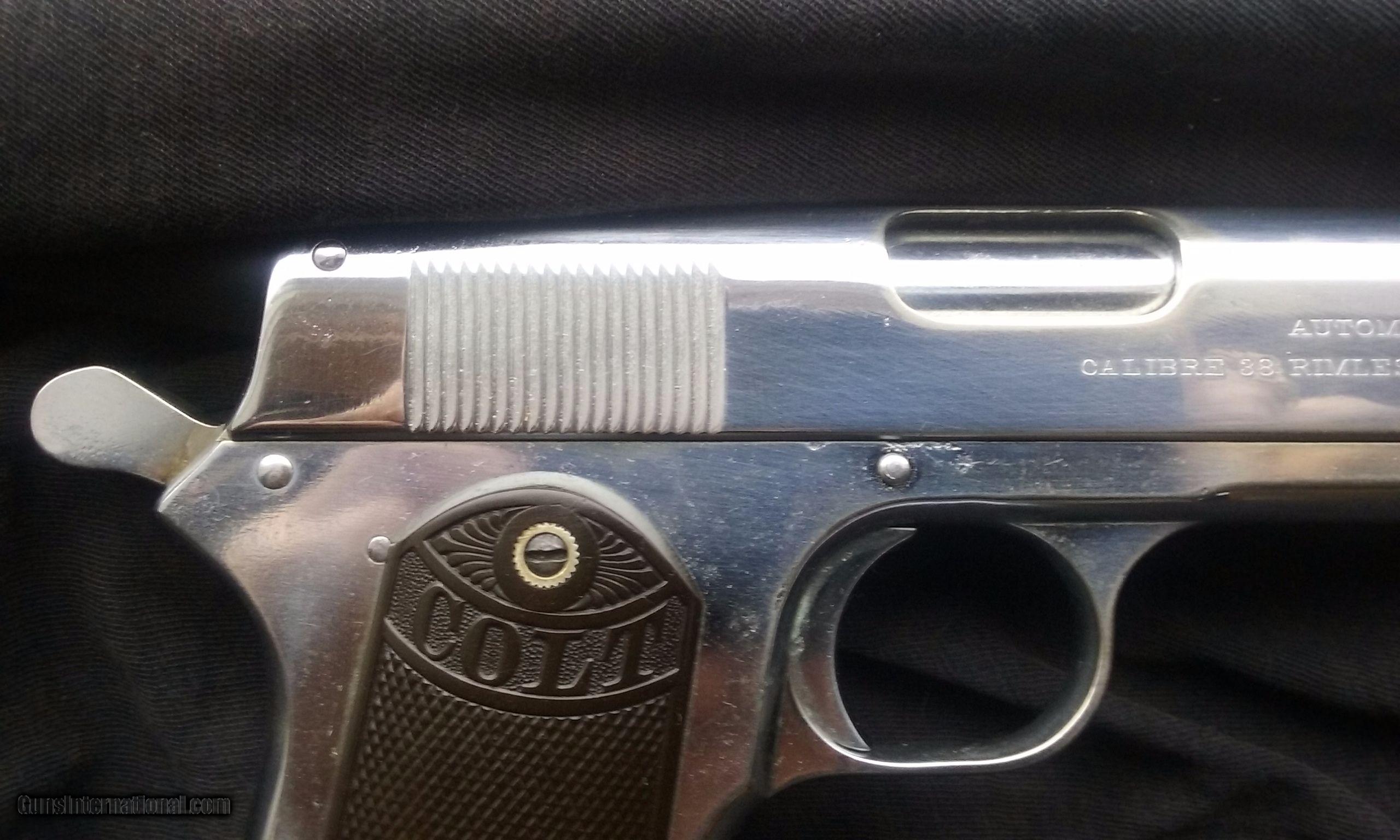 Description: SCARCE, Colt 1903 round hammer, nickel plated,checkered black hard rubber grips. Mfg. 1903-29. This is rare because of the round hammer and nickel finish. Model is serial numbered from 16,000-47,226. This pistol is number 16427, so it is the 427th manufactured in this series---the lowest number of any Colt in my collection. This pistol retains 98% of its original finish Calibur 38 Rimless Smokeless. Crisp lettering, Mechanically perfect. This is the best I gave ever seen. And I'm 71! $6$ SOLD Curio/Relic: Yes Manufacturer: Colt Model: 1903 Pocket Hammer Serial Number: 16427 Caliber Info: .38 ACP Bore: Excellent Condition: Excellent overall Metal Condition: Excellent Bore Condition: Distinct rifling no pitting Finish: Nickel Manufacture Date: 1903 |