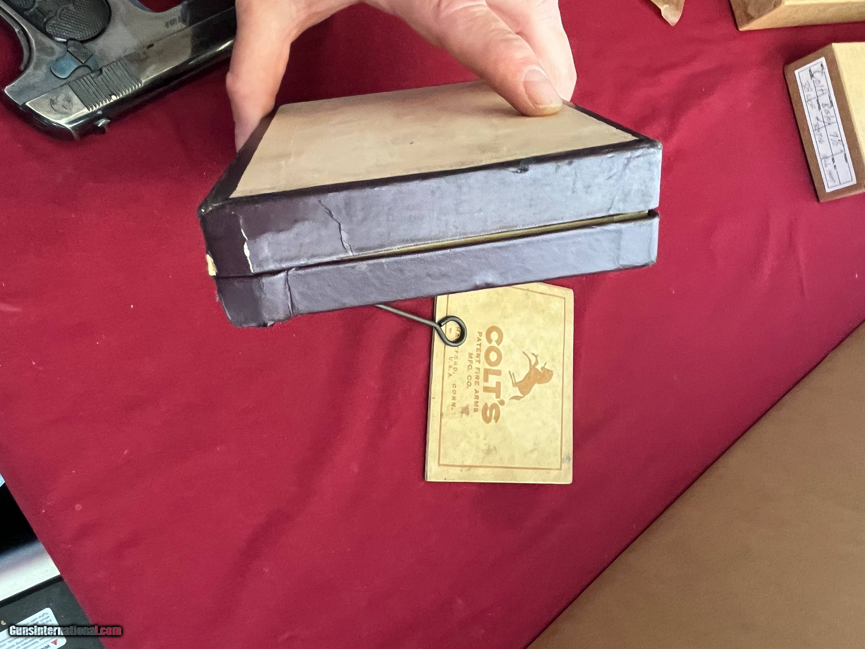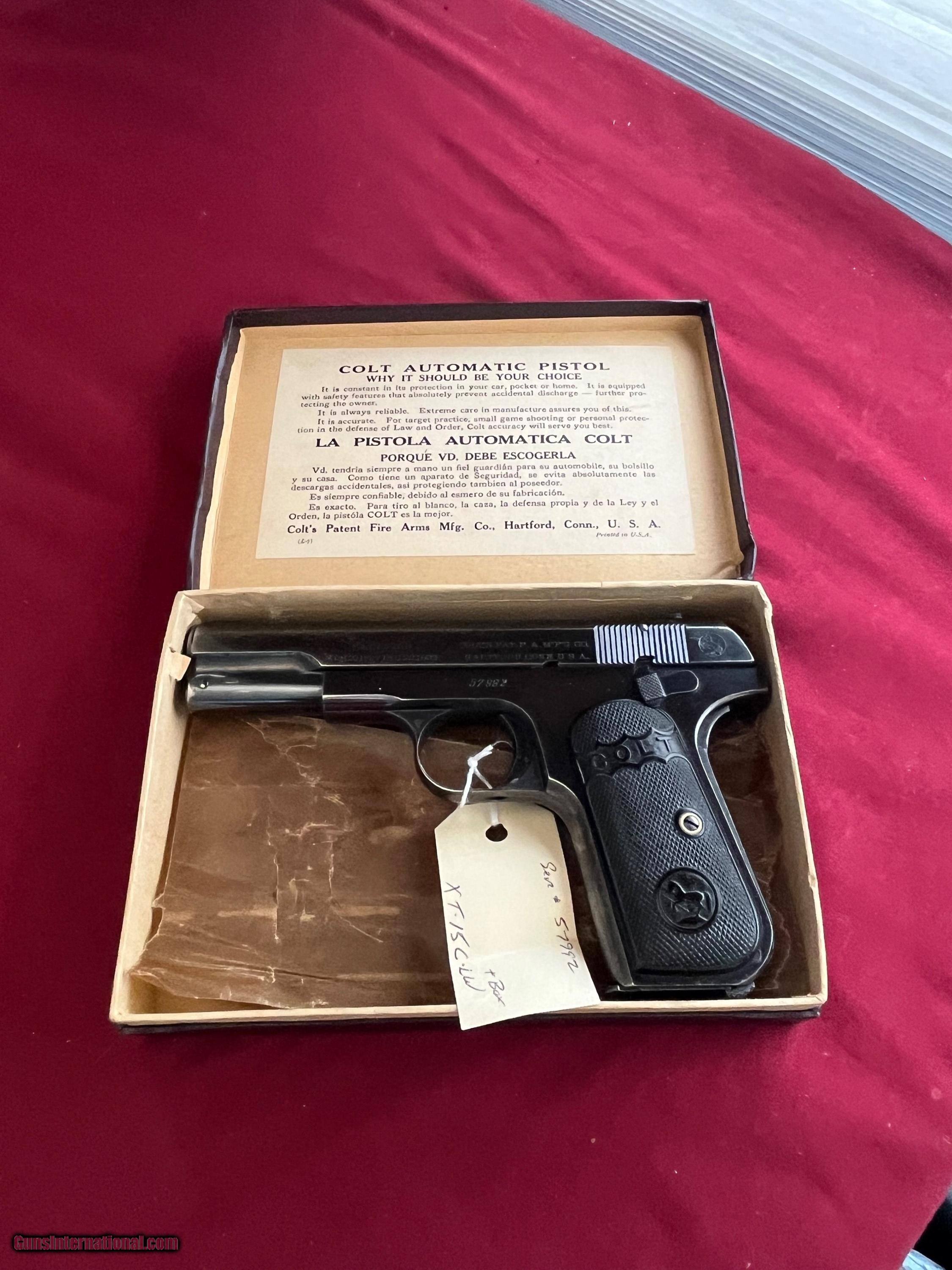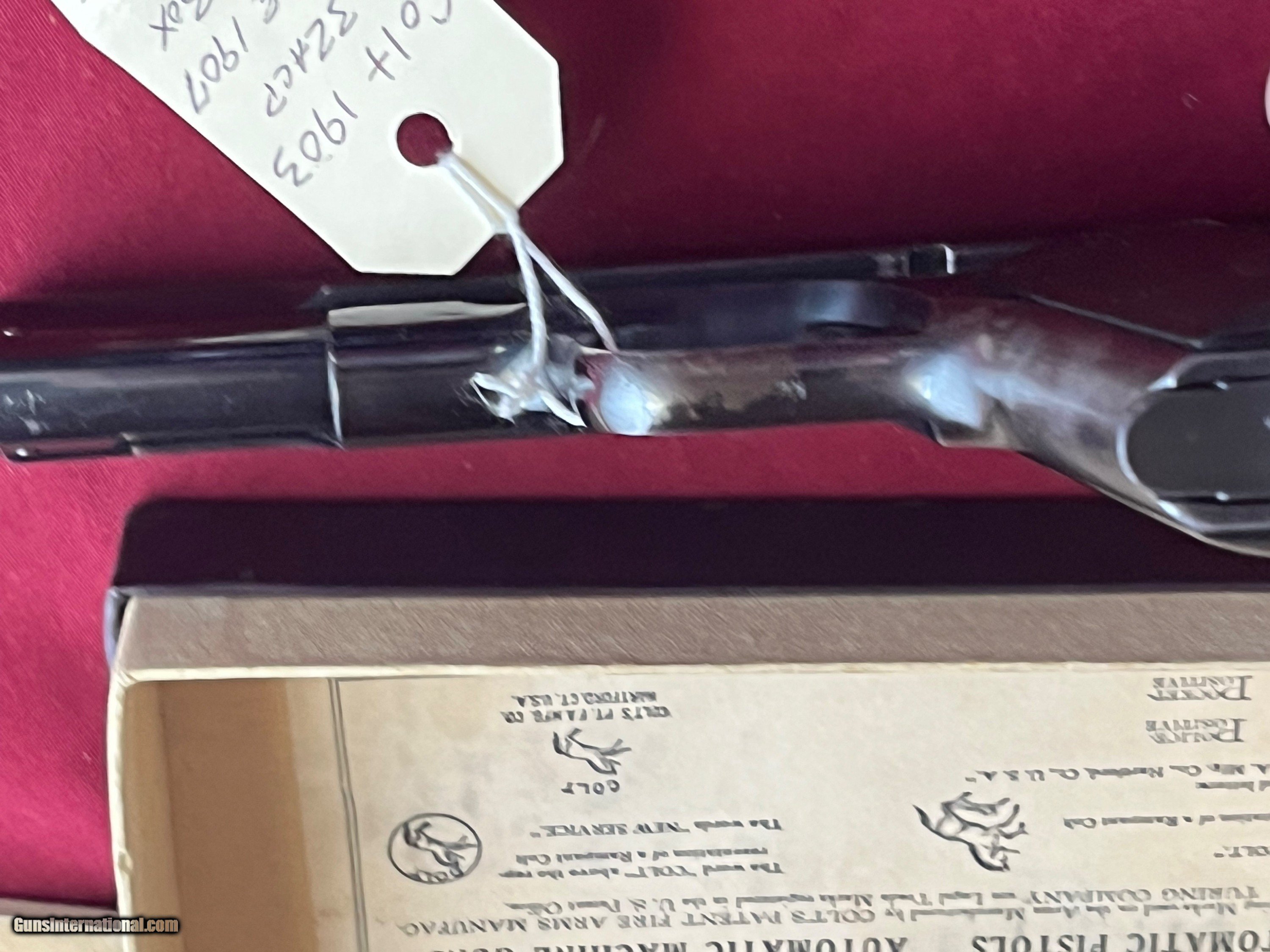 Description: COLT MODEL 1903 SEMI AUTO PISTOL. CALIBER 32 ACP . SER# 57992 MADE IN 1907. GUNS IN EXCELLENT CONDITION . VERY NICE BRIGHT ORIGINAL BLUE FINIS. LIGHT THINNING ON THE FRONT AND BACK STRAP . COMES WITH BOX, MANUAL , CLEANING ROD & 2 - TWO TONE MAGAZINES. GREAT COLT INVESTMENT PIECE . EASTERN BRANCH FIREARMS ADD 40.00 SHIPPING – NEXT DAY AIR SHIPPING ADD 50.00 SHIPPING – LONG GUNS GROUND OPTIONAL INSURANCE IS AVAILABLE AT 1.25 PER 100.00 Questions e-mail or call Glen at Eastern Branch Firearms 207-215-5021 TERMS – PLEASE READ BEFORE I DO NOT HAVE A LAYAWAY OPTION ( WE ACCEPT CREDIT CARDS ) -- I GET ALOT OF REQUEST FOR TRADES, I WOULD PERFER NOT TO DO TRADES ON MY INTERNET LISTINGS PAYMENT OPTIONS- We accept money orders, cashier’s checks , bank checks. sorry no personal checks. We accept all major credit cards please add 3% to the ’s cash discount price.(Shipping within the state of Florida - Florida Residents must pay sales tax) .Handguns and long guns do need to be shipped separate. PLEASE do not send payment via FED EX . USPS & UPS are fine. Thank you. We include a signed copy of our FFL with each firearm shipped. SAFTY NOTICE- Buyer is solely responsible for determining that a used gun is safe to shoot. The firearms offered have not been test fired but have been given a visual inspection only for purposes. It is a requirement that every used firearm is inspected by a qualified gunsmith before firing. By , the buyer agrees to hold seller harmless against damages, injury, or death caused by defective merchandise. RETURN POLICY- All firearms come with a 3-day non firing , non messing with ( turning srews ,taking apart,removing parts, scoping. firing, cleaning or messing with in anyway) inspection/return privilege.Inspection is based on a visual review of the gun to confirm the gun is in the condition stated. In the case of a return, buyer pays all shipping charges & if paid for with a credit card buyer absorbs the 3% credit card charges . So please ask questions BEFORE you bid. Thanks for Looking and Good Luck!! U.S. sales only, no exports…this includes antiques. I will ship to third party for exporting SOLD Curio/Relic: Yes |
