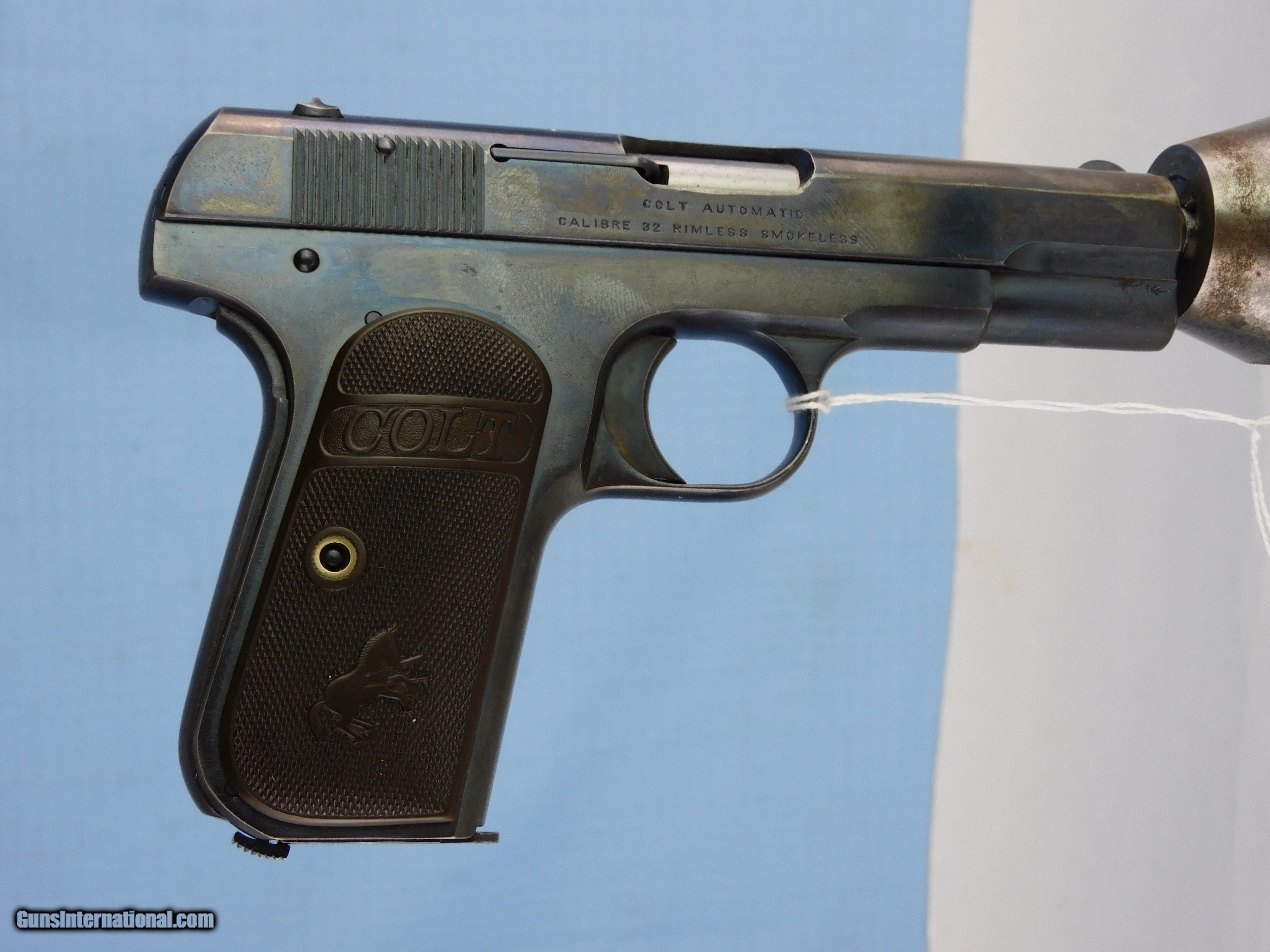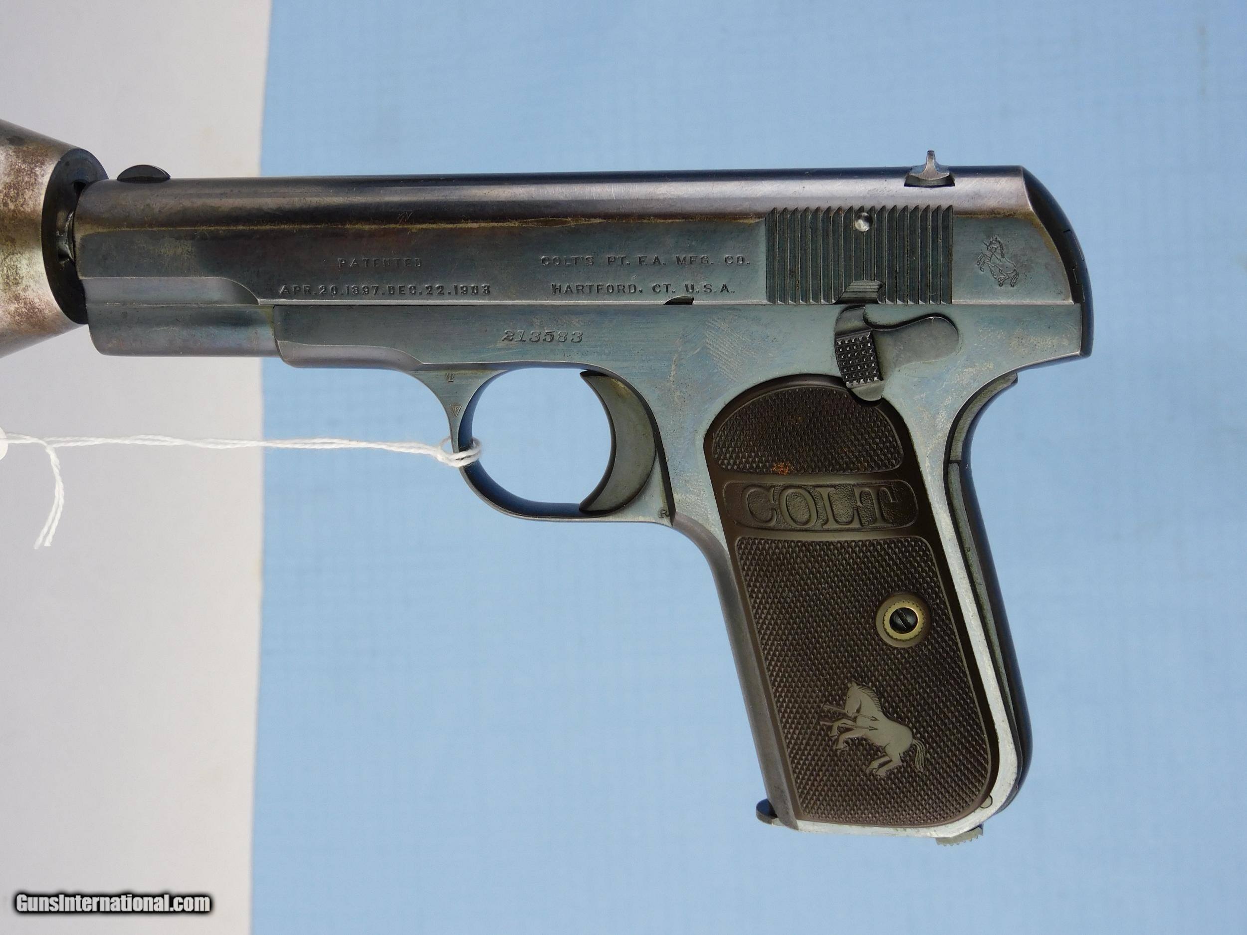 Description: #375P COLT MODEL 1903 HAMMERLESS AUTO, 32 auto, SN 2135XX, exc. bore, exc. original hard rubber grips, 97% blue, made in 1916. $895 FFL required SOLD |