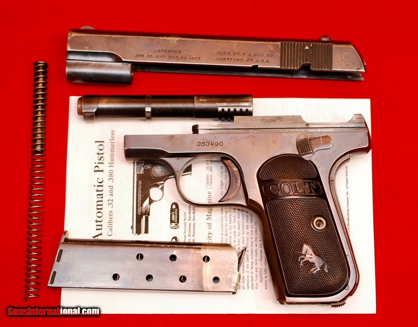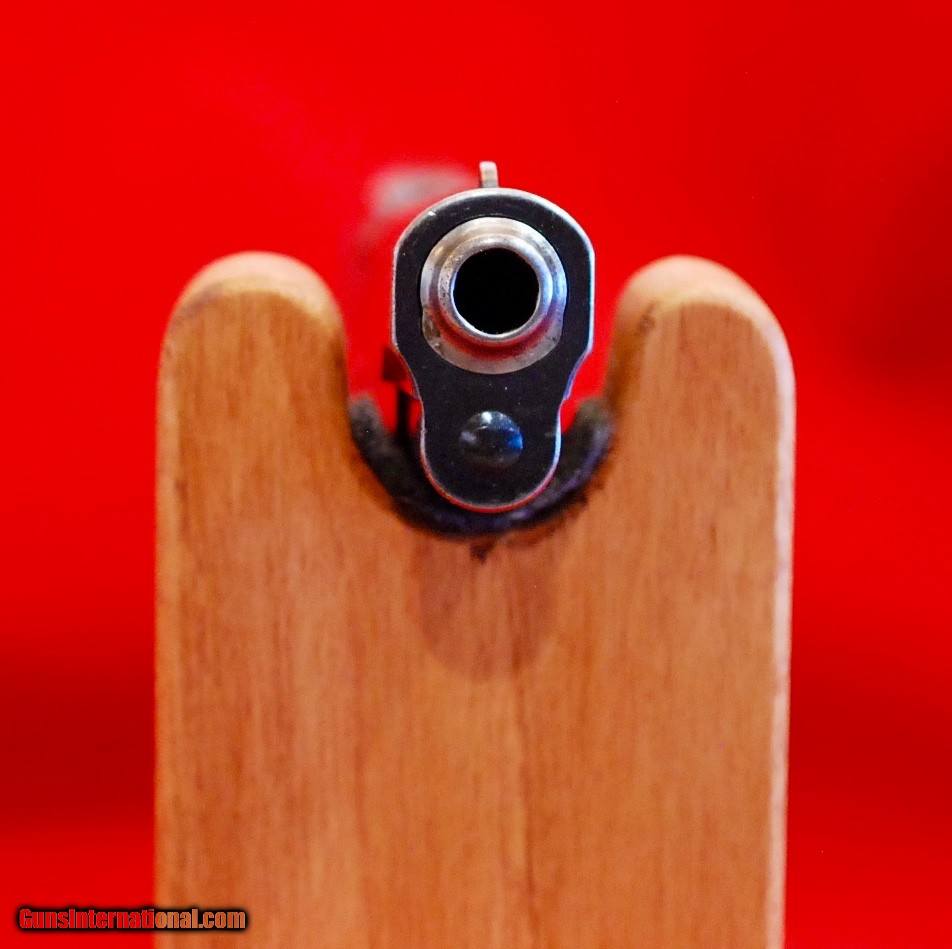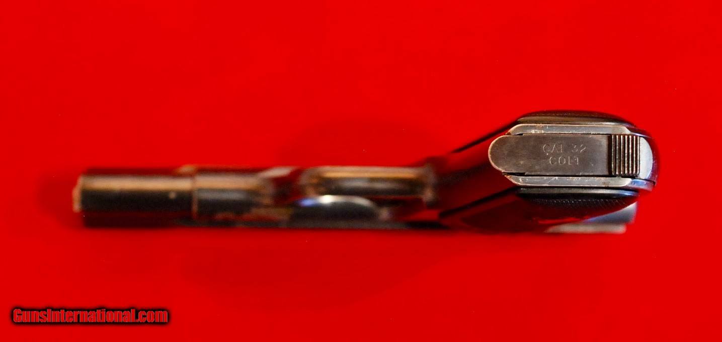 Description: Colt Model of 1903 in .32 ACP caliber, blued, made 1920. Bore is bright and shiny with strong rifling, no pitting. Some areas of bluing loss mostly on slide as shown in pictures but no rust. Bluing loss seems to be more from storage rather than shooting or carry. Does not appear to have been fired much. Test fired and functions as it should. Grips are in excellent shape for age with no cracks or chips. Comes with one two-tone magazine in generic pistol box and reprint of owner's manual. C&R eligible where allowed. SOLD Curio/Relic: Yes Handgun Caliber: .32 ACP (7.65x17mm Browning SR) Manufacturer: Colt Model: 1903 Serial Number: 353490 |