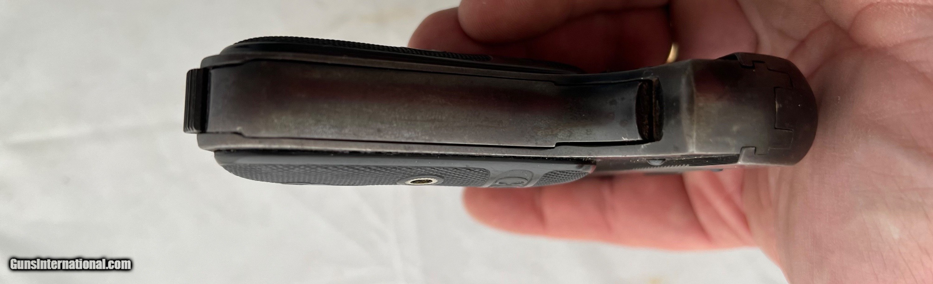 Description: 31504-EARLY COLT MODEL 1903 HAMMERLESS .32 ACP PISTOL CIRCA 1909. All original and matching with early slide markings. Very good plus with 50-60% blue mixed with dark patina. Good crisp markings and excellent factory hard rubber grips. Excellent and tight working order and very good bore. Will clean even better. SOLD Curio/Relic: Yes Handgun Caliber: .32 ACP (7.65x17mm Browning SR) |