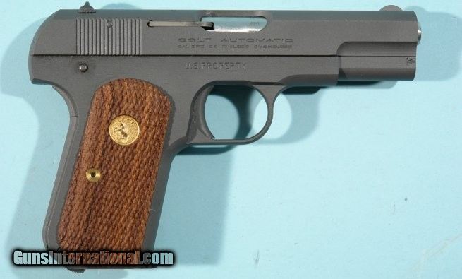 Description: NEW IN BOX COLT GENERAL OFFICERS MODEL 1903 POCKET HAMMERLESS .32ACP PISTOL. Serial numbers match to box with all the original factory parkerizing and in new in box unfired condition. Known as the "General Officers Pistol" (hence the GOP prefix to serial number). Known as the Model "M" at the time. Exact copy of those issued to Officer's during and after WW2. This one has the original manual, as well as a copy of the WW2 instructions that came with them and in the box with matching end label ands sleeve it came in. Never really been out of box or handled. Original issued Model M's bring $6K in today's market. SOLD |