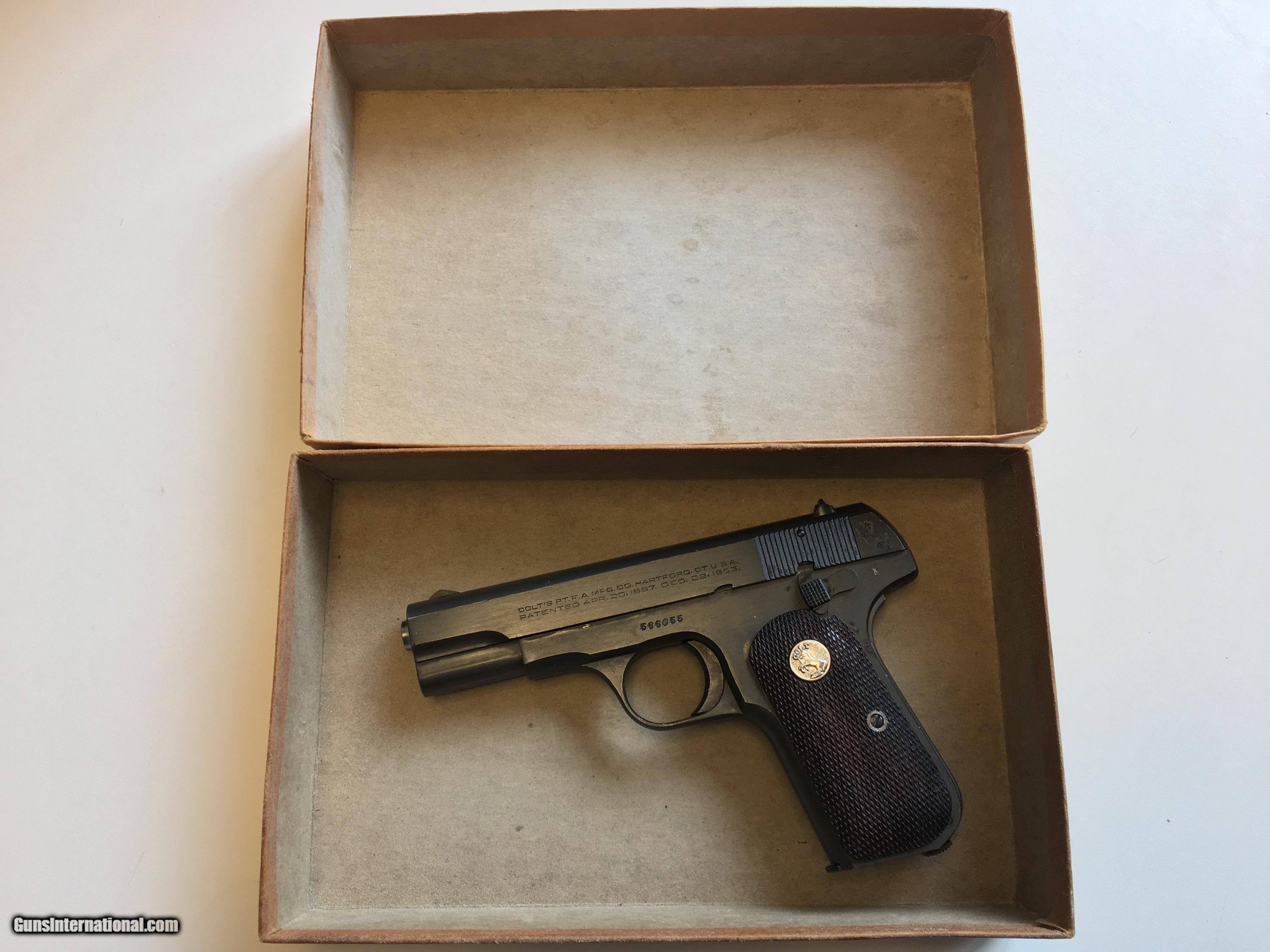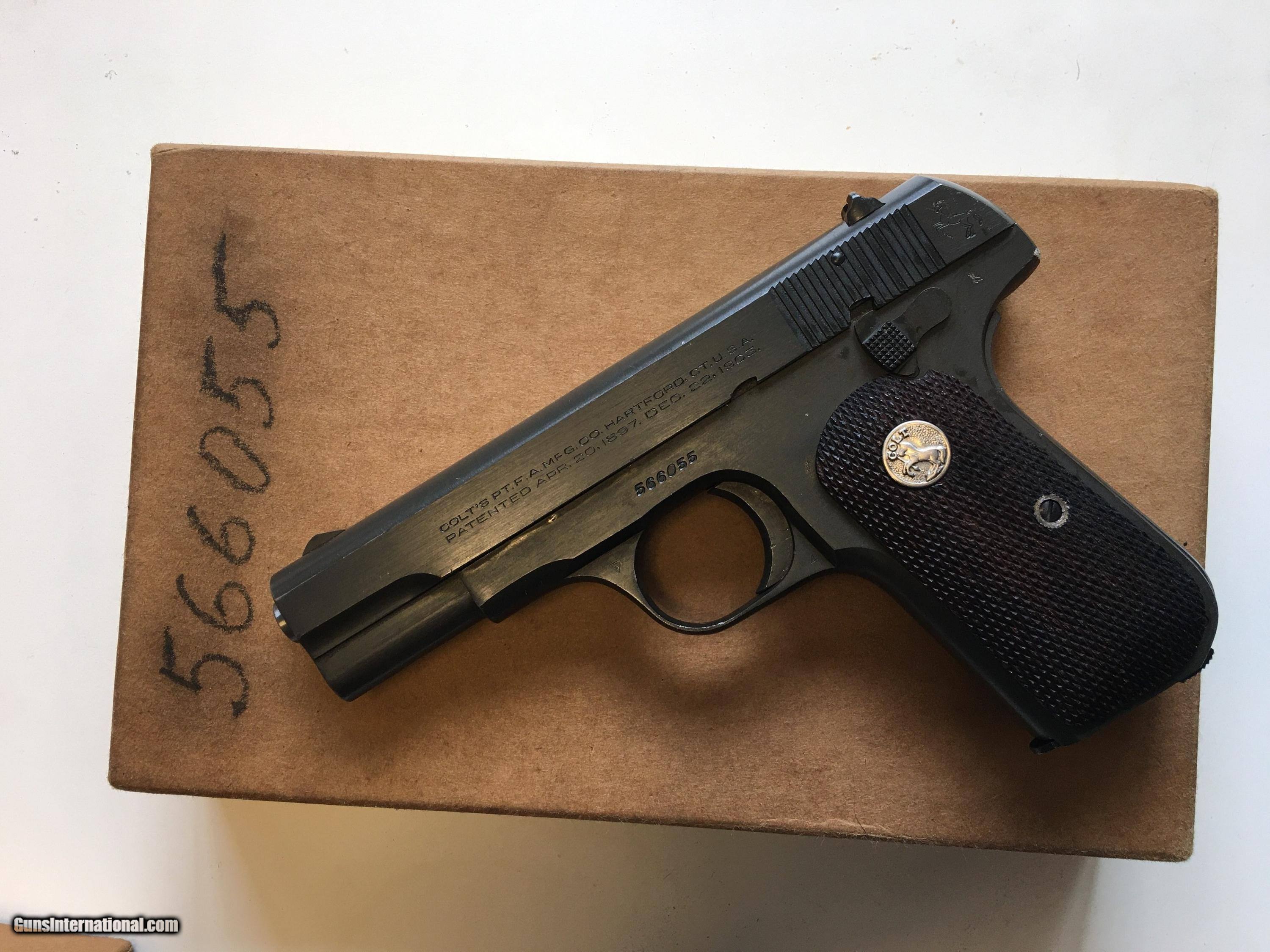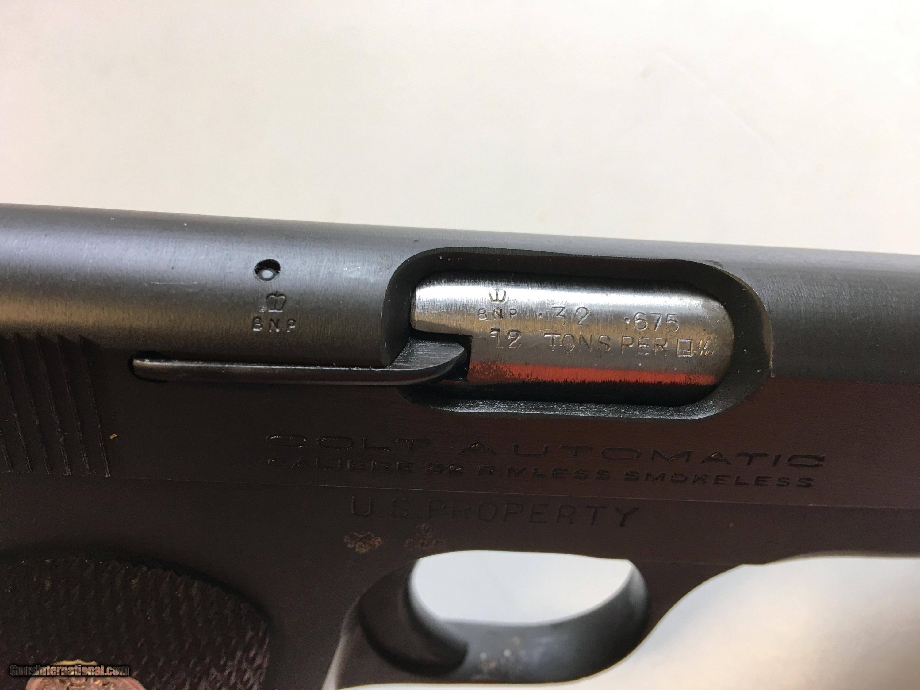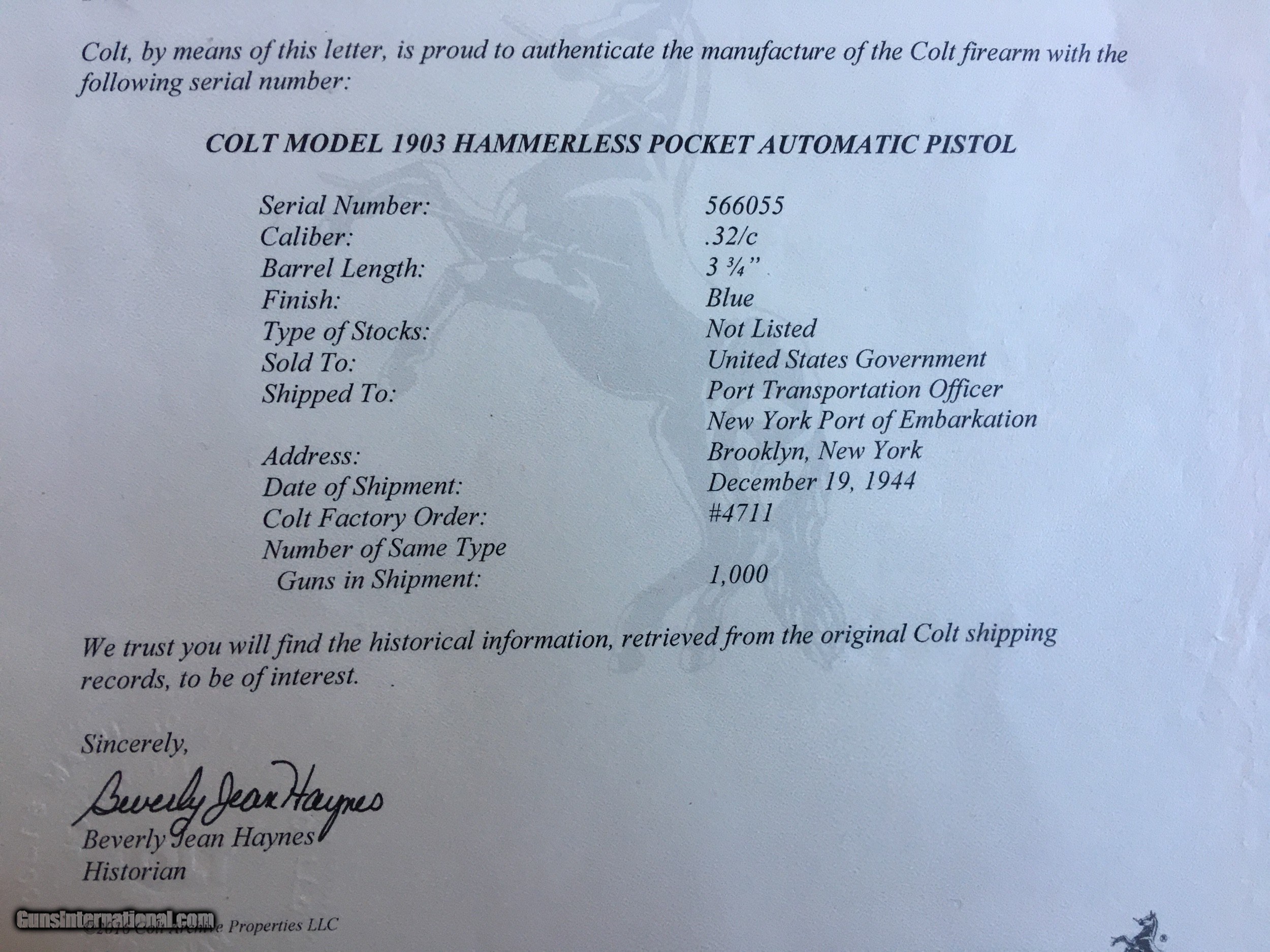 Description: This is an outstanding example of a Colt 1903 US Property pistol, send to Britain as a part of Lend Lease program in 1943-1944. The gun is in near new, unissued original condition with over 99% of the beautiful original parkerizing remaining with just a few tiny handling marks. The gun is complete with a serialized kraft shipping box and factory letter. Perfect grips and bore. Sharp US and British proof marks. Original all blue magazine. Impossible to upgrade set. 3-day inspection $35 shipping FFL or C&R(where permitted). SOLD Curio/Relic: Yes |