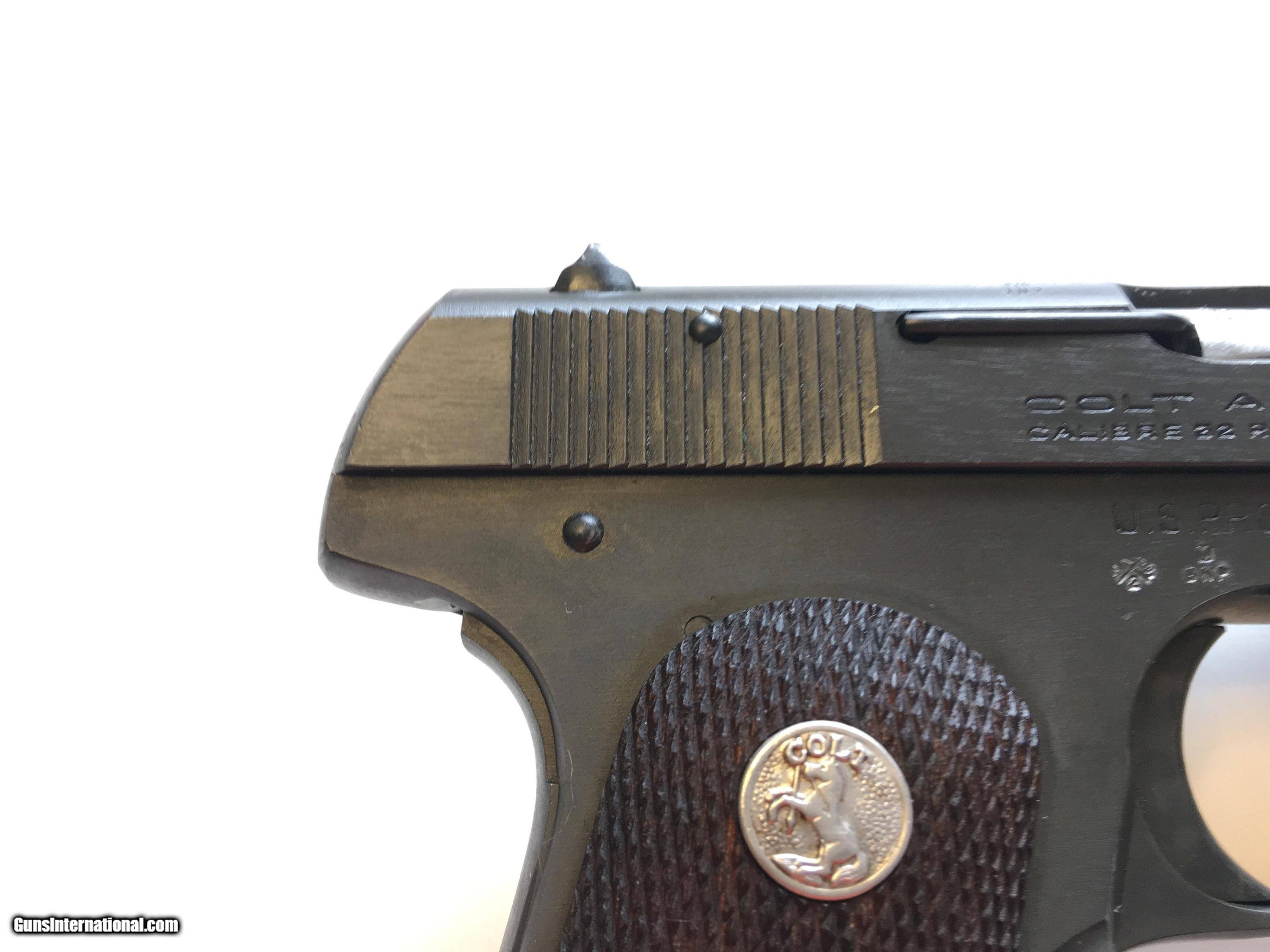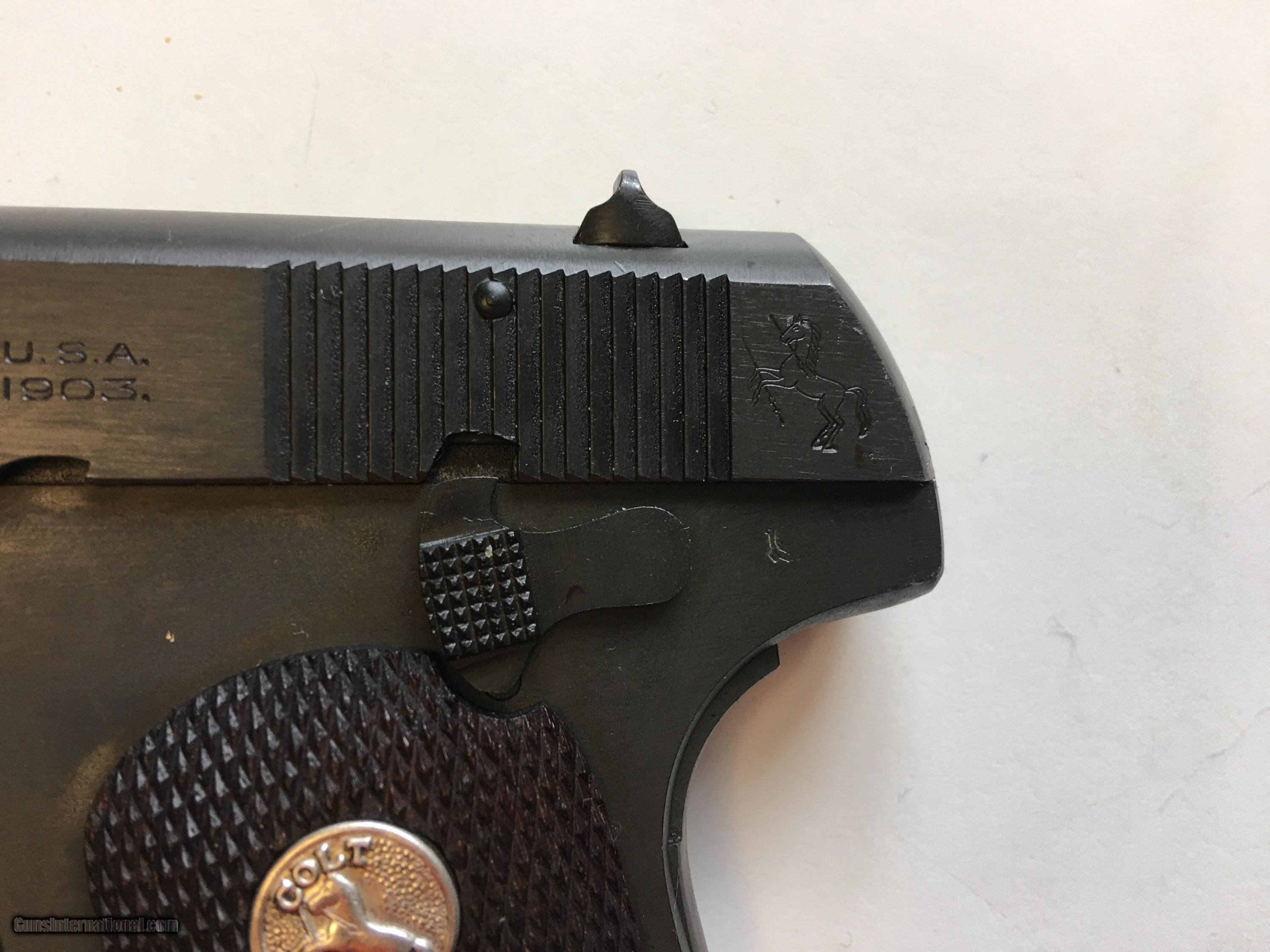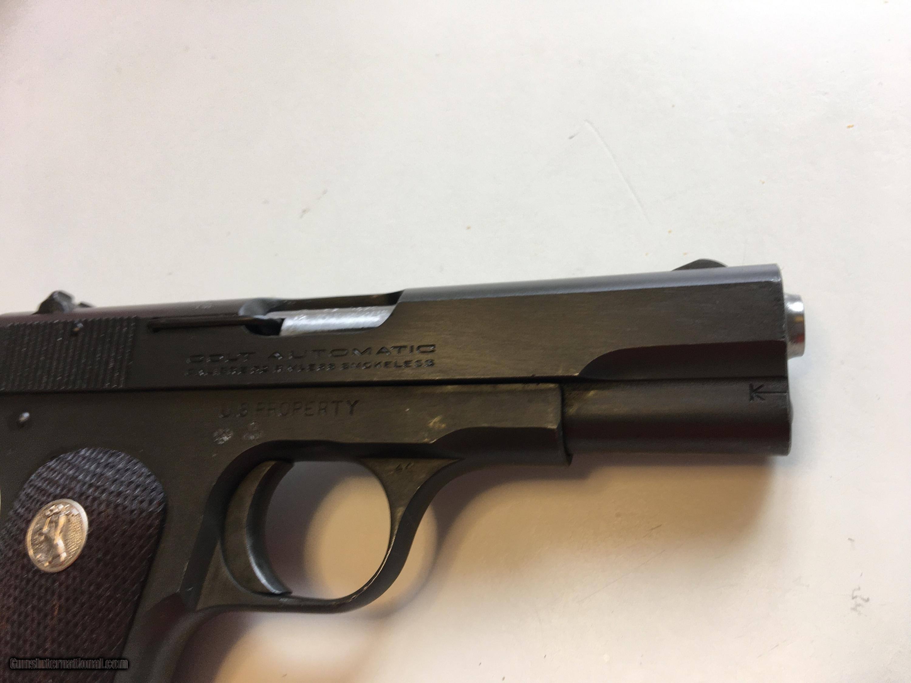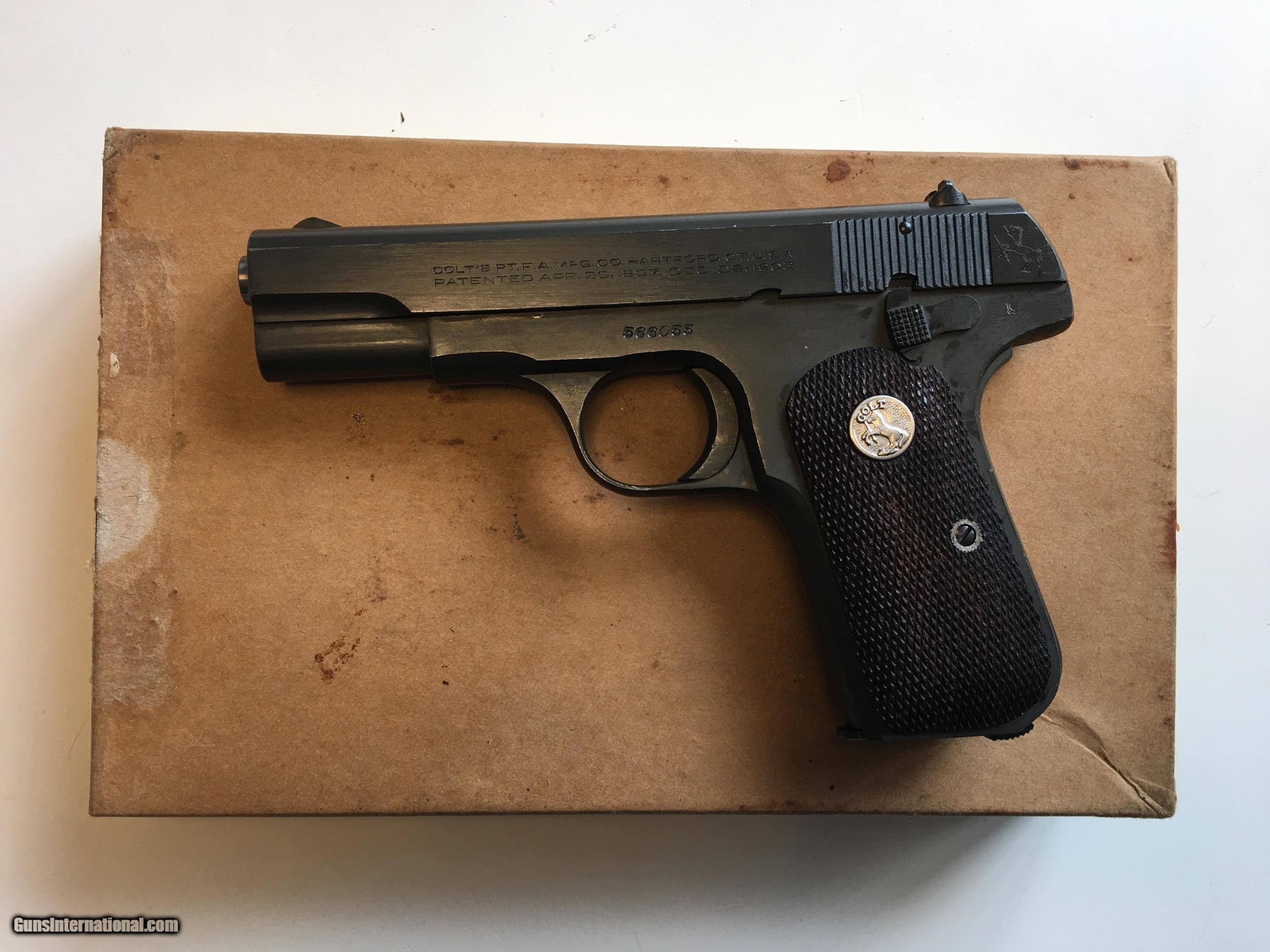 Description: This is an outstanding example of a Colt 1903 US Property pistol, send to Britain as a part of Lend Lease program in 1943-1944. The gun is in near new, unissued original condition with over 99% of the beautiful original parkerizing remaining with just a few tiny handling marks. The gun is complete with a serialized kraft shipping box and factory letter. Perfect grips and bore. Sharp US and British proof marks. Original all blue magazine. Impossible to upgrade set. 3-day inspection $35 shipping FFL or C&R(where permitted). SOLD Curio/Relic: Yes |