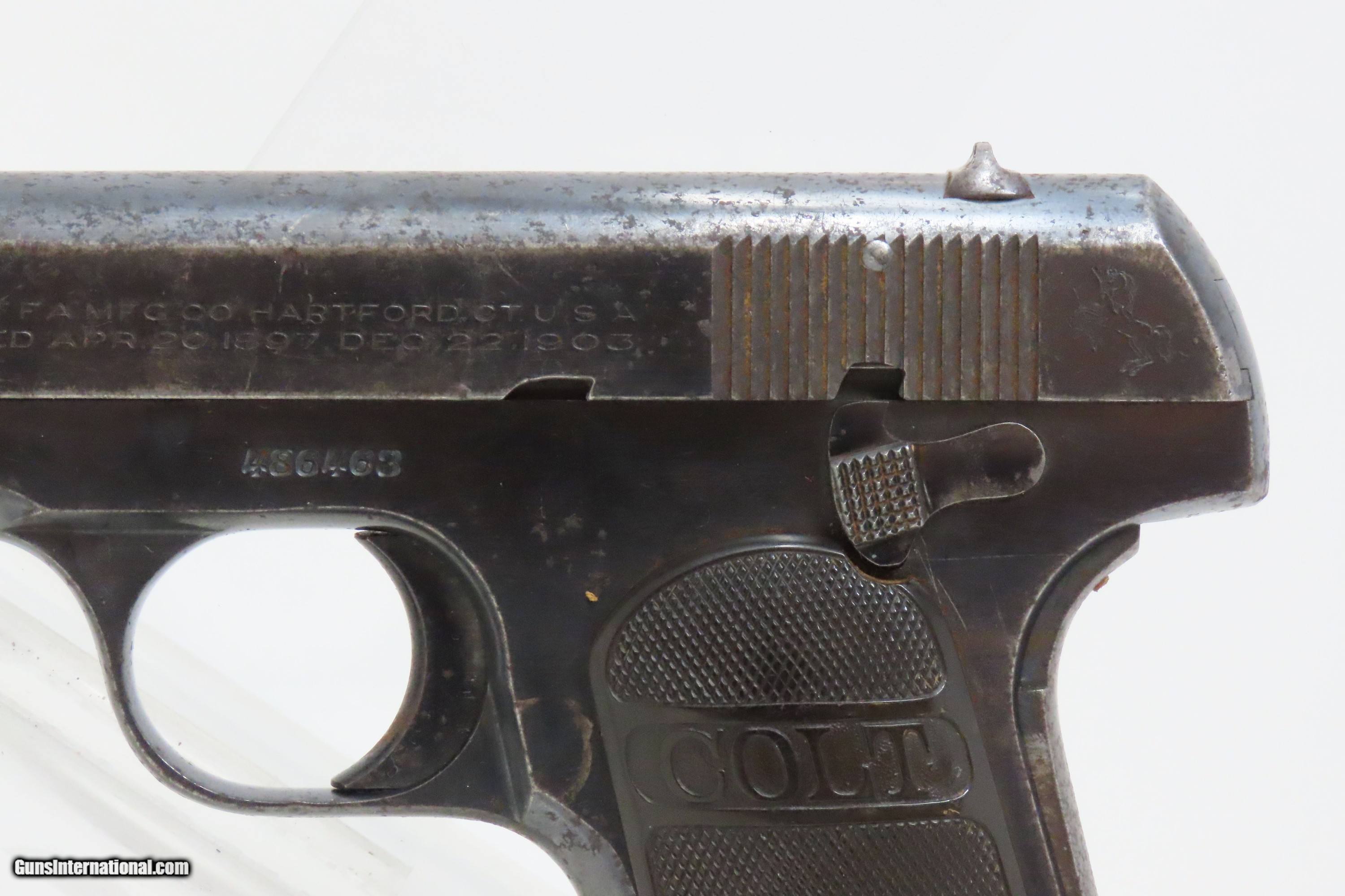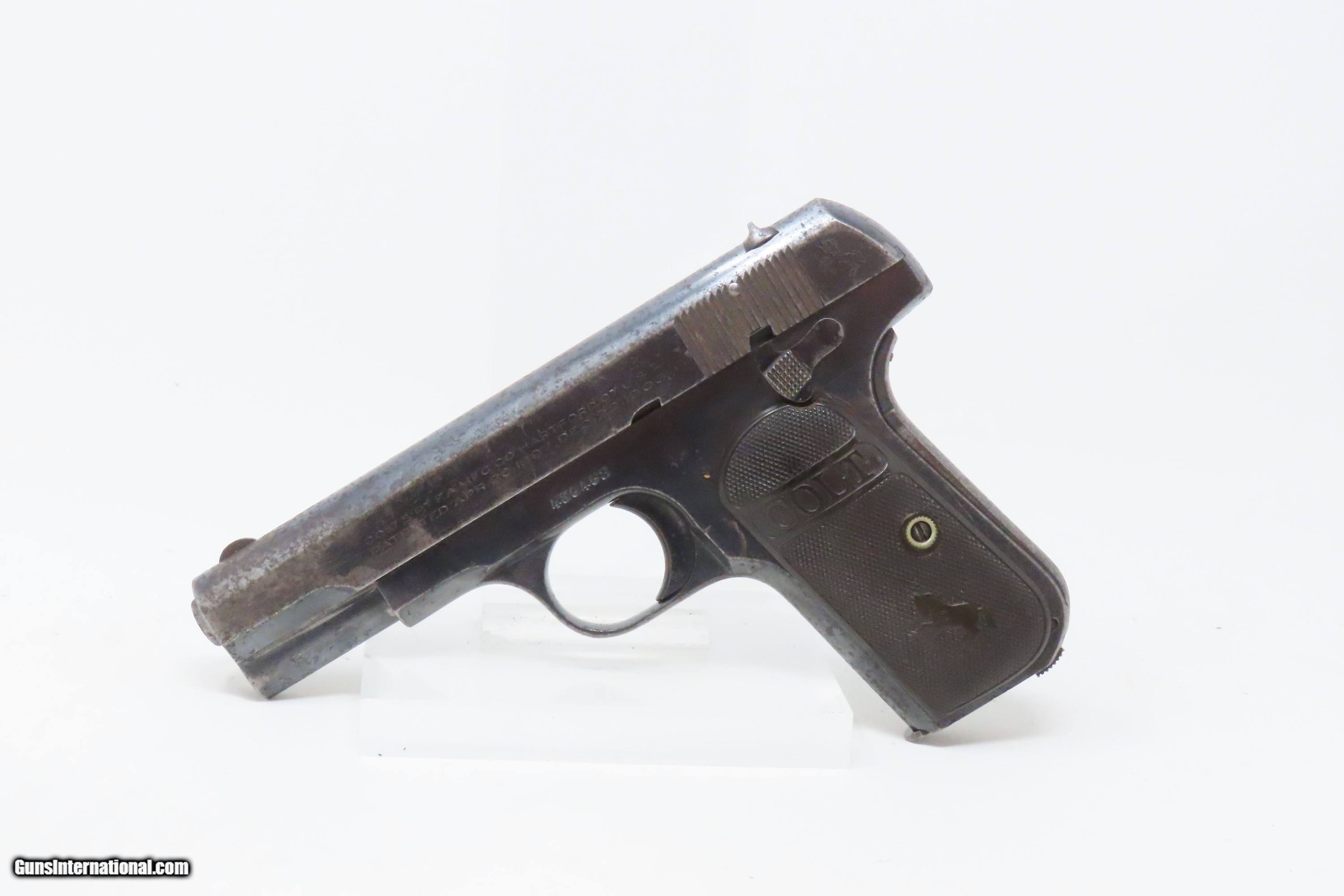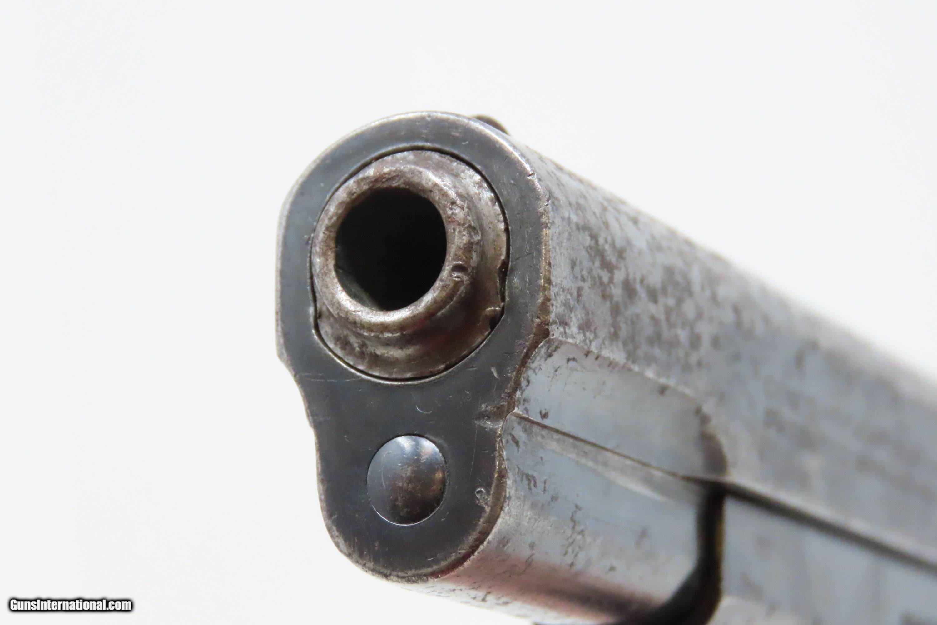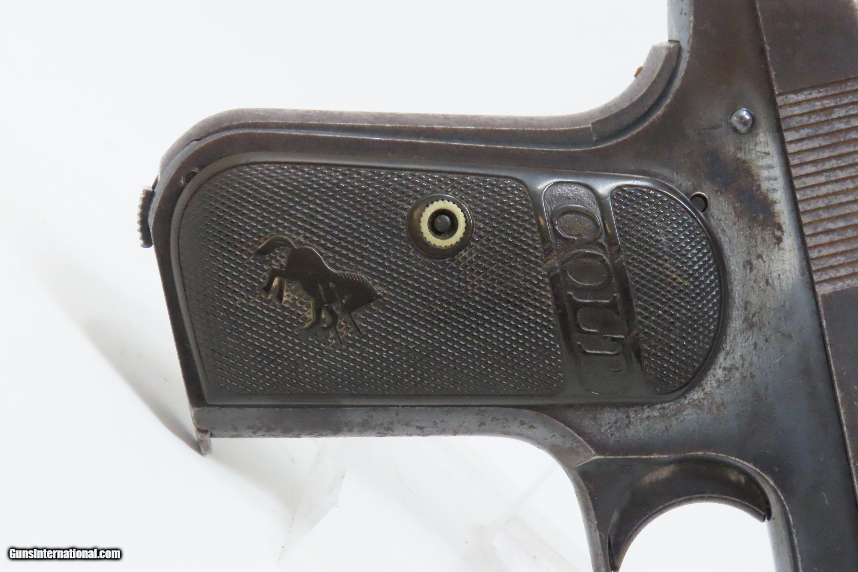 Description: SAN ANTONIO TEXAS Lettered COLT 1903 Pistol Roaring Twenties TX WW2 II C&R WORLD WAR II Captured “BRINGBACK” Here we present a C&R Colt Model 1903 Pocket Hammerless Pistol manufactured in Hartford, Connecticut in 1928. This one comes with a factory letter that states the shipment date as 26 October 1928 to Praeger Hardware Company in San Antonio, Texas. Oral tradition on this piece is that this was a capture bringback piece from World War II Germany and that it was taken from a German soldier with the last name of Praeger. The Colt Model 1903 Pocket Hammerless was a short-recoil, semi-automatic pistol, designed by the American arms designer John Moses Browning. The Colt Model 1903 Pocket Hammerless (not to be confused with the Colt Model 1903 Pocket Hammer) is a .32 ACP caliber, self-loading, semi-automatic pistol. Despite the title "hammerless", the Model 1903 does have a hammer. The hammer is covered and hidden from view under the rear of the slide. This allows the pistol to be carried in and withdrawn from a pocket quickly and smoothly without snagging. Approximately 570,000 Colt Pocket Hammerless pistols were produced from 1903 to 1945, in five different types. Some were issued to U.S. Army and U.S. Air Force general officers from World War II through the 1970s. The overall condition is very good. Original finish with a light scale. Excellent action. Bright, sharply rifled bore. Sharp markings. Good grips with an expected amount of handling. This firearm is classified as a Curio & Relic. Barrel is 3-3/4 inches. Caliber: .32 ACP Overall condition as seen in photos. Very Fast. Very Safe. FREE SHIPPING. Will need to be sent to your local FFL or C&R licensee. This firearm is classified as a Curio & Relic. Guaranteed AUTHENTIC & Includes CERTIFICATE OF AUTHENTICITY. ancestryguns $1800 #228359 SOLD Curio/Relic: Yes |