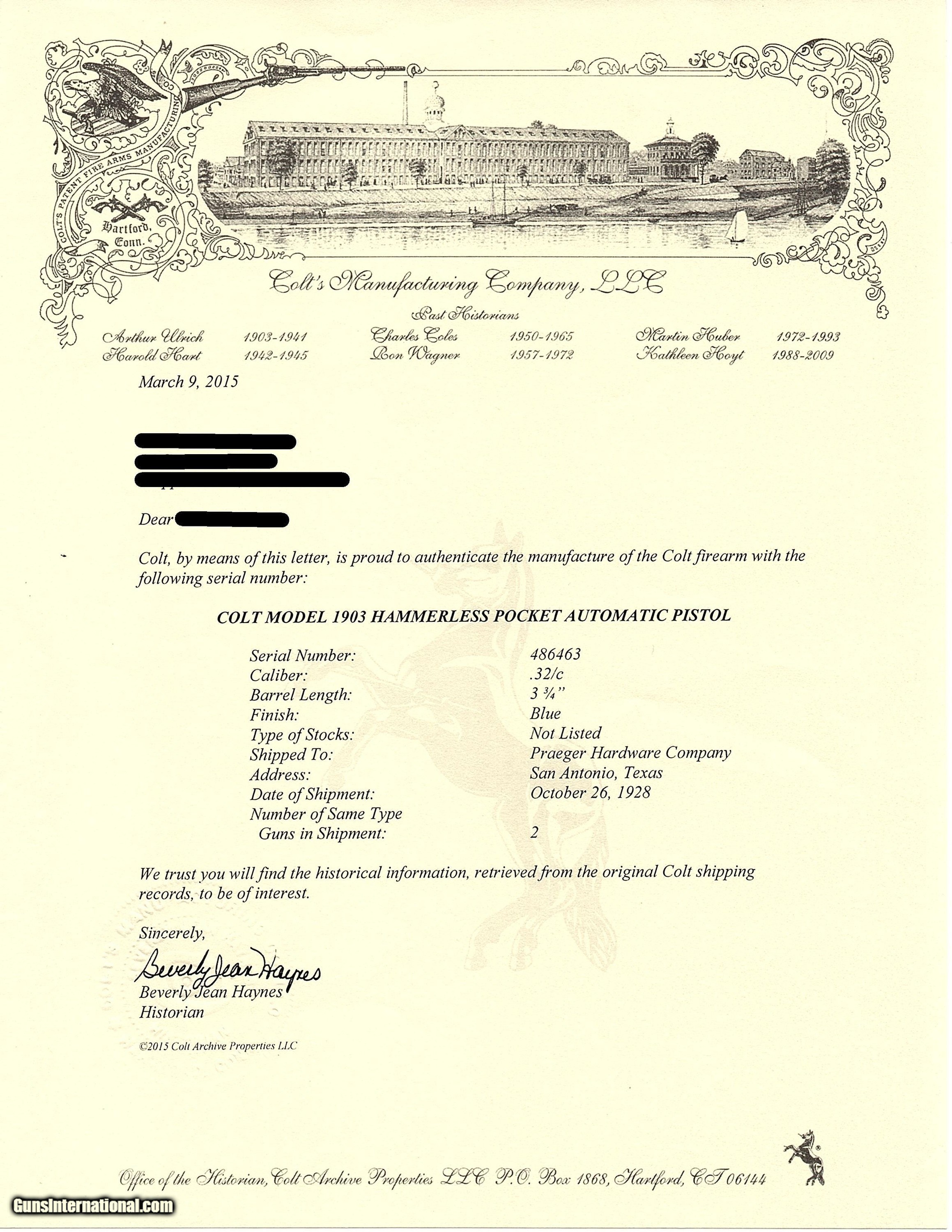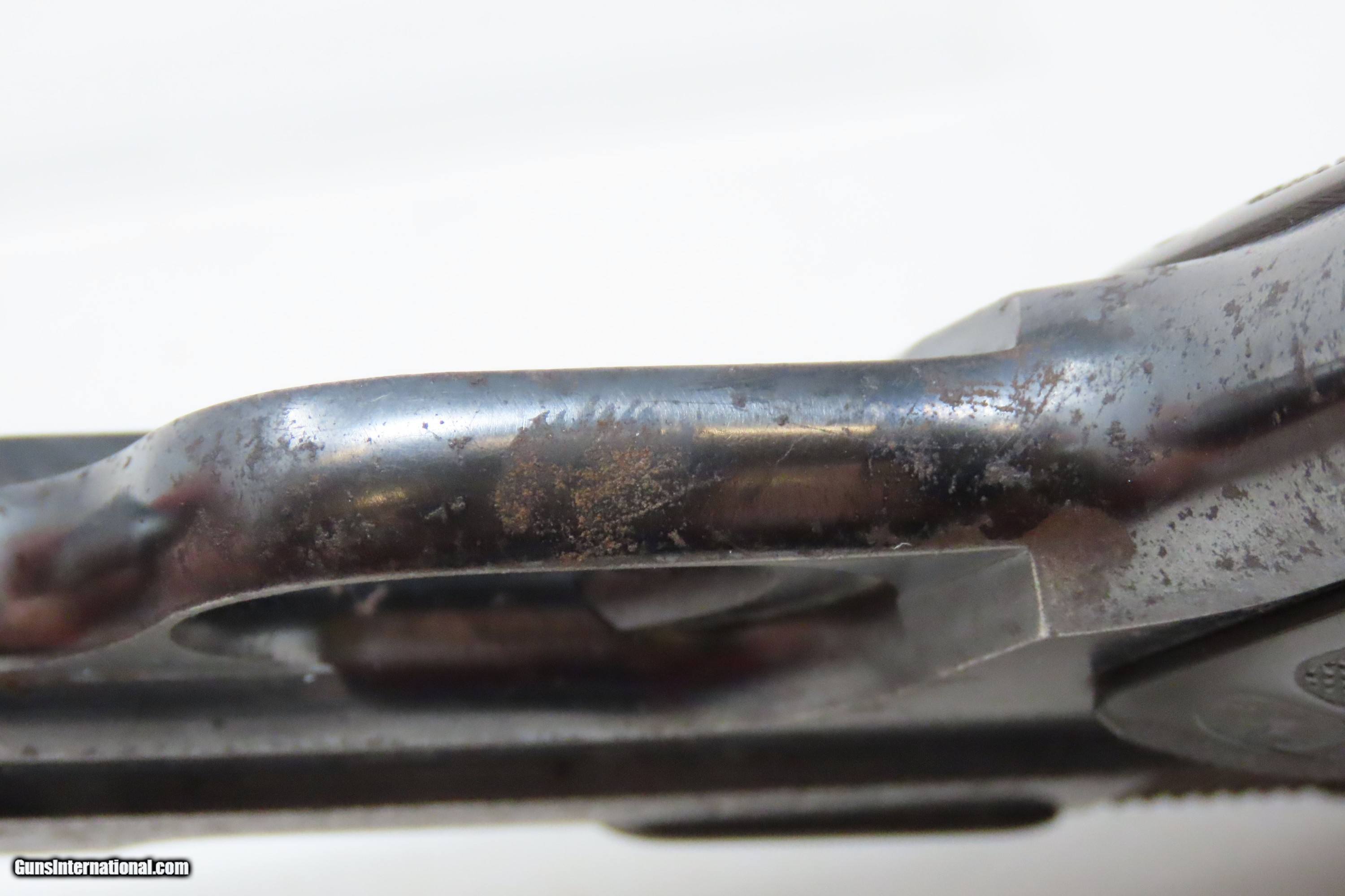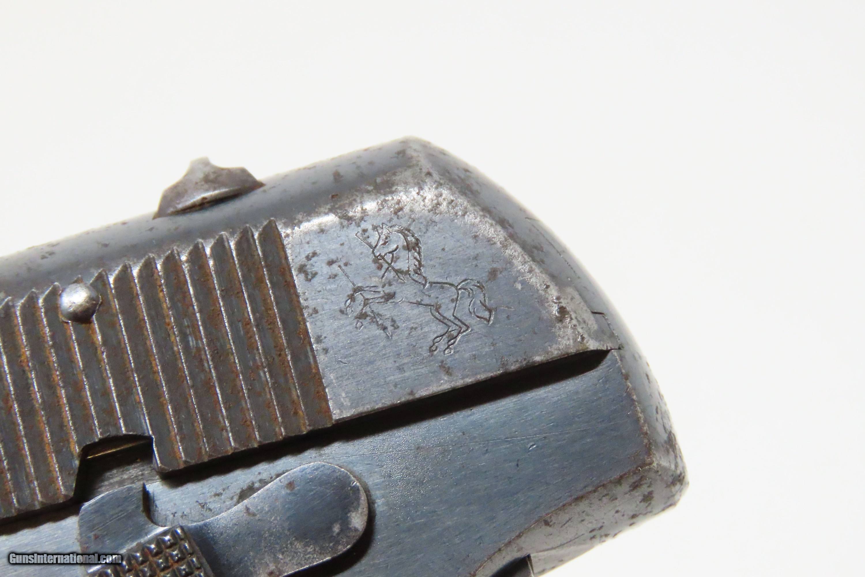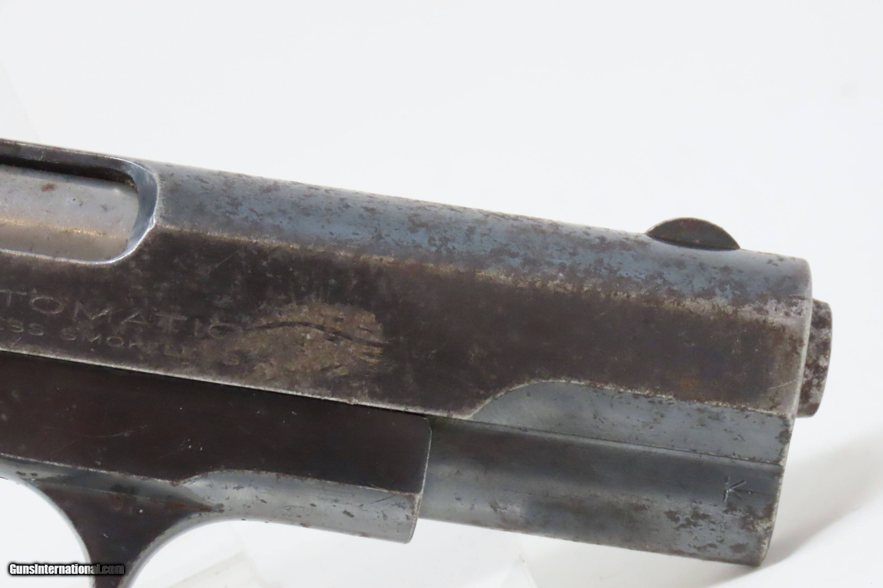 Description: SAN ANTONIO TEXAS Lettered COLT 1903 Pistol Roaring Twenties TX WW2 II C&R WORLD WAR II Captured “BRINGBACK” Here we present a C&R Colt Model 1903 Pocket Hammerless Pistol manufactured in Hartford, Connecticut in 1928. This one comes with a factory letter that states the shipment date as 26 October 1928 to Praeger Hardware Company in San Antonio, Texas. Oral tradition on this piece is that this was a capture bringback piece from World War II Germany and that it was taken from a German soldier with the last name of Praeger. The Colt Model 1903 Pocket Hammerless was a short-recoil, semi-automatic pistol, designed by the American arms designer John Moses Browning. The Colt Model 1903 Pocket Hammerless (not to be confused with the Colt Model 1903 Pocket Hammer) is a .32 ACP caliber, self-loading, semi-automatic pistol. Despite the title "hammerless", the Model 1903 does have a hammer. The hammer is covered and hidden from view under the rear of the slide. This allows the pistol to be carried in and withdrawn from a pocket quickly and smoothly without snagging. Approximately 570,000 Colt Pocket Hammerless pistols were produced from 1903 to 1945, in five different types. Some were issued to U.S. Army and U.S. Air Force general officers from World War II through the 1970s. The overall condition is very good. Original finish with a light scale. Excellent action. Bright, sharply rifled bore. Sharp markings. Good grips with an expected amount of handling. This firearm is classified as a Curio & Relic. Barrel is 3-3/4 inches. Caliber: .32 ACP Overall condition as seen in photos. Very Fast. Very Safe. FREE SHIPPING. Will need to be sent to your local FFL or C&R licensee. This firearm is classified as a Curio & Relic. Guaranteed AUTHENTIC & Includes CERTIFICATE OF AUTHENTICITY. ancestryguns $1800 #228359 SOLD Curio/Relic: Yes |
