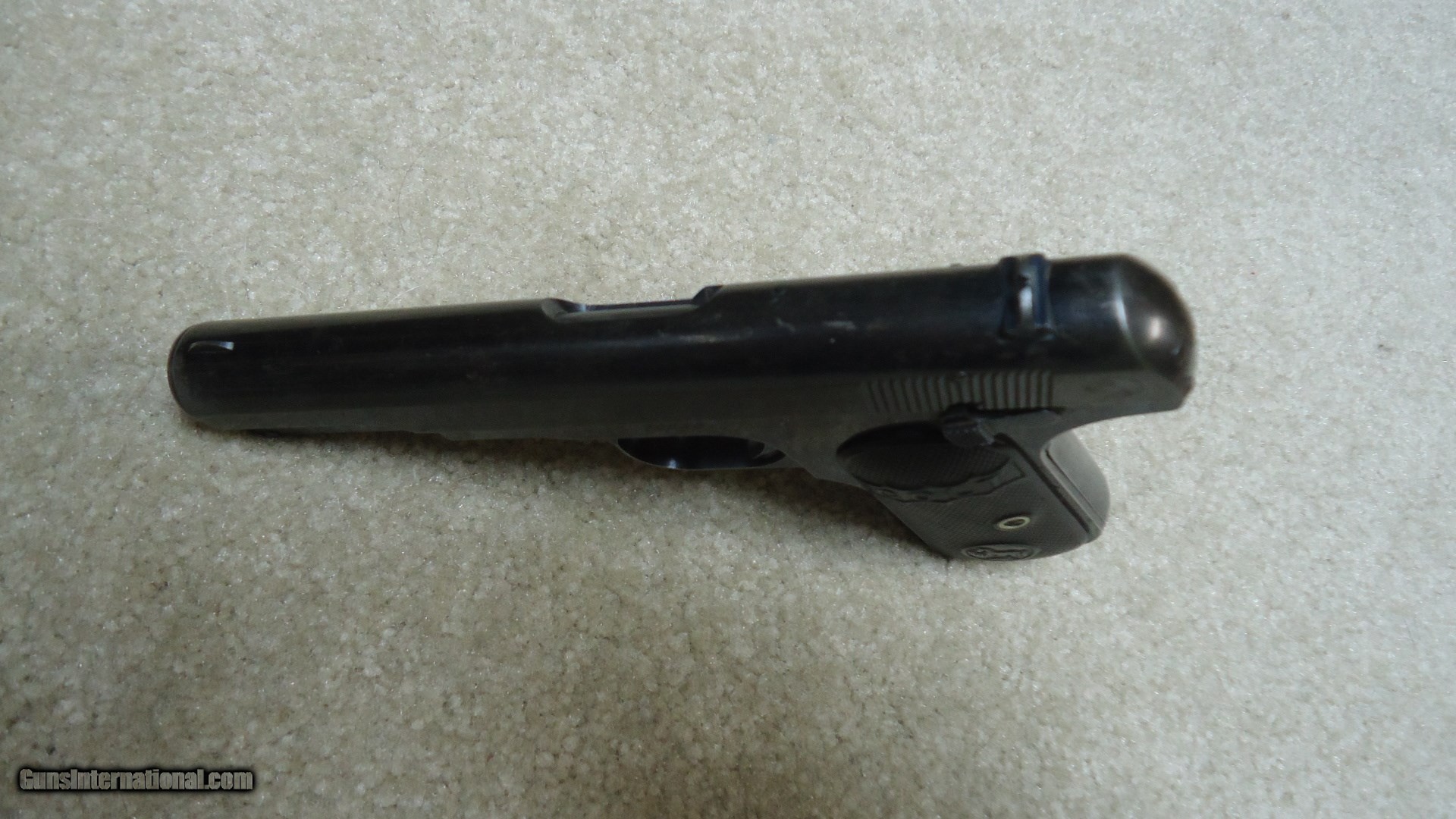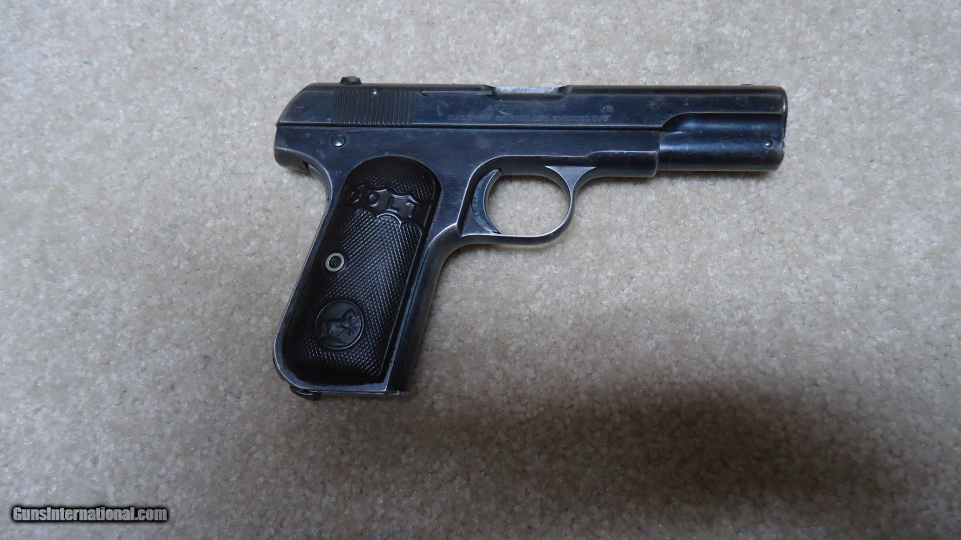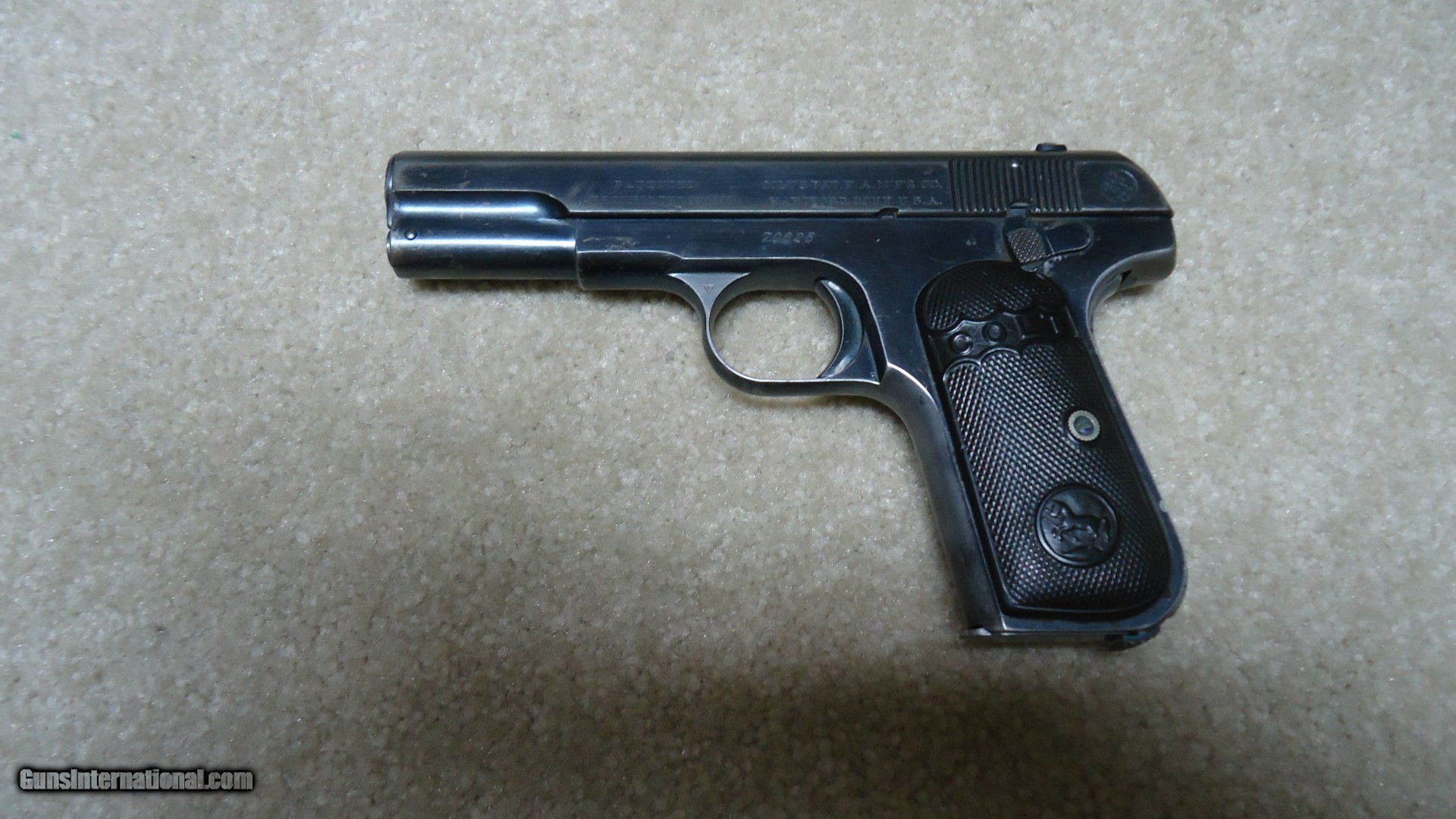 Description: VERY EARLY FIRST TYPE MODEL 1903 POCKET HAMMERLESS .32 ACP, #70XXX, MADE 1908. This is a really fine example of one of Colt’s earliest pocket autos. The First Type only ran from 1903-1908 and is easy to spot as only these early guns have 4” barrels (later ones have 3 ¾” barrels) with barrel bushings like on the Model 1911 .45 autos. This 111 year old Colt still retains fine even blue overall with normal light ageing, some edge wear and thinning/mixing heavily with gray on the grip straps. All markings are sharp and clear and it still retains the earliest style of hard rubber grips that are in excellent, un-chipped condition. Correct early unmarked magazine, sights have not been altered, nice fire blue remains on the safety lever and trigger sides, tight action, bright, exc. bore. Nice example of a very difficult early Colt auto to find. SOLD Curio/Relic: Yes Manufacturer: COLT Model: 1903 POCKET HAMMERLESS Serial Number: 70XXX Caliber Info: .32 ACP Condition: FINE+ Barrels: 4 Finish: BLUE |