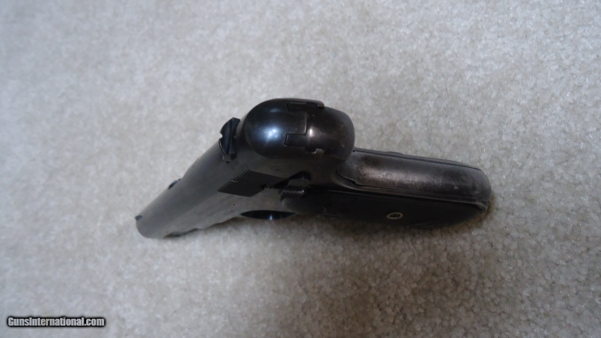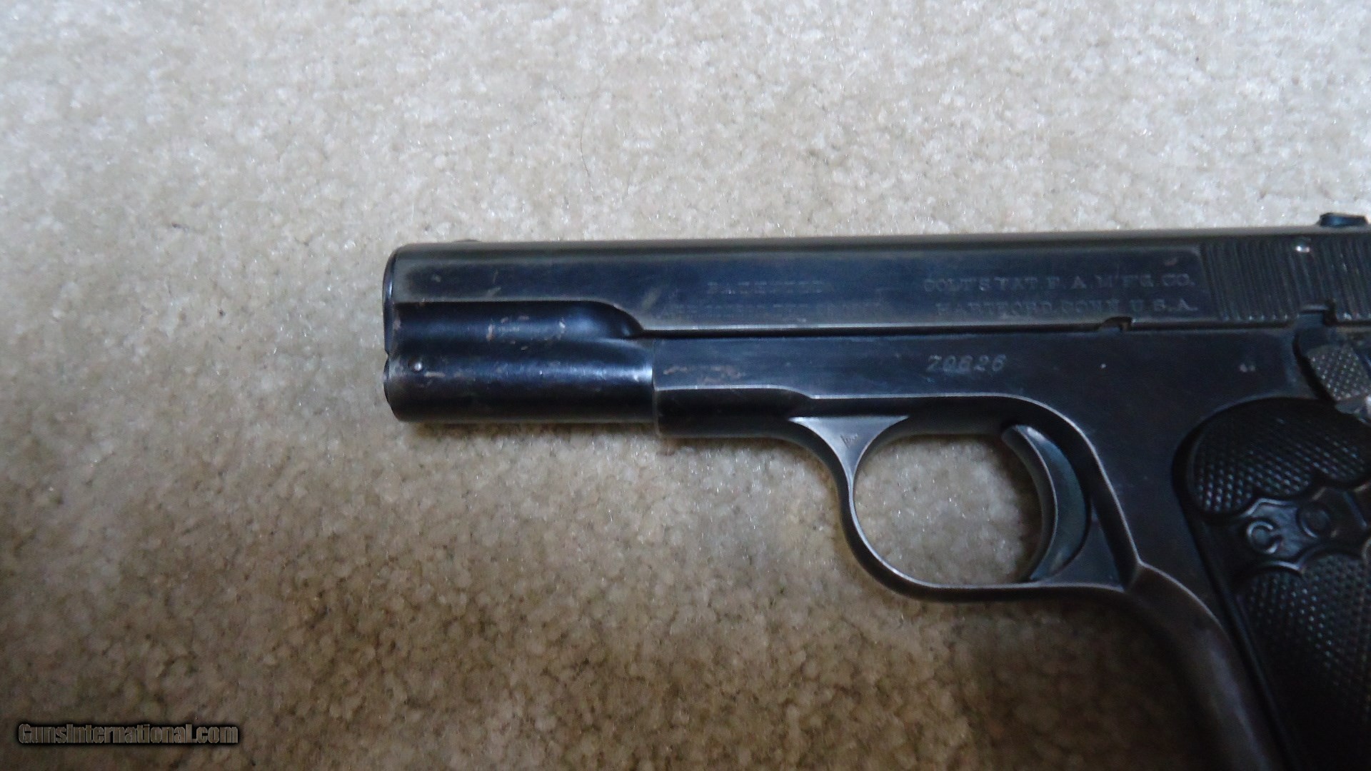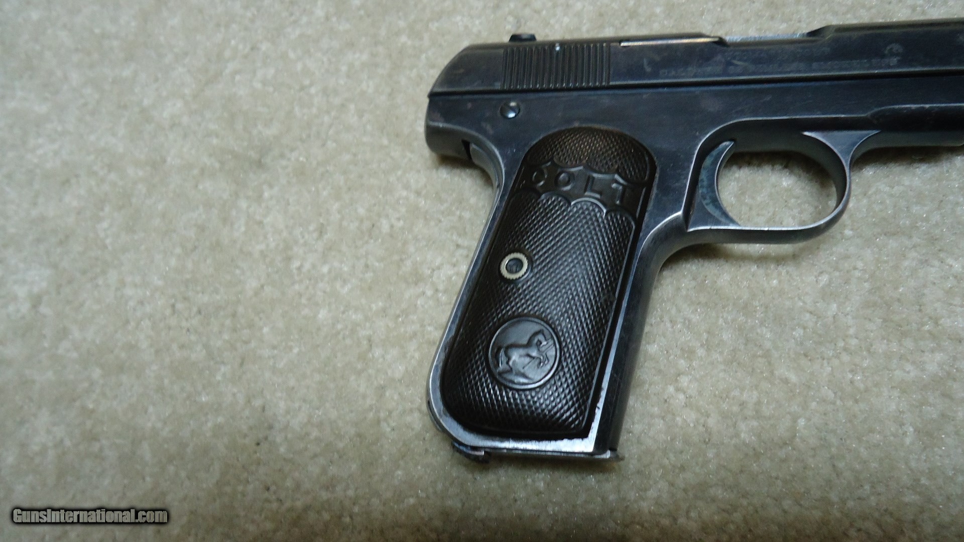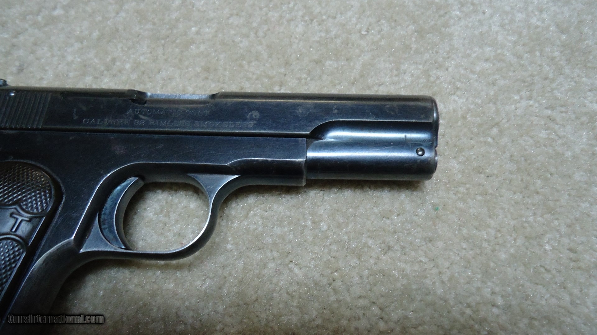 Description: VERY EARLY FIRST TYPE MODEL 1903 POCKET HAMMERLESS .32 ACP, #70XXX, MADE 1908. This is a really fine example of one of Colt’s earliest pocket autos. The First Type only ran from 1903-1908 and is easy to spot as only these early guns have 4” barrels (later ones have 3 ¾” barrels) with barrel bushings like on the Model 1911 .45 autos. This 111 year old Colt still retains fine even blue overall with normal light ageing, some edge wear and thinning/mixing heavily with gray on the grip straps. All markings are sharp and clear and it still retains the earliest style of hard rubber grips that are in excellent, un-chipped condition. Correct early unmarked magazine, sights have not been altered, nice fire blue remains on the safety lever and trigger sides, tight action, bright, exc. bore. Nice example of a very difficult early Colt auto to find. SOLD Curio/Relic: Yes Manufacturer: COLT Model: 1903 POCKET HAMMERLESS Serial Number: 70XXX Caliber Info: .32 ACP Condition: FINE+ Barrels: 4 Finish: BLUE |
