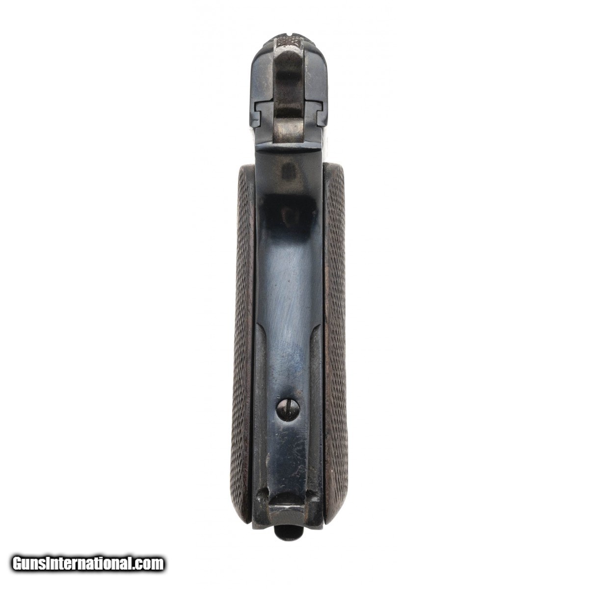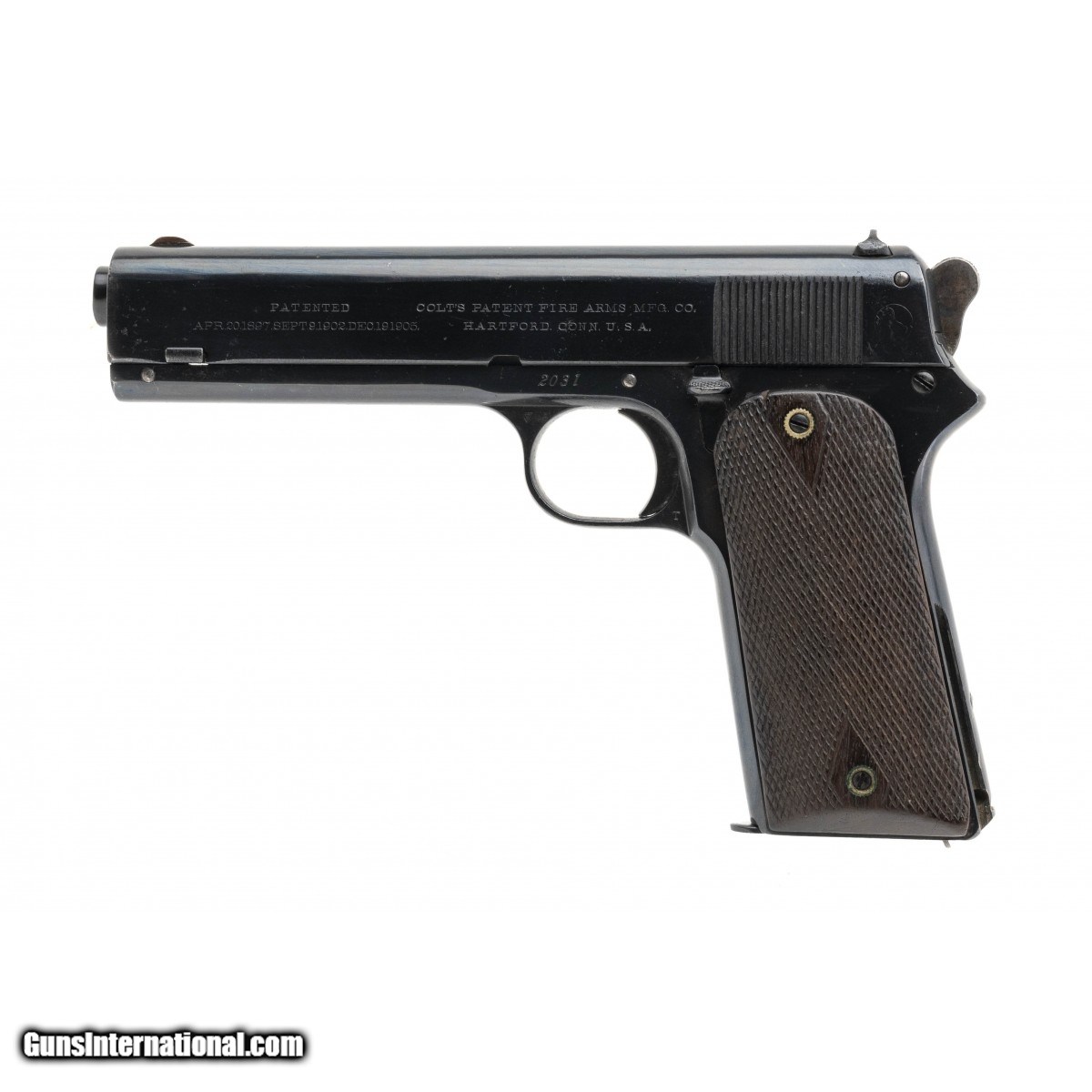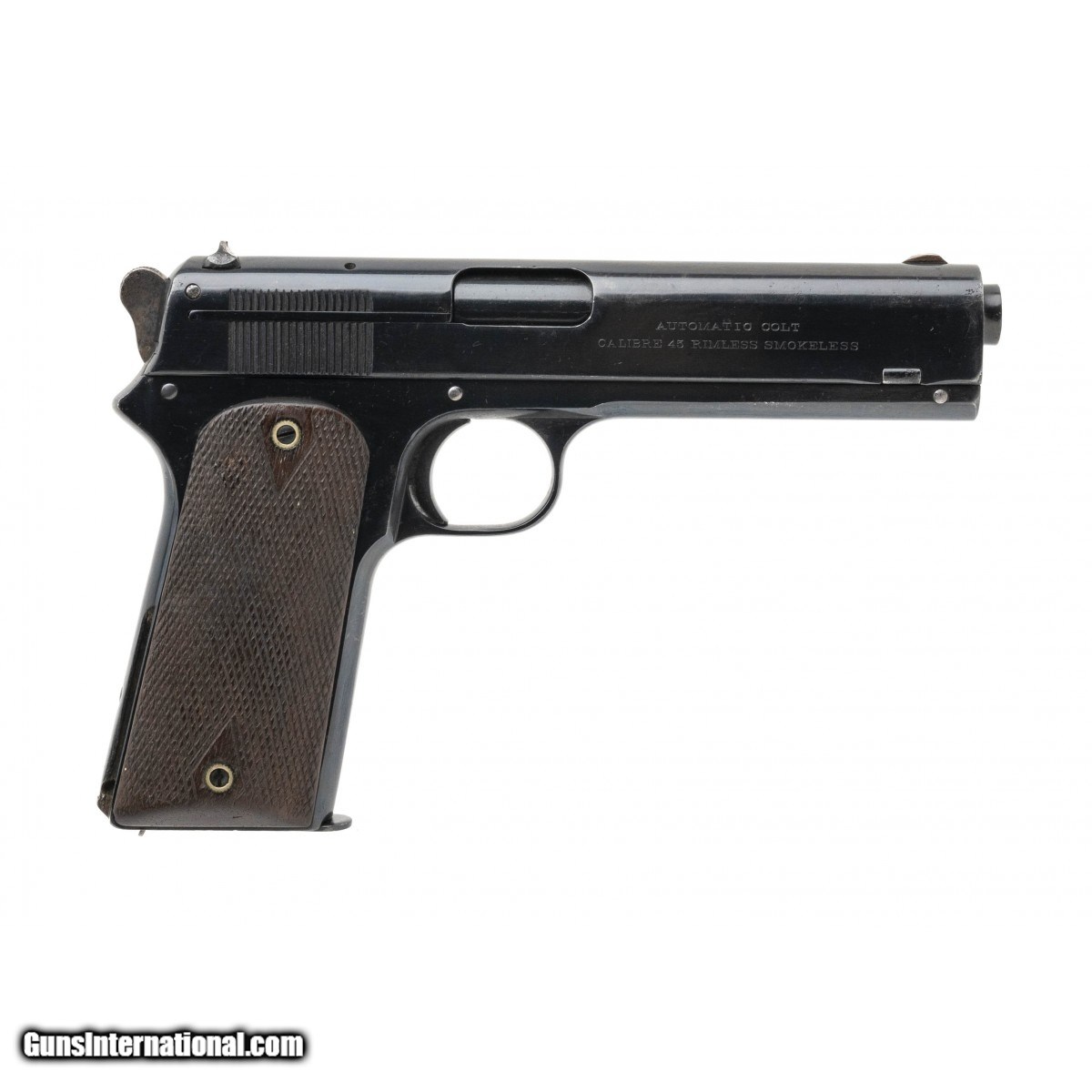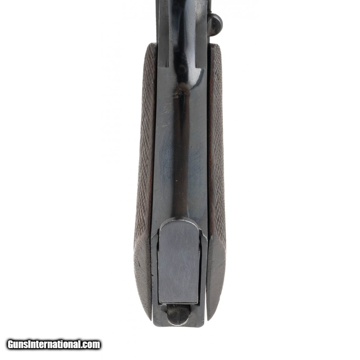 Description: " Serial number 2031. Made in 1907. 45 ACP caliber with a 5" barrel. This is a rare variation that is cut for stock. There is approximately 95% of a period refinish. This is a scarce variation as it is cut for stock. The magazine is a reproduction. SOLD Curio/Relic: Yes |
