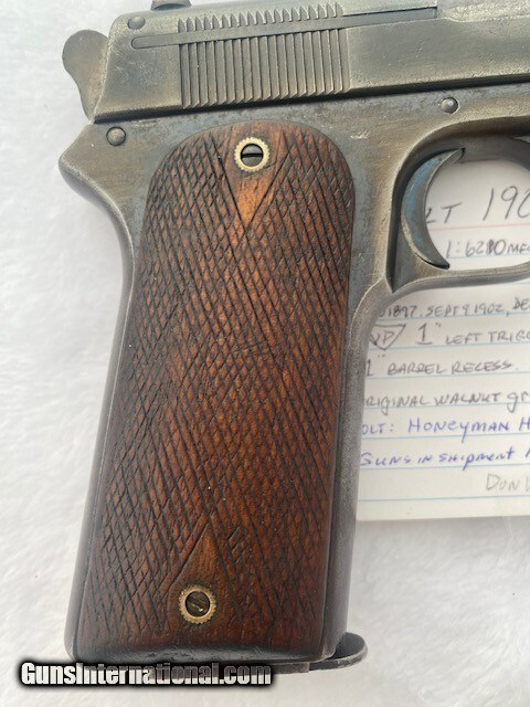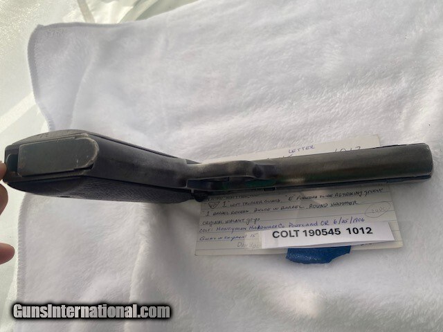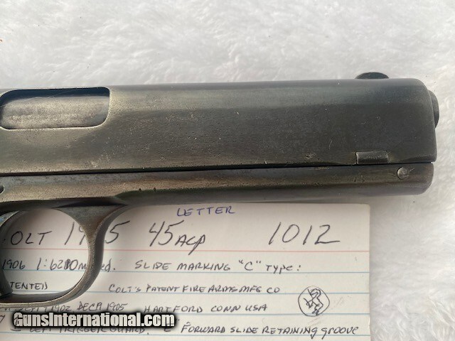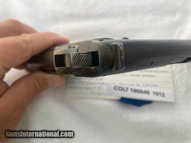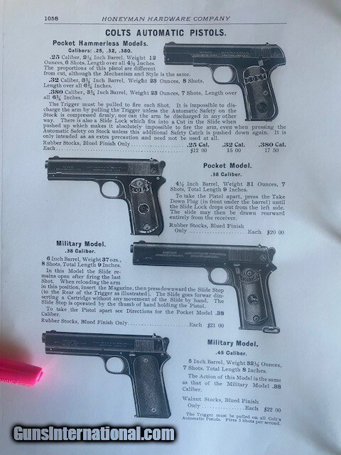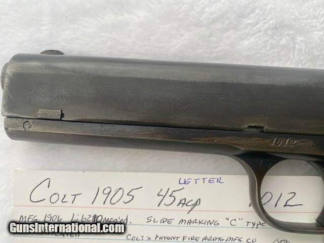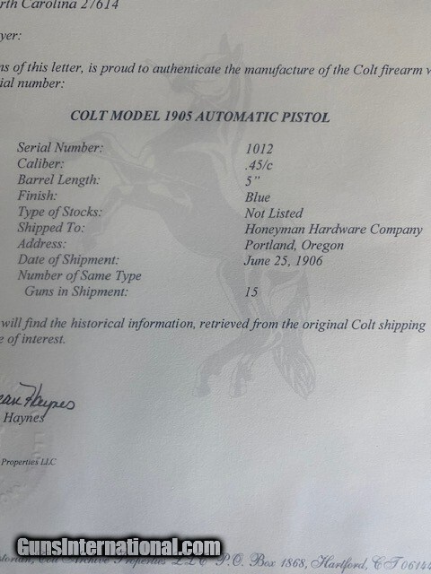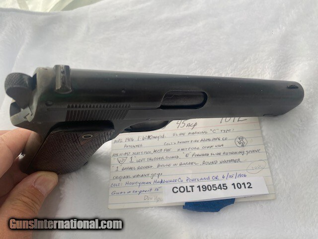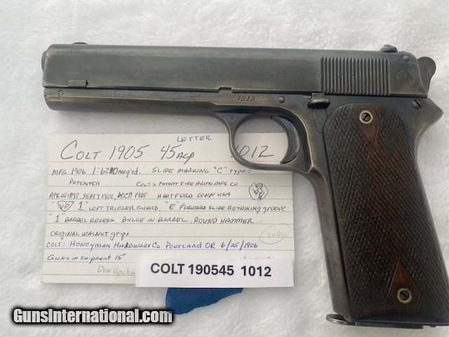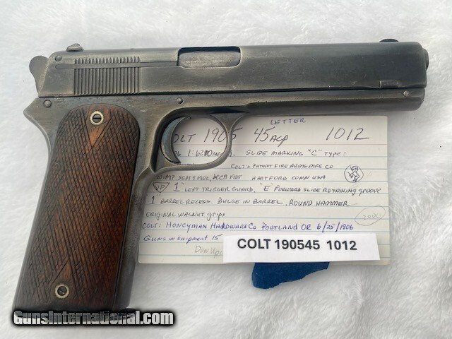 Description: COLT 1905 45 acp SN # 1012 MFG'd 1906 One of only 6210 total, The first 45 auto With Colt Archive letter: Honeyman Hardware, Portland, OR shipped 6/25/1906 and includes a historic Honeyman Hardware Colt advertisement Original walnut grips. Round hammer Markings: PATENTED COLTS PATENT FIRE ARMS MFG CO (circled rampant Colt) Apr 20, 1897 Sept 9, 1902 DEC 19, 1905 HARTFORD CONN USA VP 1 E $2300 Shipping is $25 to your FFL or C&R if legal in your jurisdiction from my C&R. I follow all laws. See my other early Colt autos listed. SOLD Curio/Relic: Yes Handgun Caliber: .45 ACP (.45 Auto) Manufacturer: COLT Model: 1905 Serial Number: 1012 Barrel Length: 5 Condition: good Metal Condition: good Wood Condition: good Bore Condition: good Finish: blue |