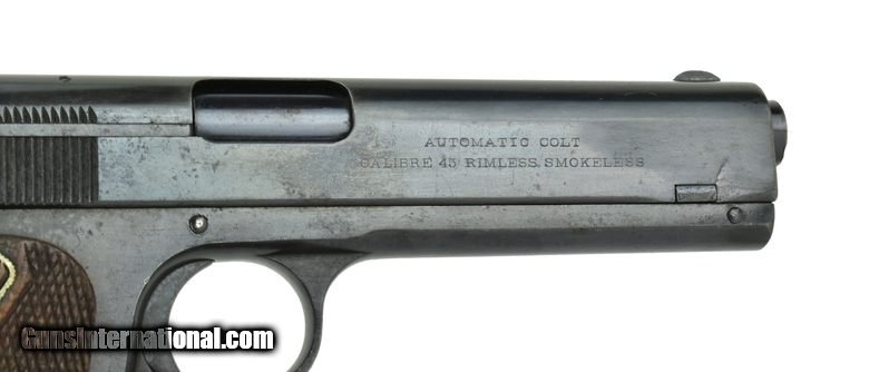 Colt 1905 .45 Auto caliber pistol. Factory fitted for detachable shoulder stock (stock not included). Bore is very good. Action works perfectly. Gun has approximately 92-93% blue. Grips are very good with minor wear. Rare cut for stock Colt. Comes with factory letter that verifies the stock. Shipped to Pacific Hardware and Steel Company in 1906. Neat serial number 1234.